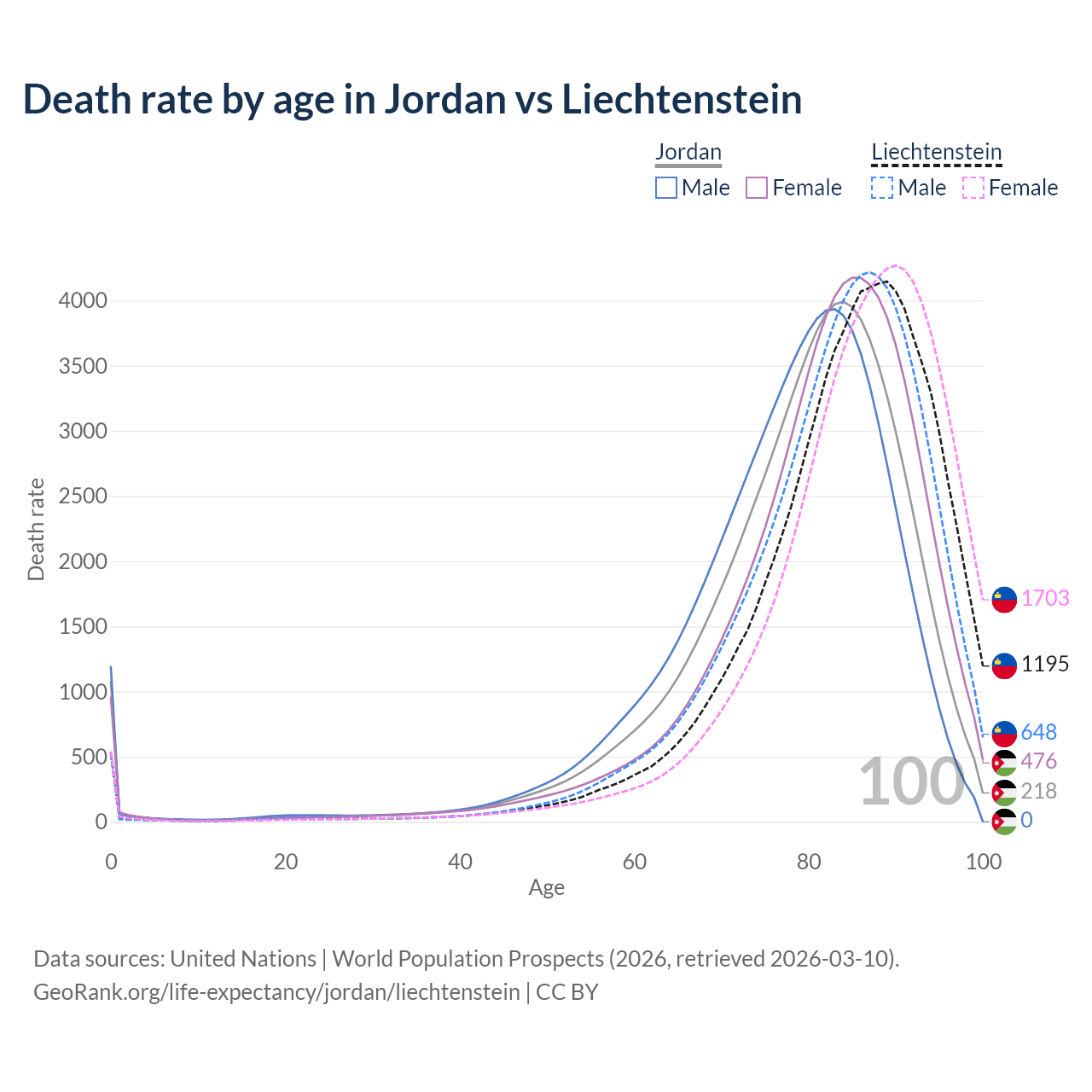 In Jordan, the most common age of death is 84, compared to 89 in Liechtenstein. The median age of death is 81.3 in Jordan and 86.3 in Liechtenstein, meaning only half of each cohort is expected to live past that age.