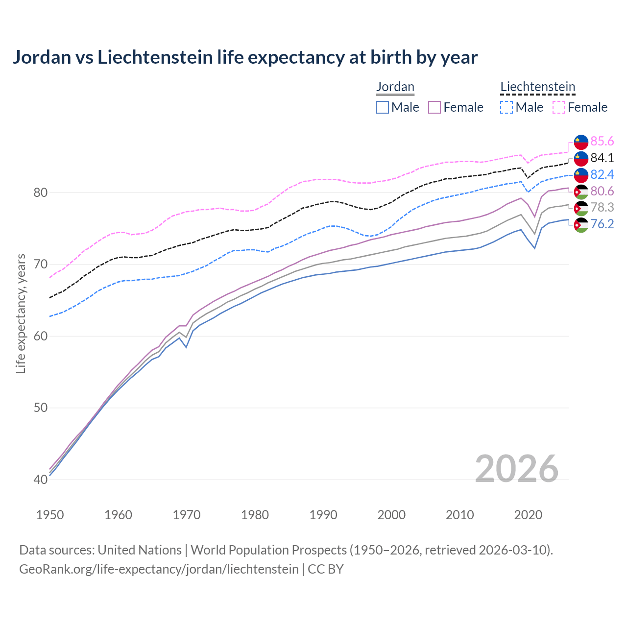 The average life expectancy at birth is 78.3 years in Jordan vs 84.1 in Liechtenstein. Jordan is ranked 58/197 by life expectancy, and Liechtenstein is 11/197. In Jordan, the life expectancy is 76.2 years for males and 80.6 years for females. In Liechtenstein, it's 82.4 years for males and 85.6 years for females.
