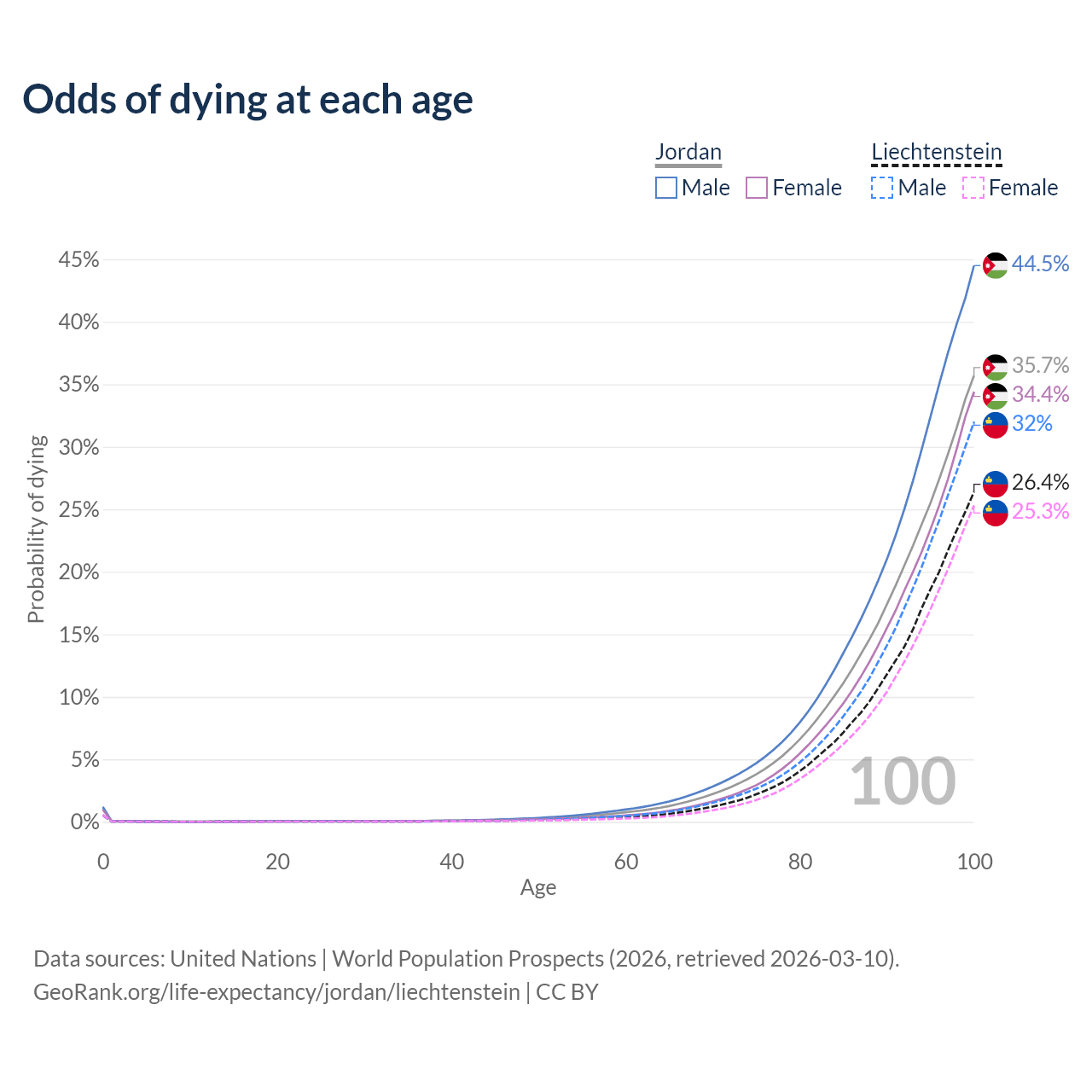 This life expectancy calculator shows the odds of living to 100, 95, 90, and below based on current age for both males and females in Jordan and Liechtenstein, along with mean and median age of death. The calculations are based on the 2026 life tables (actuarial tables) from the UN World Population Prospects.