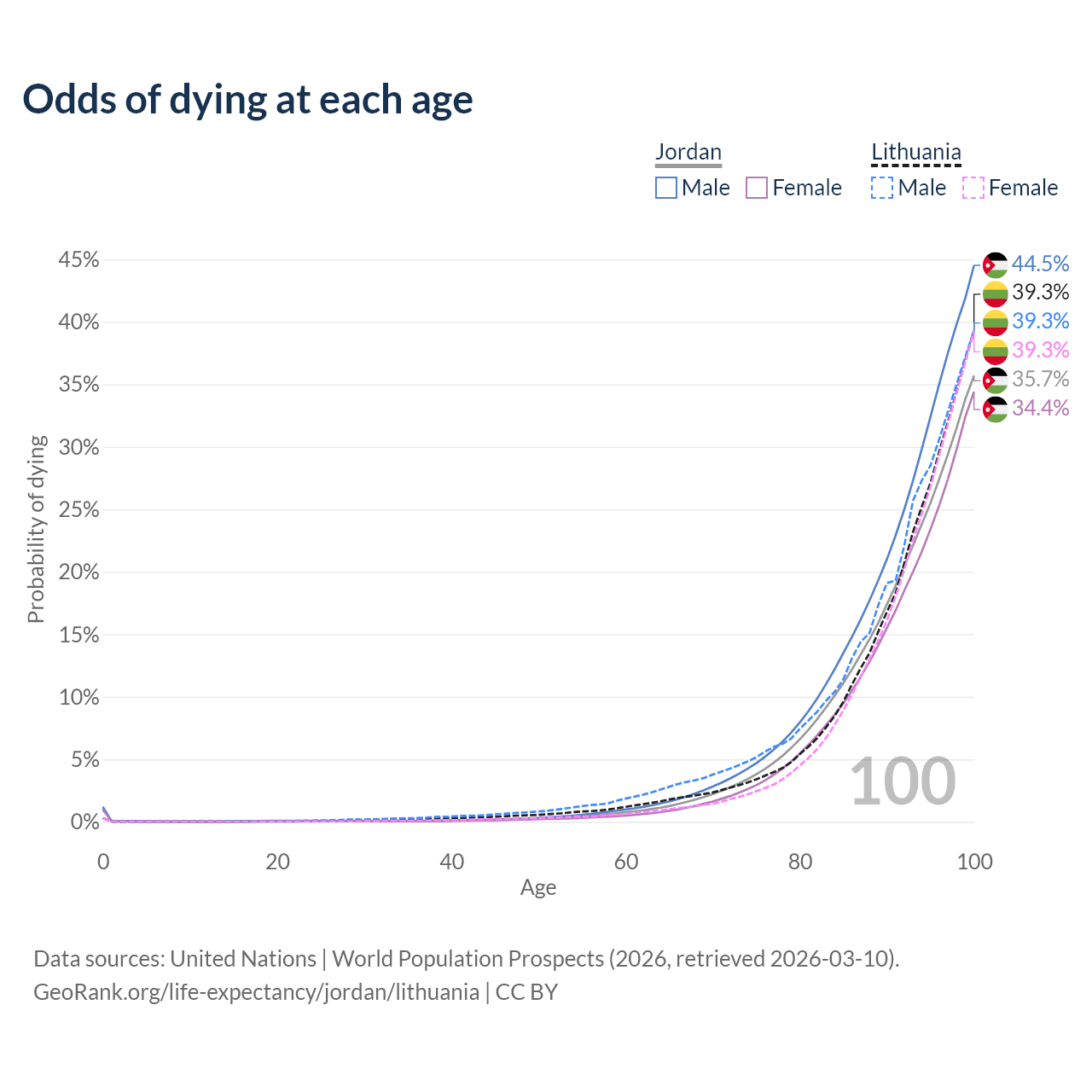 This life expectancy calculator shows the odds of living to 100, 95, 90, and below based on current age for both males and females in Jordan and Lithuania, along with mean and median age of death. The calculations are based on the 2026 life tables (actuarial tables) from the UN World Population Prospects.
