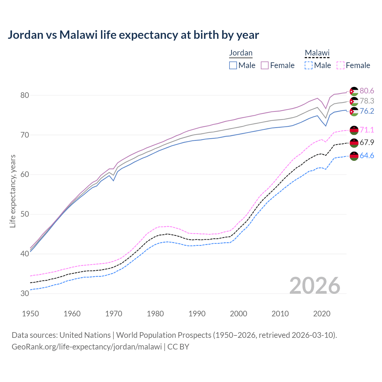 The average life expectancy at birth is 78.3 years in Jordan vs 67.9 in Malawi. Jordan is ranked 58/197 by life expectancy, and Malawi is 152/197. In Jordan, the life expectancy is 76.2 years for males and 80.6 years for females. In Malawi, it's 64.6 years for males and 71.1 years for females.