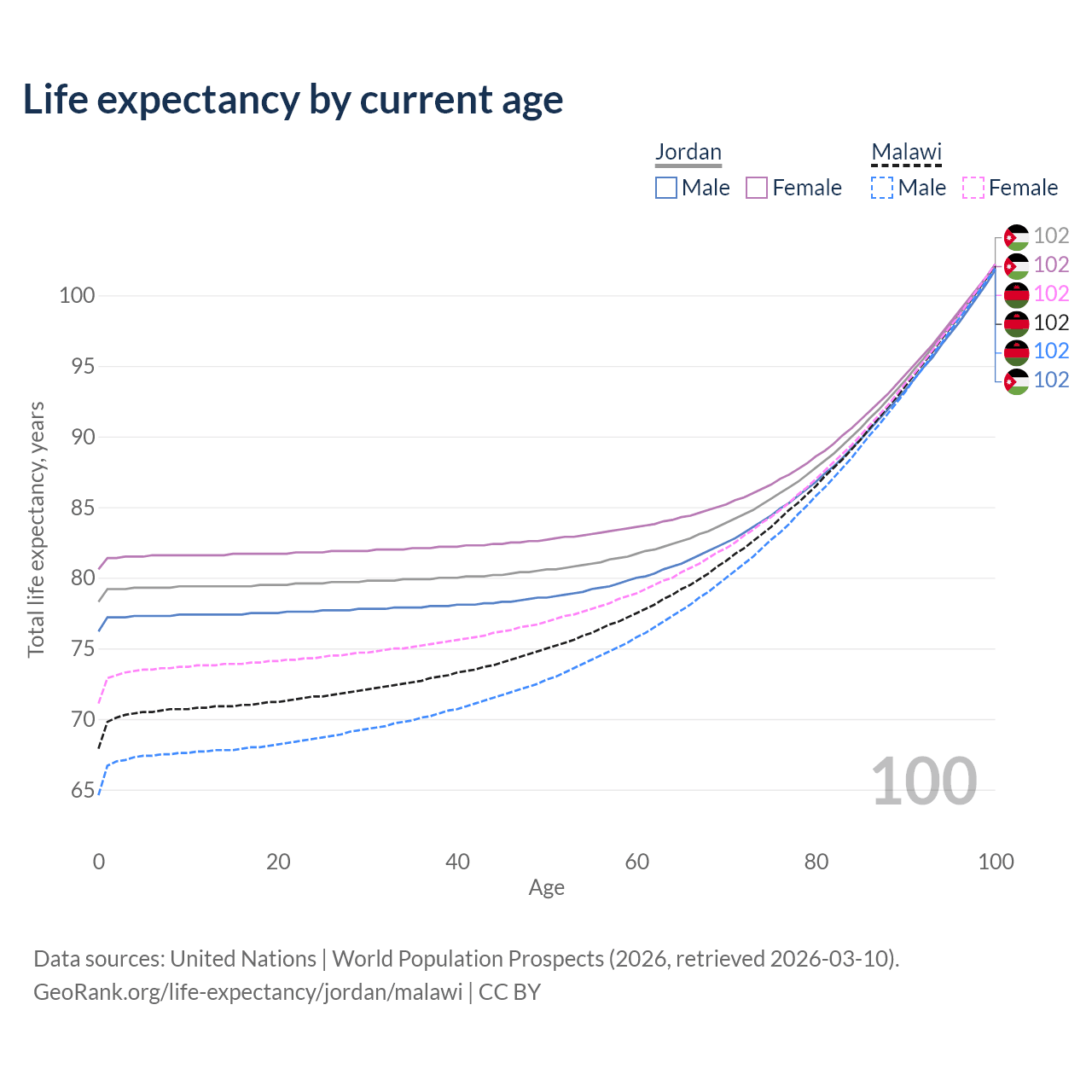 This life expectancy calculator shows the odds of living to 100, 95, 90, and below based on current age for both males and females in Jordan and Malawi, along with mean and median age of death. The calculations are based on the 2026 life tables (actuarial tables) from the UN World Population Prospects.