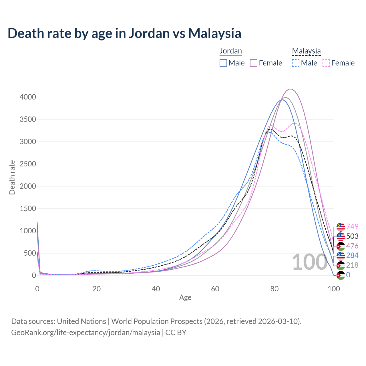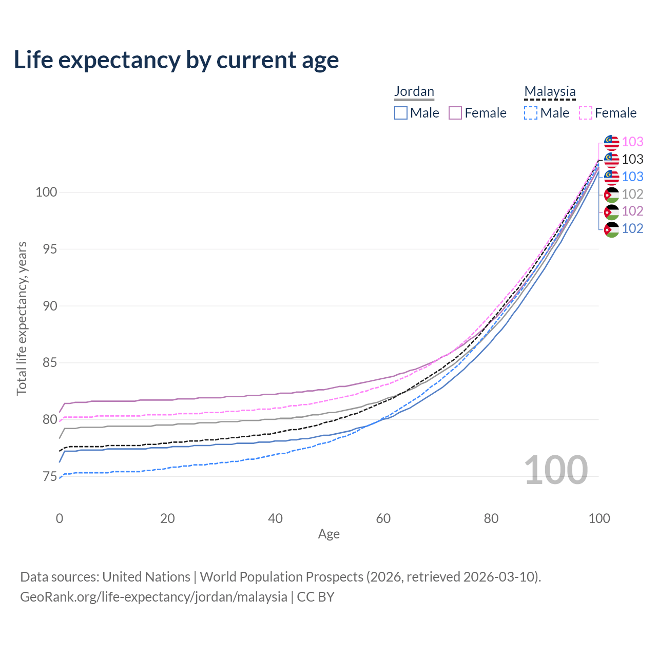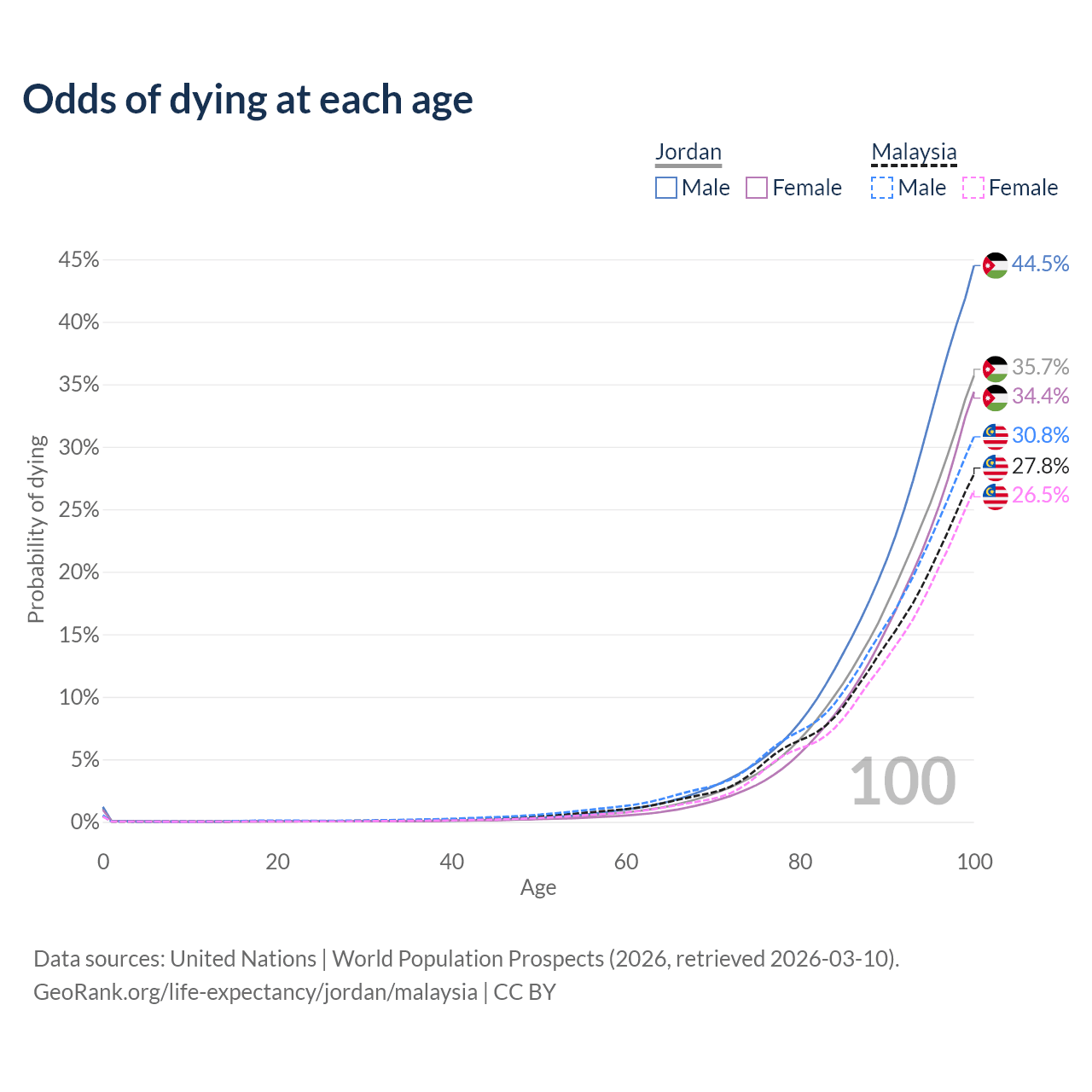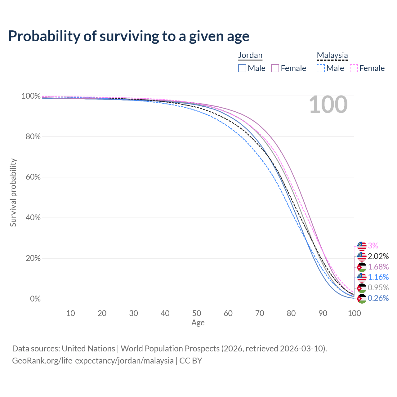 This life expectancy calculator shows the odds of living to 100, 95, 90, and below based on current age for both males and females in Jordan and Malaysia, along with mean and median age of death. The calculations are based on the 2026 life tables (actuarial tables) from the UN World Population Prospects.