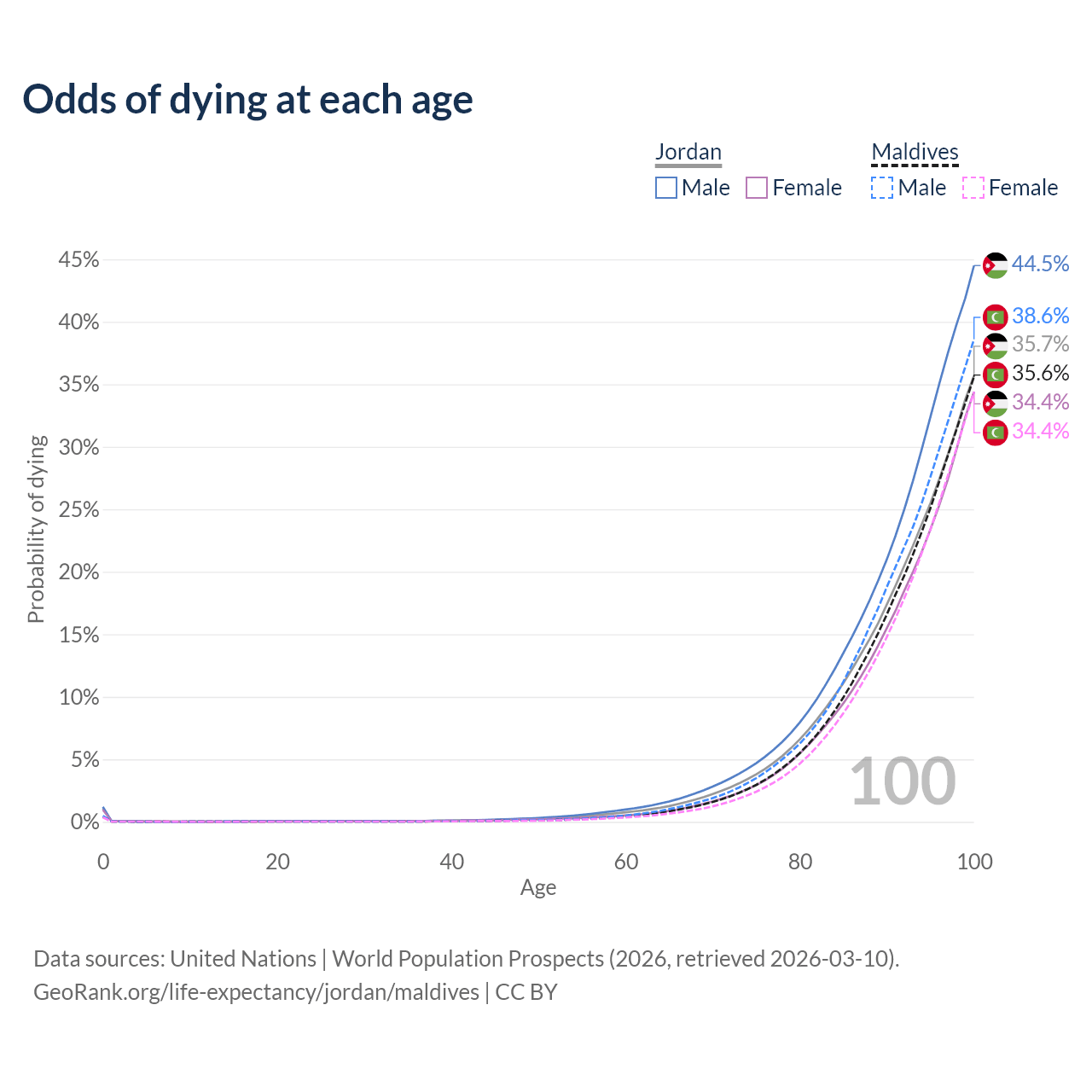 This life expectancy calculator shows the odds of living to 100, 95, 90, and below based on current age for both males and females in Jordan and Maldives, along with mean and median age of death. The calculations are based on the 2026 life tables (actuarial tables) from the UN World Population Prospects.