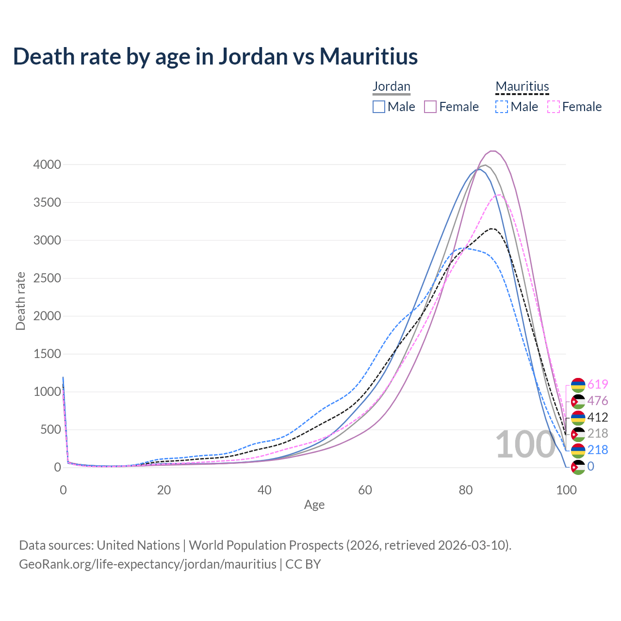 This life expectancy calculator shows the odds of living to 100, 95, 90, and below based on current age for both males and females in Jordan and Mauritius, along with mean and median age of death. The calculations are based on the 2026 life tables (actuarial tables) from the UN World Population Prospects.