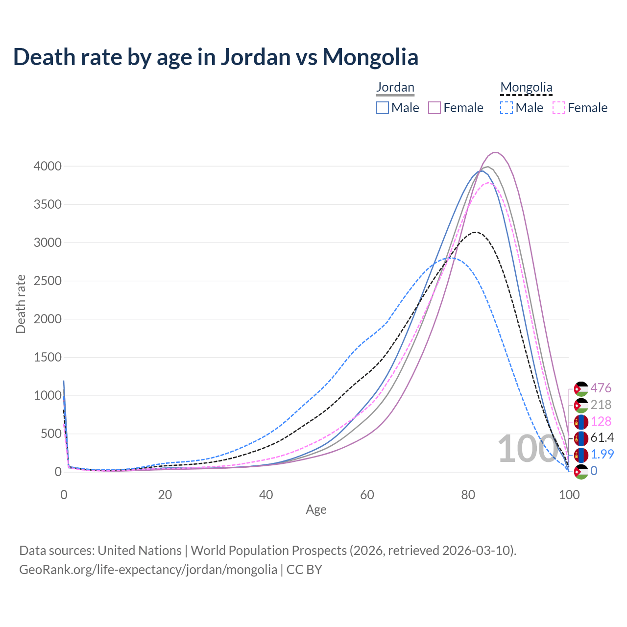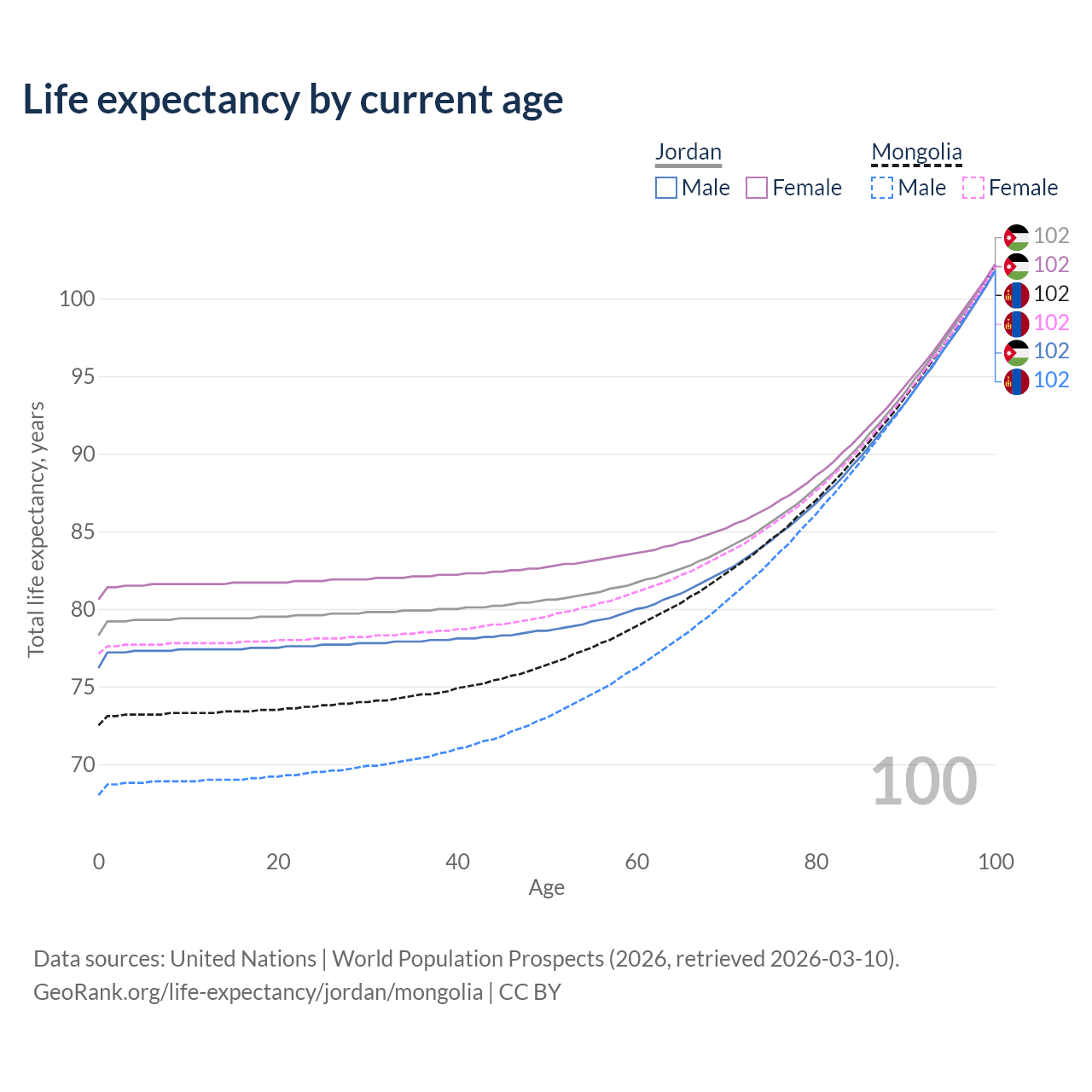 This life expectancy calculator shows the odds of living to 100, 95, 90, and below based on current age for both males and females in Jordan and Mongolia, along with mean and median age of death. The calculations are based on the 2026 life tables (actuarial tables) from the UN World Population Prospects.