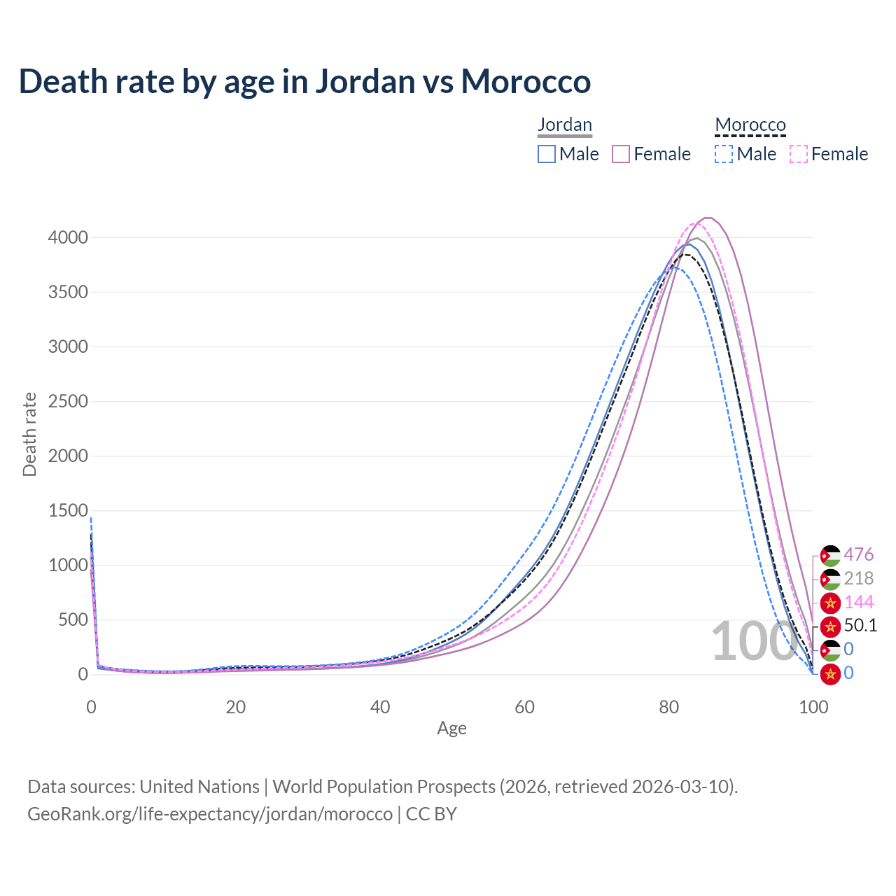 This life expectancy calculator shows the odds of living to 100, 95, 90, and below based on current age for both males and females in Jordan and Morocco, along with mean and median age of death. The calculations are based on the 2026 life tables (actuarial tables) from the UN World Population Prospects.