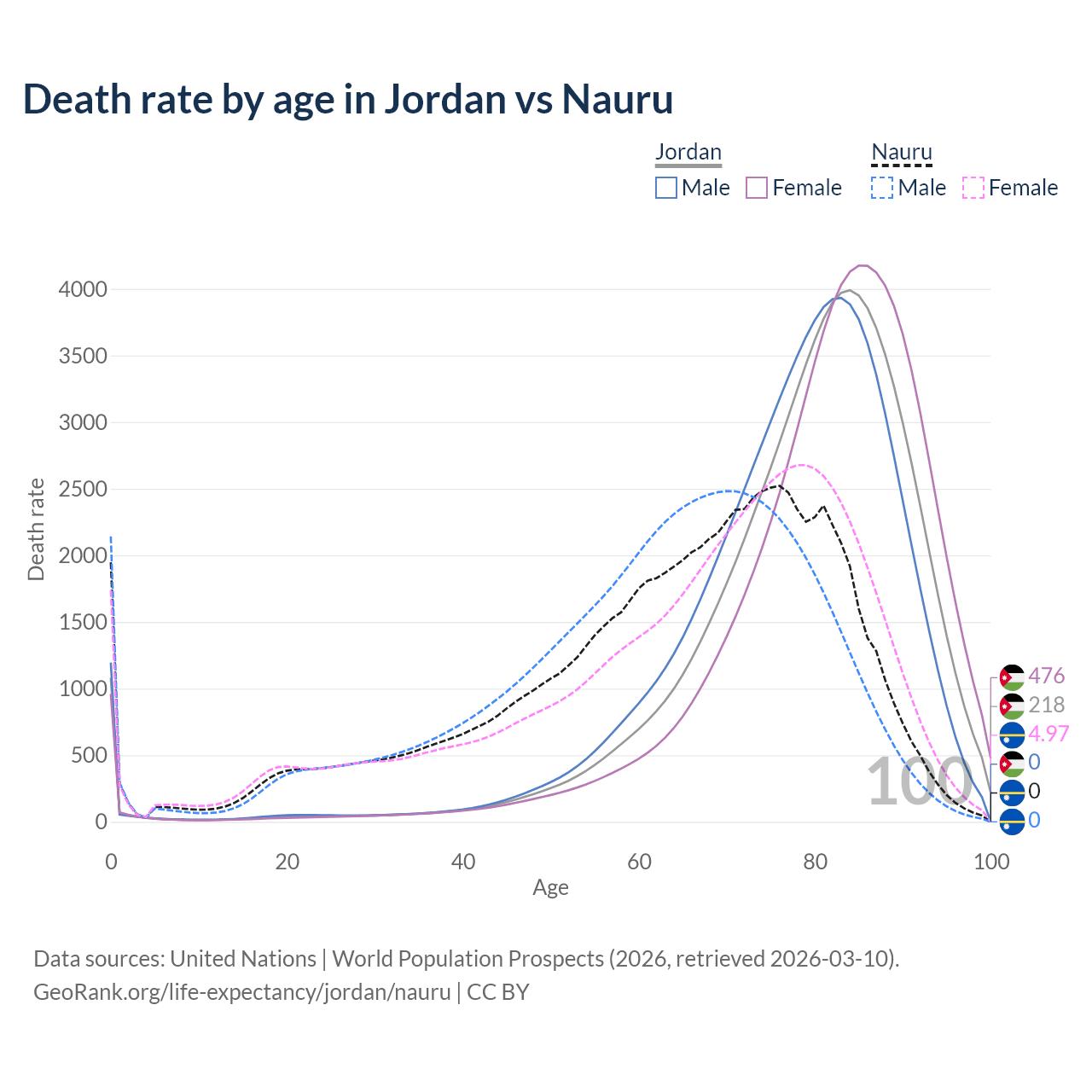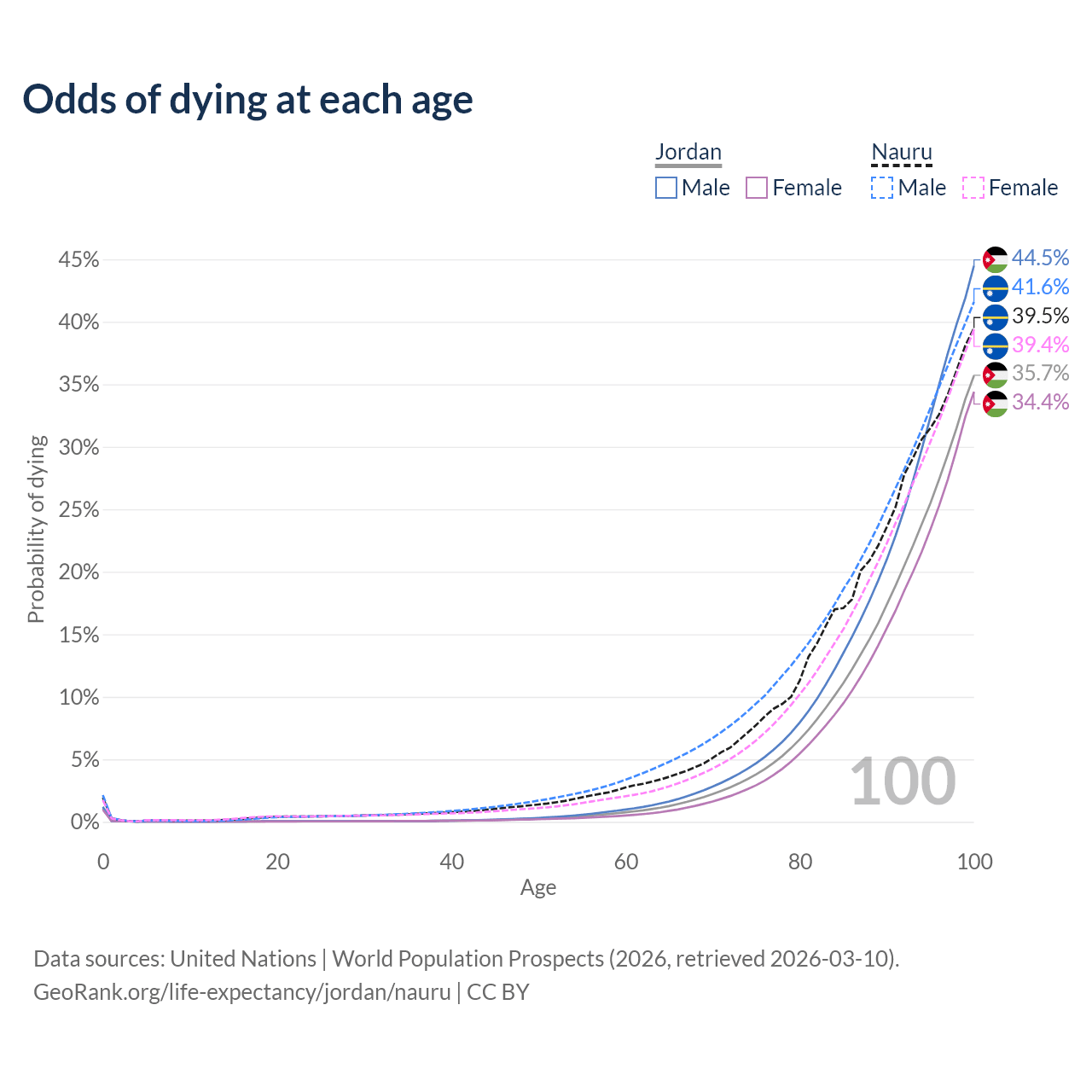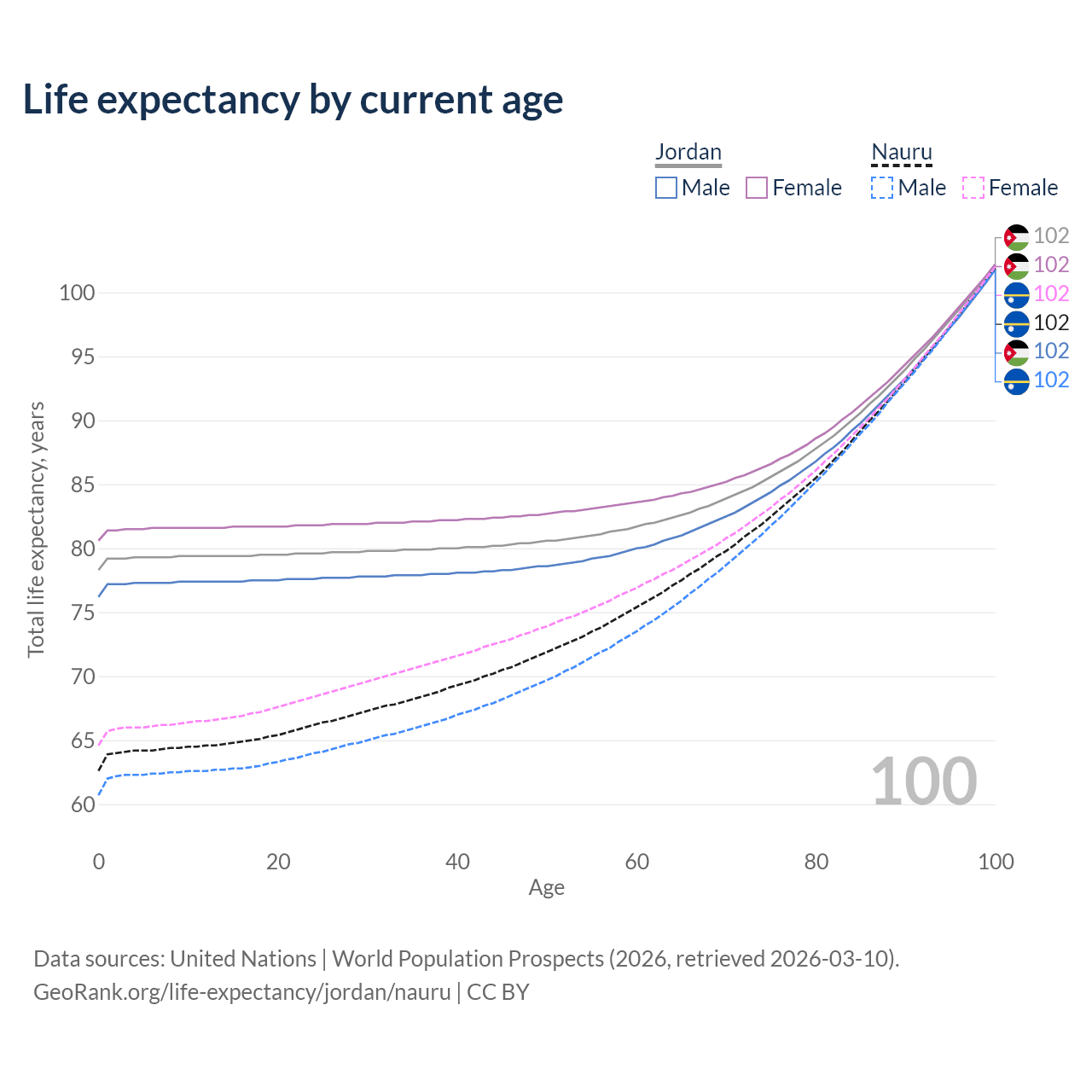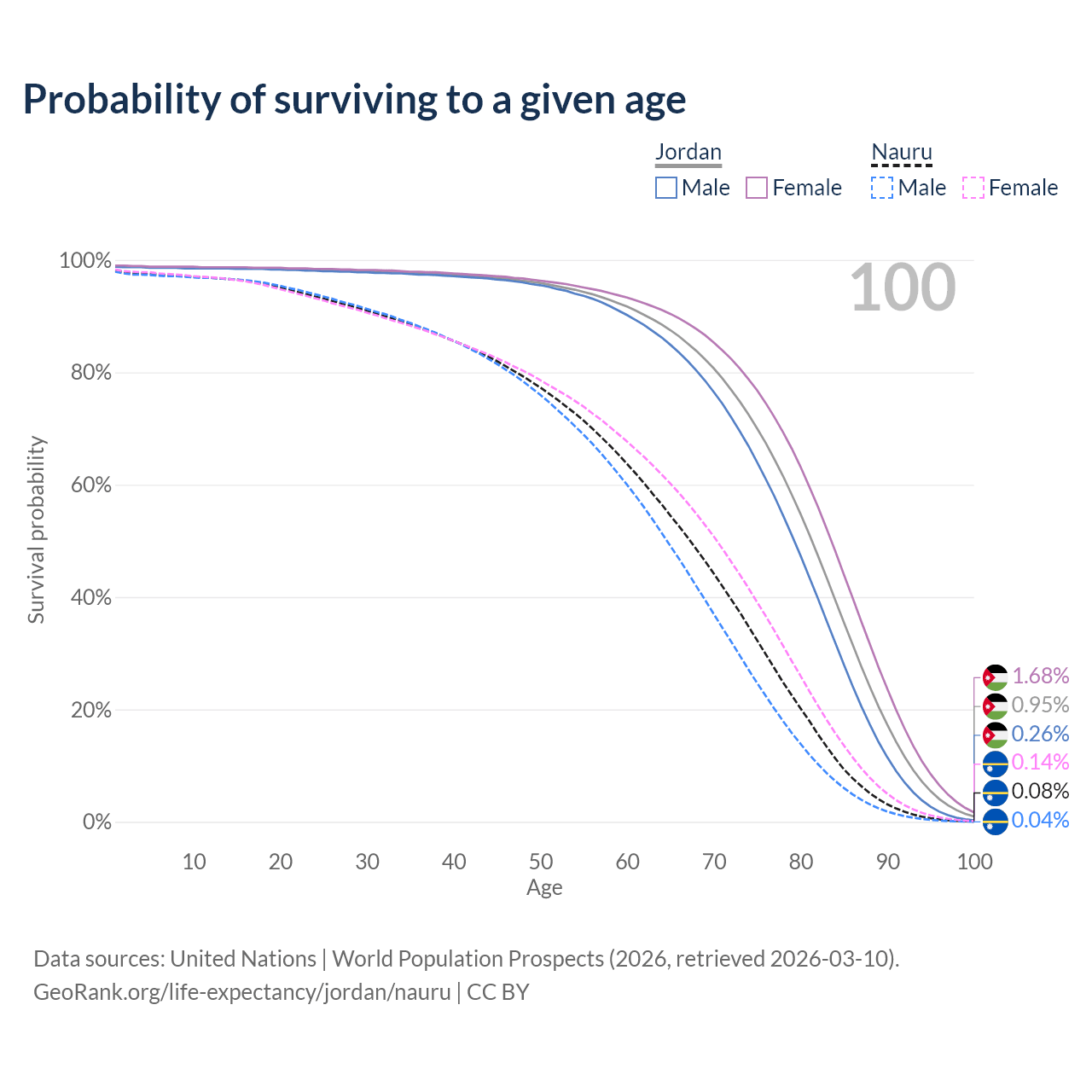 This life expectancy calculator shows the odds of living to 100, 95, 90, and below based on current age for both males and females in Jordan and Nauru, along with mean and median age of death. The calculations are based on the 2026 life tables (actuarial tables) from the UN World Population Prospects.