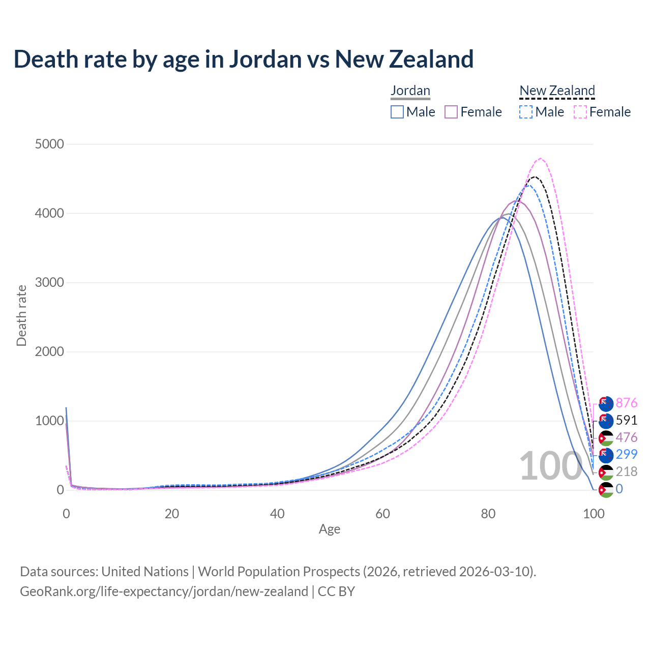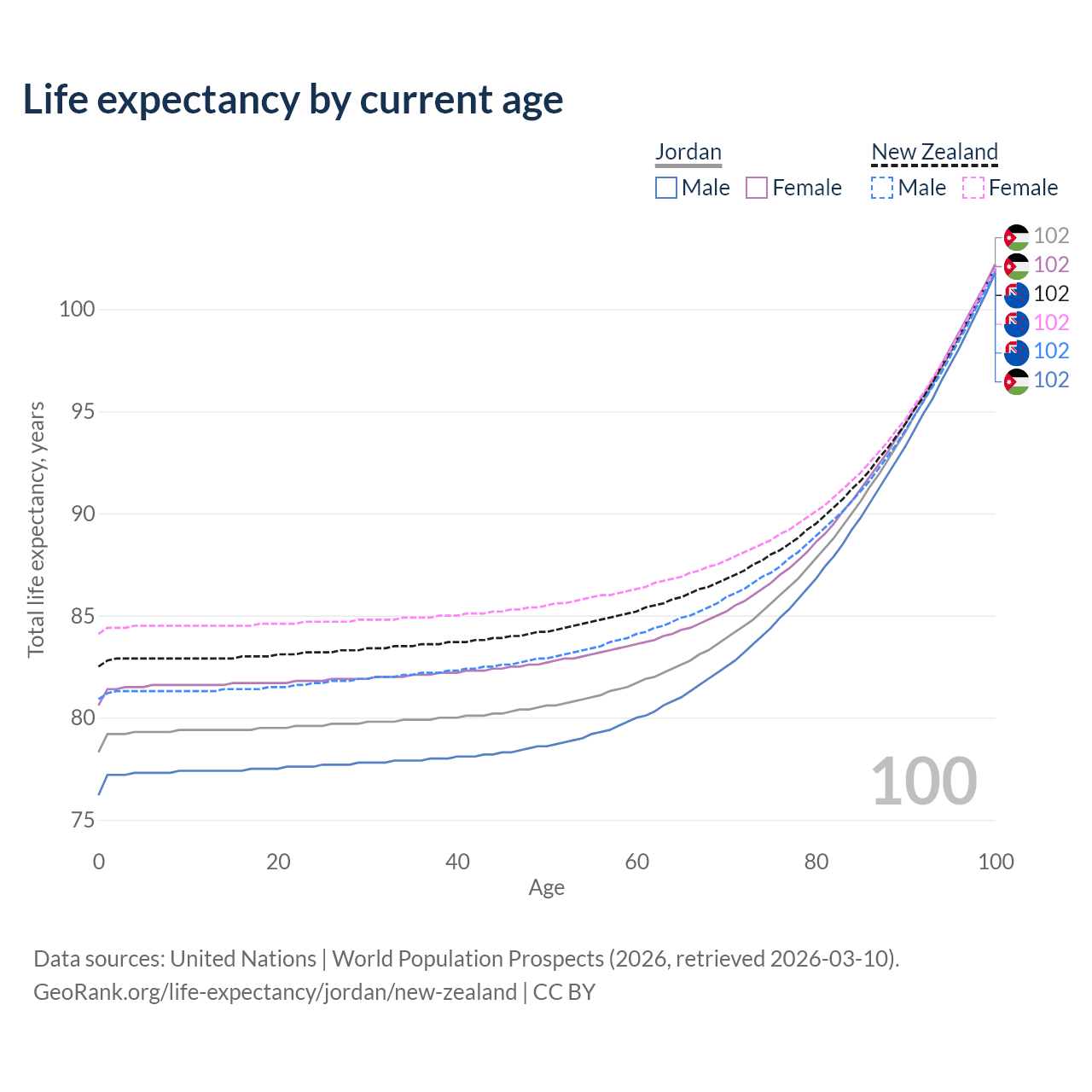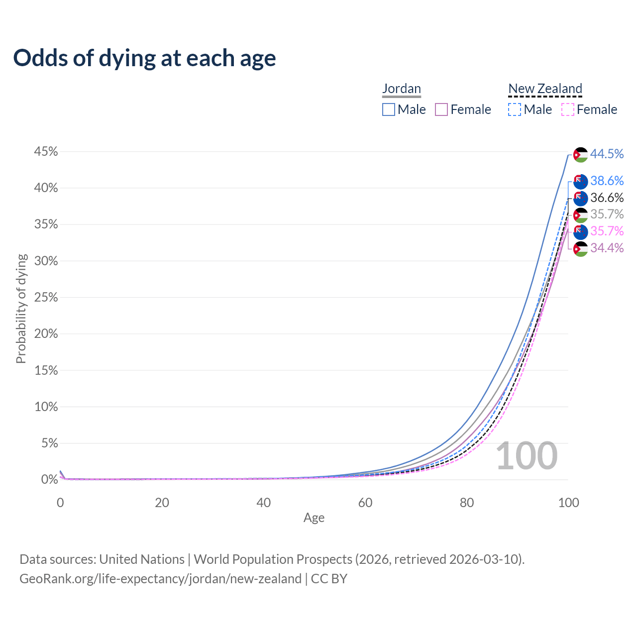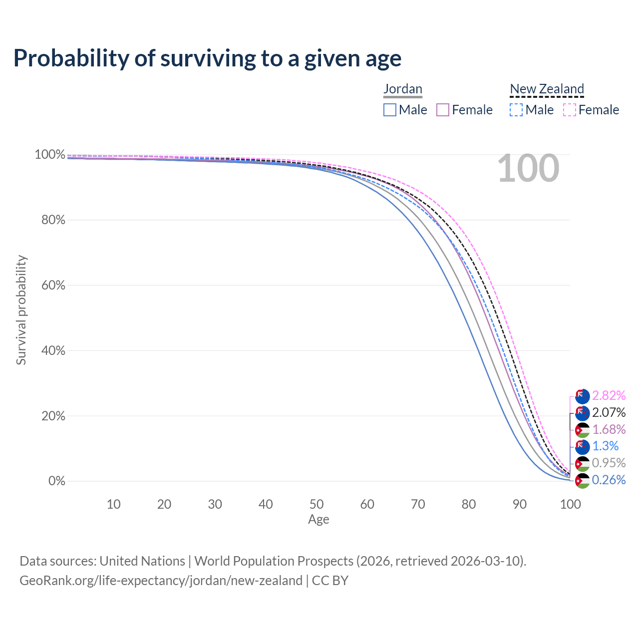 This life expectancy calculator shows the odds of living to 100, 95, 90, and below based on current age for both males and females in Jordan and New Zealand, along with mean and median age of death. The calculations are based on the 2026 life tables (actuarial tables) from the UN World Population Prospects.
