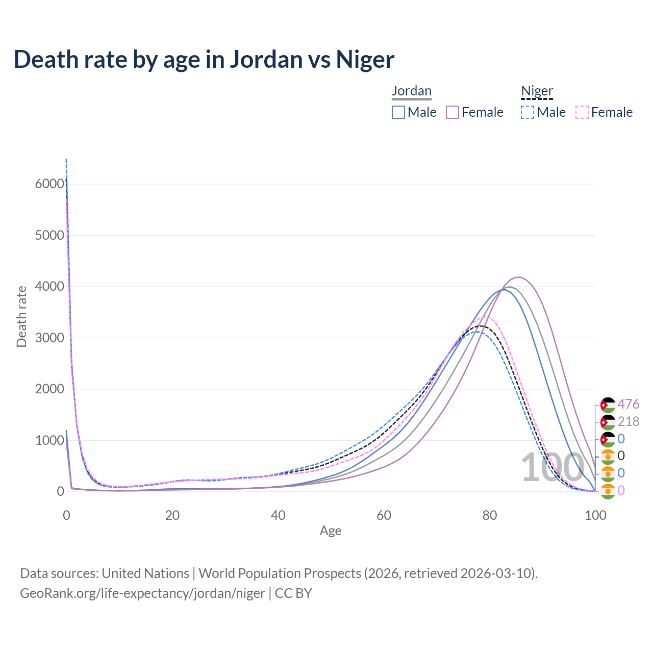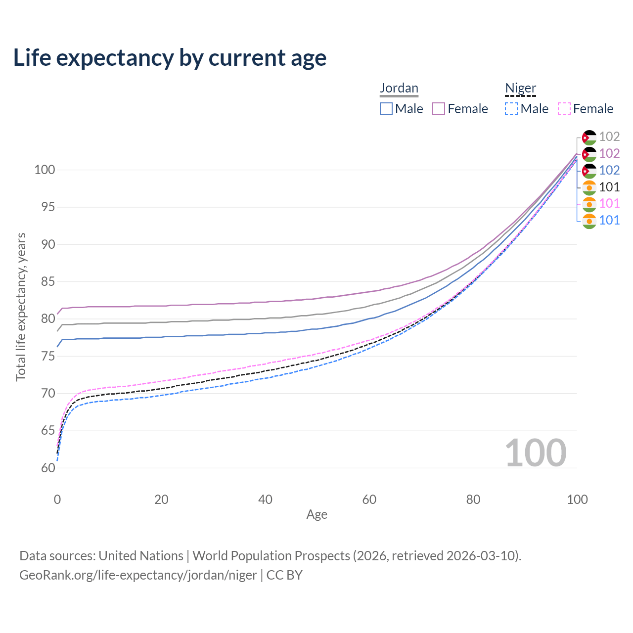 This life expectancy calculator shows the odds of living to 100, 95, 90, and below based on current age for both males and females in Jordan and Niger, along with mean and median age of death. The calculations are based on the 2026 life tables (actuarial tables) from the UN World Population Prospects.