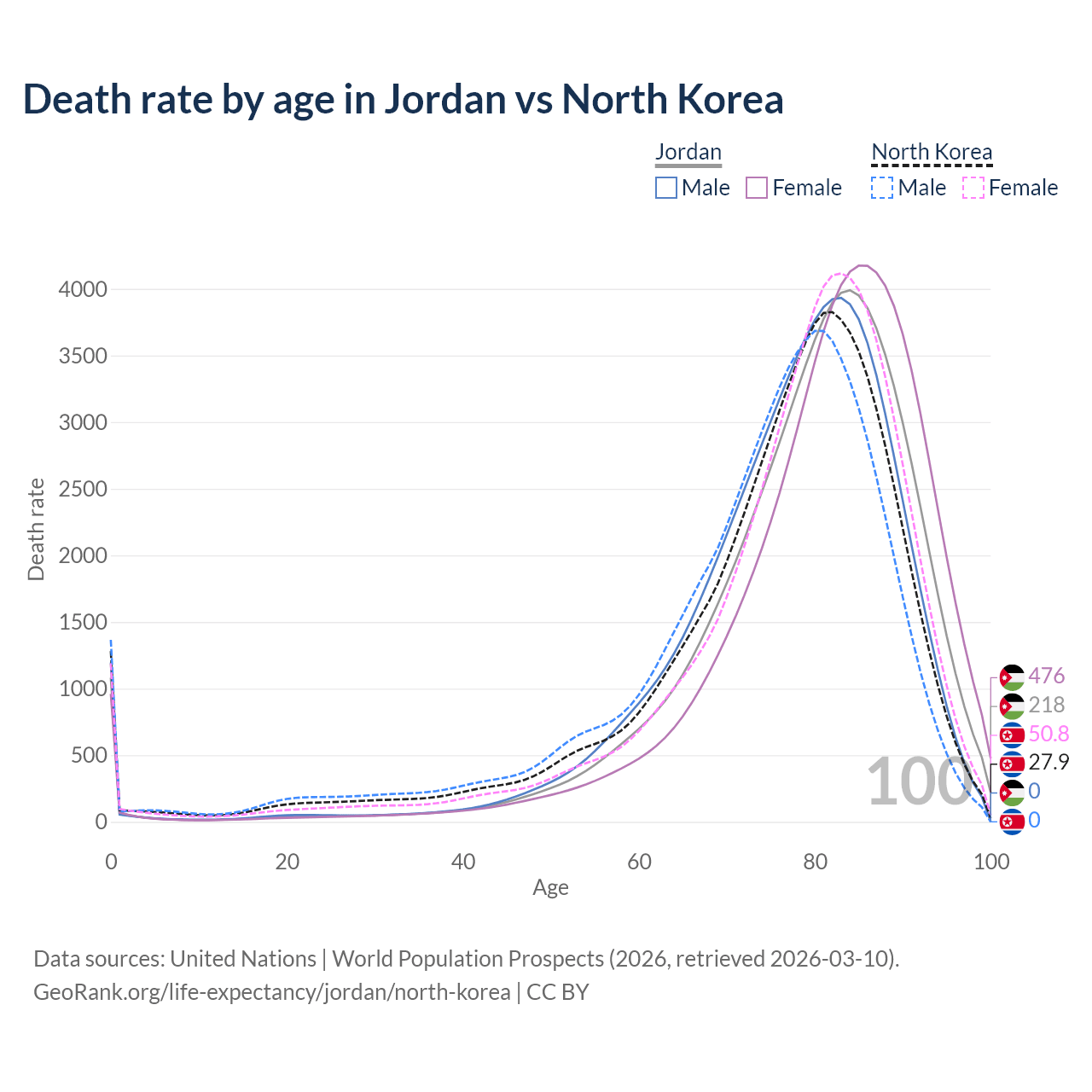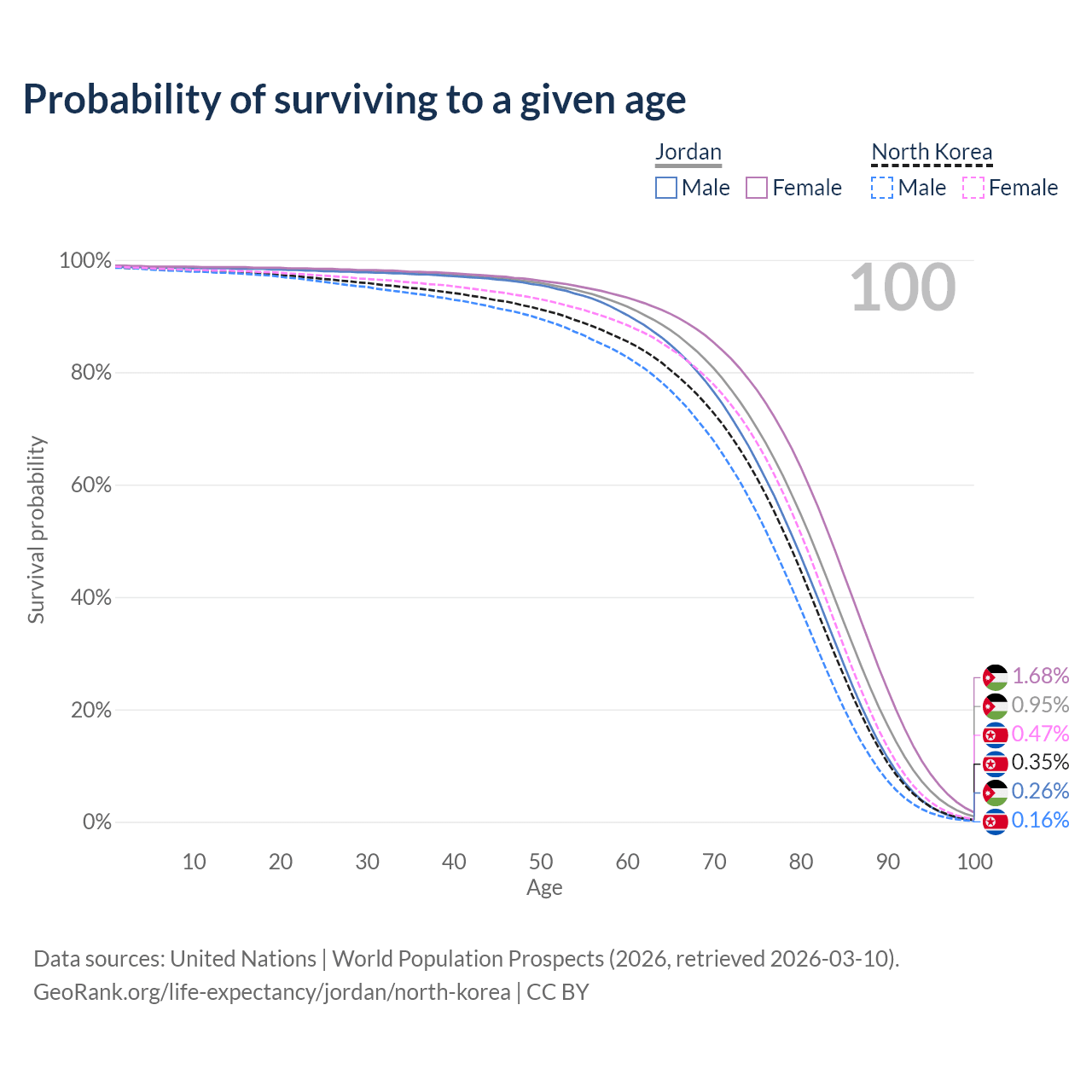 This life expectancy calculator shows the odds of living to 100, 95, 90, and below based on current age for both males and females in Jordan and North Korea, along with mean and median age of death. The calculations are based on the 2026 life tables (actuarial tables) from the UN World Population Prospects.