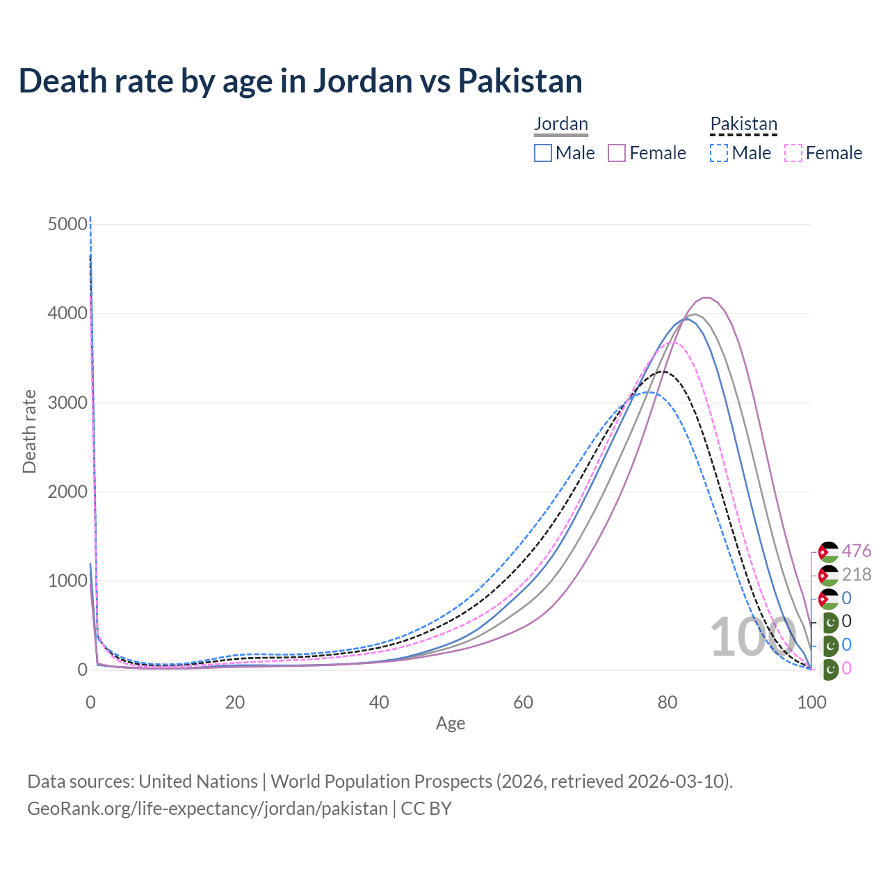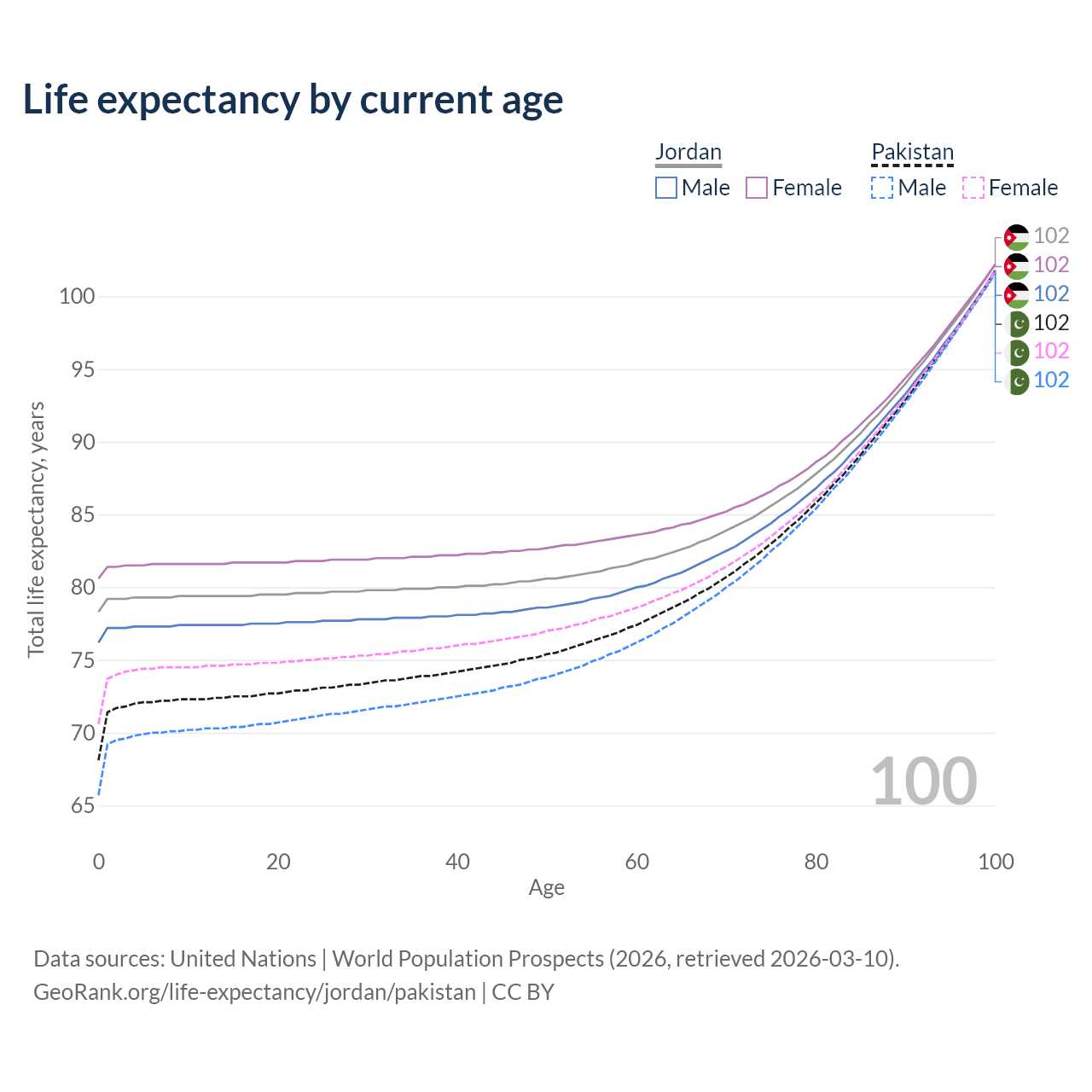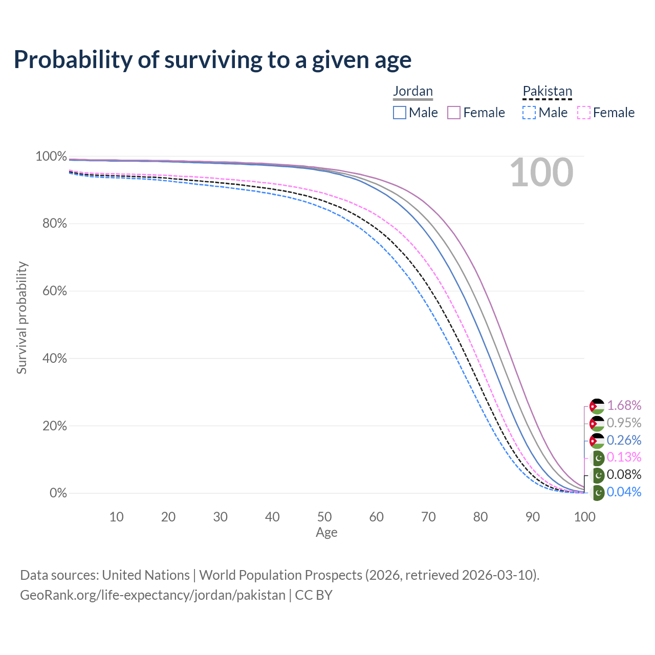 This life expectancy calculator shows the odds of living to 100, 95, 90, and below based on current age for both males and females in Jordan and Pakistan, along with mean and median age of death. The calculations are based on the 2026 life tables (actuarial tables) from the UN World Population Prospects.