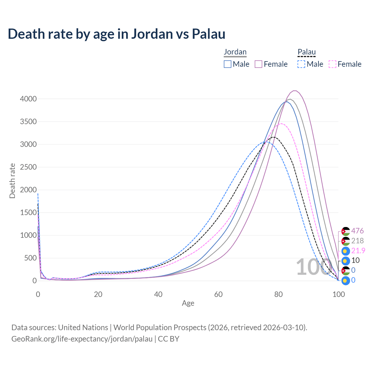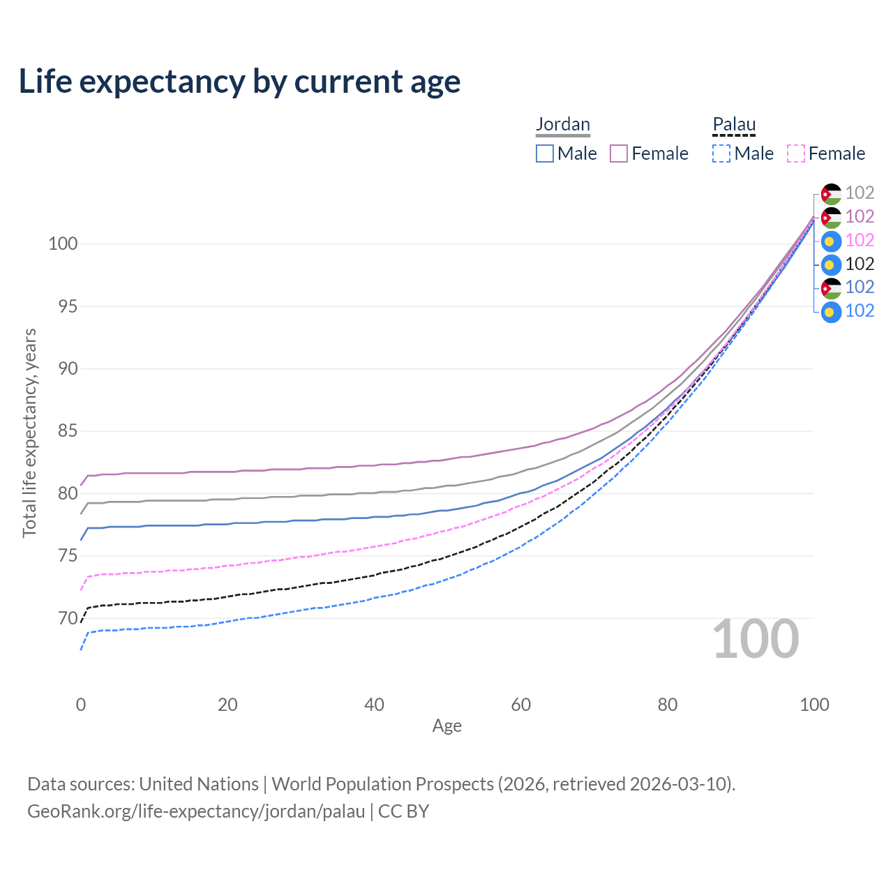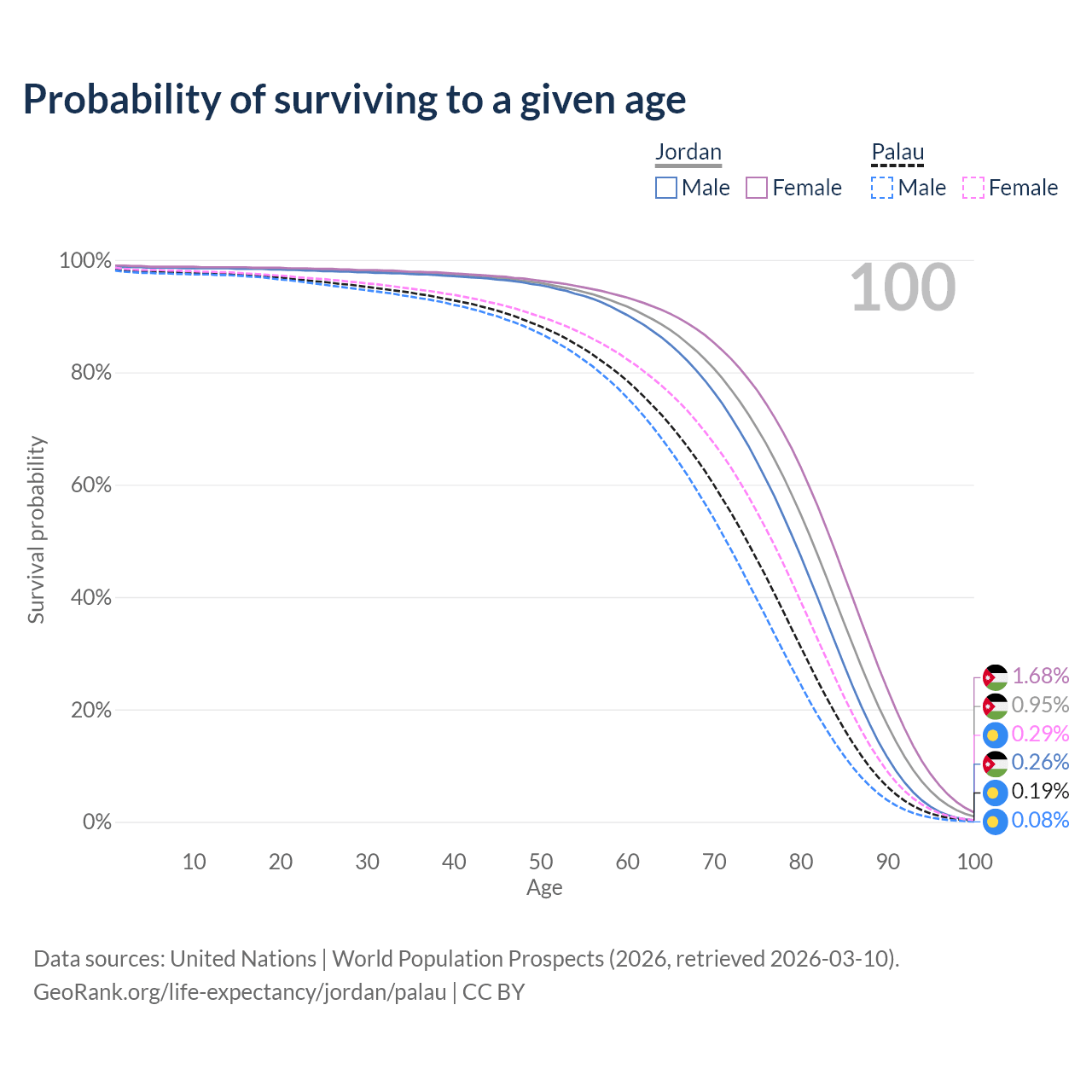 This life expectancy calculator shows the odds of living to 100, 95, 90, and below based on current age for both males and females in Jordan and Palau, along with mean and median age of death. The calculations are based on the 2026 life tables (actuarial tables) from the UN World Population Prospects.
