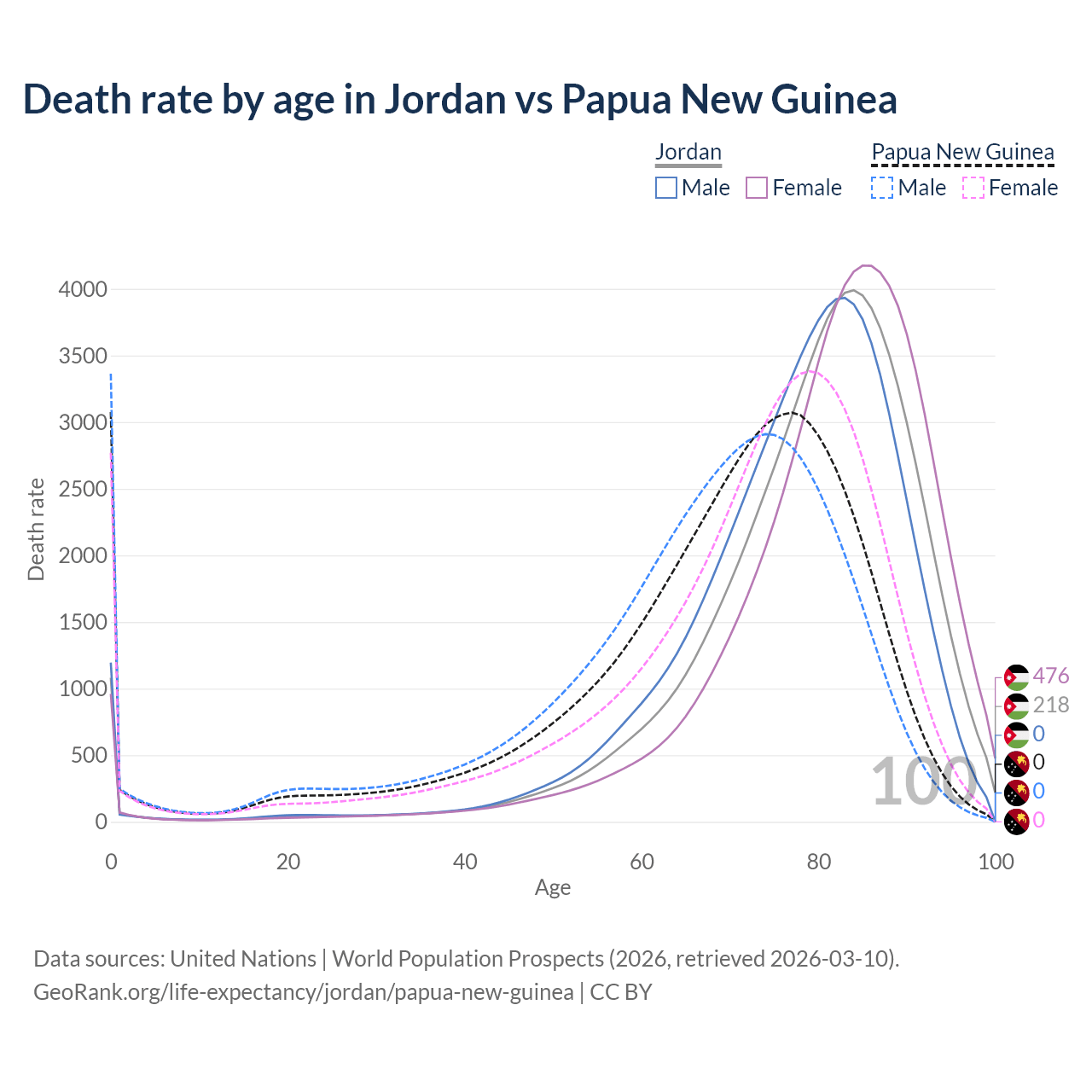 In Jordan, the most common age of death is 84, compared to 0 in Papua New Guinea. The median age of death is 81.3 in Jordan and 71.7 in Papua New Guinea, meaning only half of each cohort is expected to live past that age.