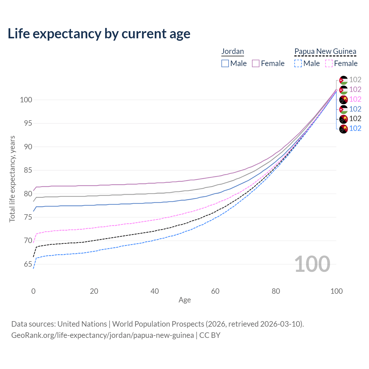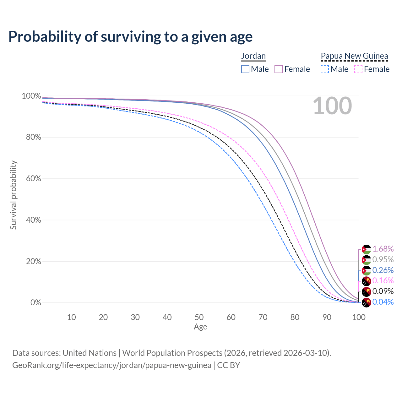 This life expectancy calculator shows the odds of living to 100, 95, 90, and below based on current age for both males and females in Jordan and Papua New Guinea, along with mean and median age of death. The calculations are based on the 2026 life tables (actuarial tables) from the UN World Population Prospects.