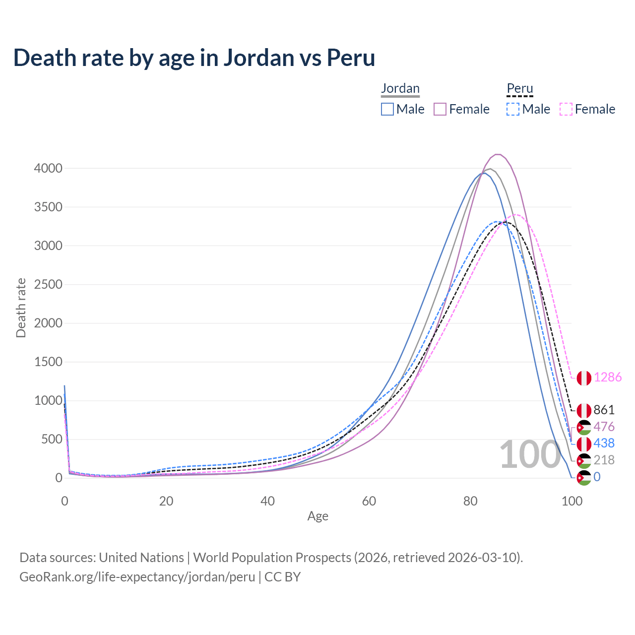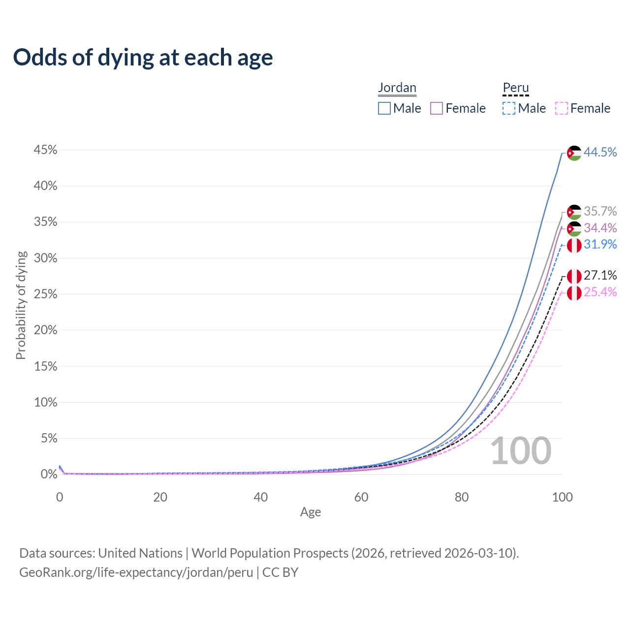 This life expectancy calculator shows the odds of living to 100, 95, 90, and below based on current age for both males and females in Jordan and Peru, along with mean and median age of death. The calculations are based on the 2026 life tables (actuarial tables) from the UN World Population Prospects.