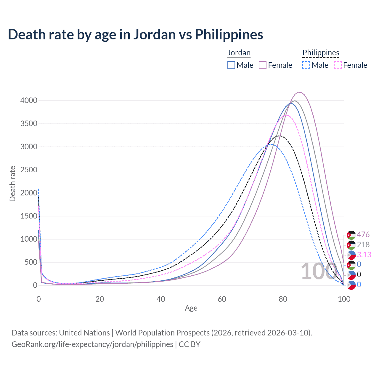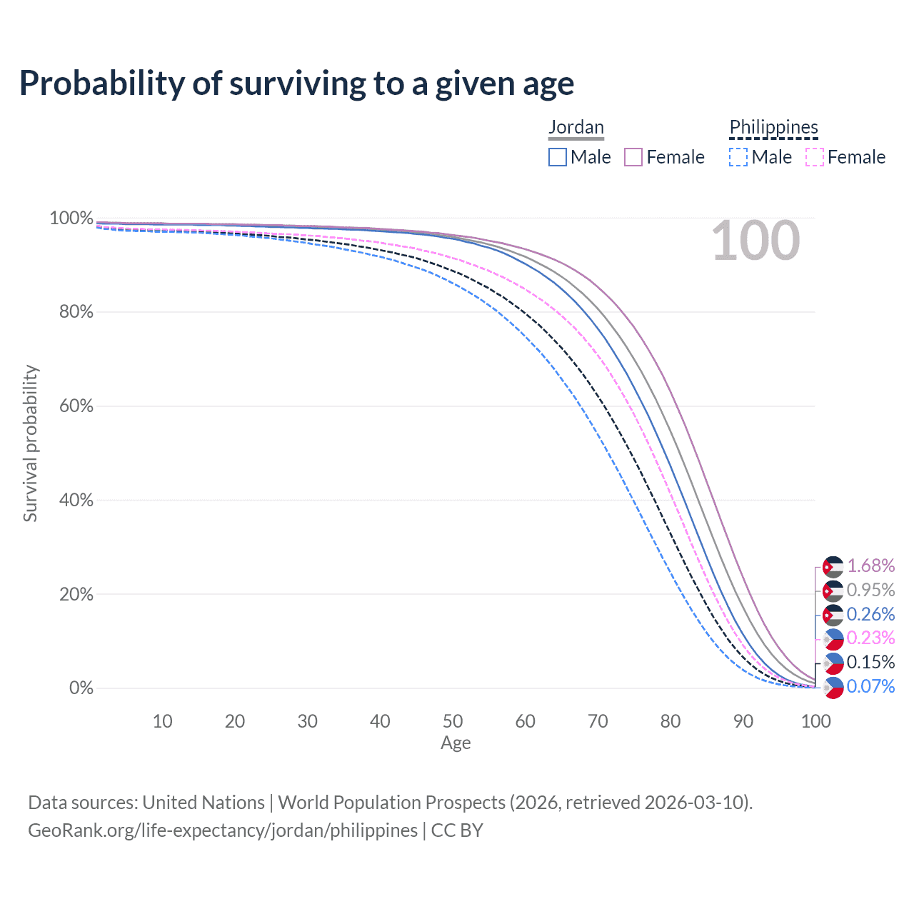 This life expectancy calculator shows the odds of living to 100, 95, 90, and below based on current age for both males and females in Jordan and the Philippines, along with mean and median age of death. The calculations are based on the 2026 life tables (actuarial tables) from the UN World Population Prospects.