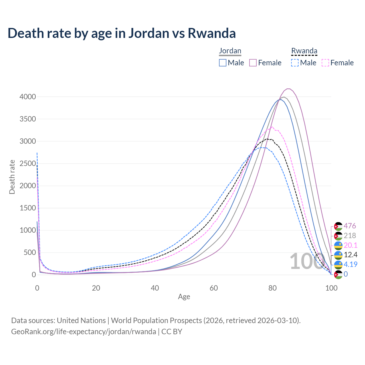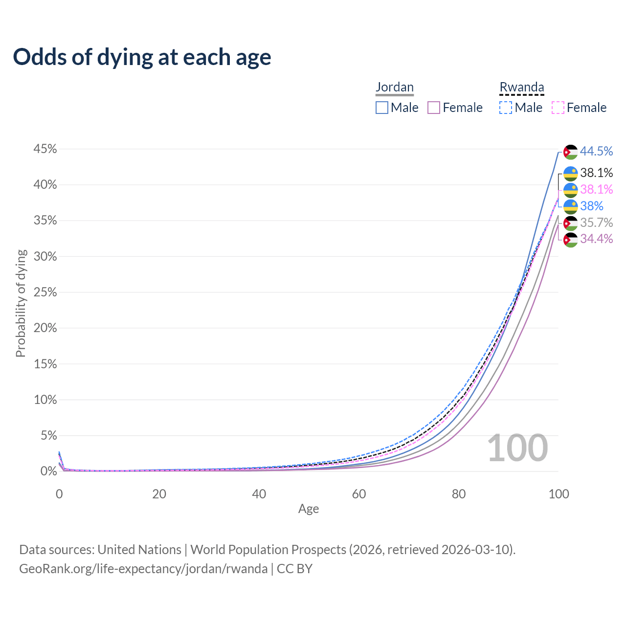 This life expectancy calculator shows the odds of living to 100, 95, 90, and below based on current age for both males and females in Jordan and Rwanda, along with mean and median age of death. The calculations are based on the 2026 life tables (actuarial tables) from the UN World Population Prospects.