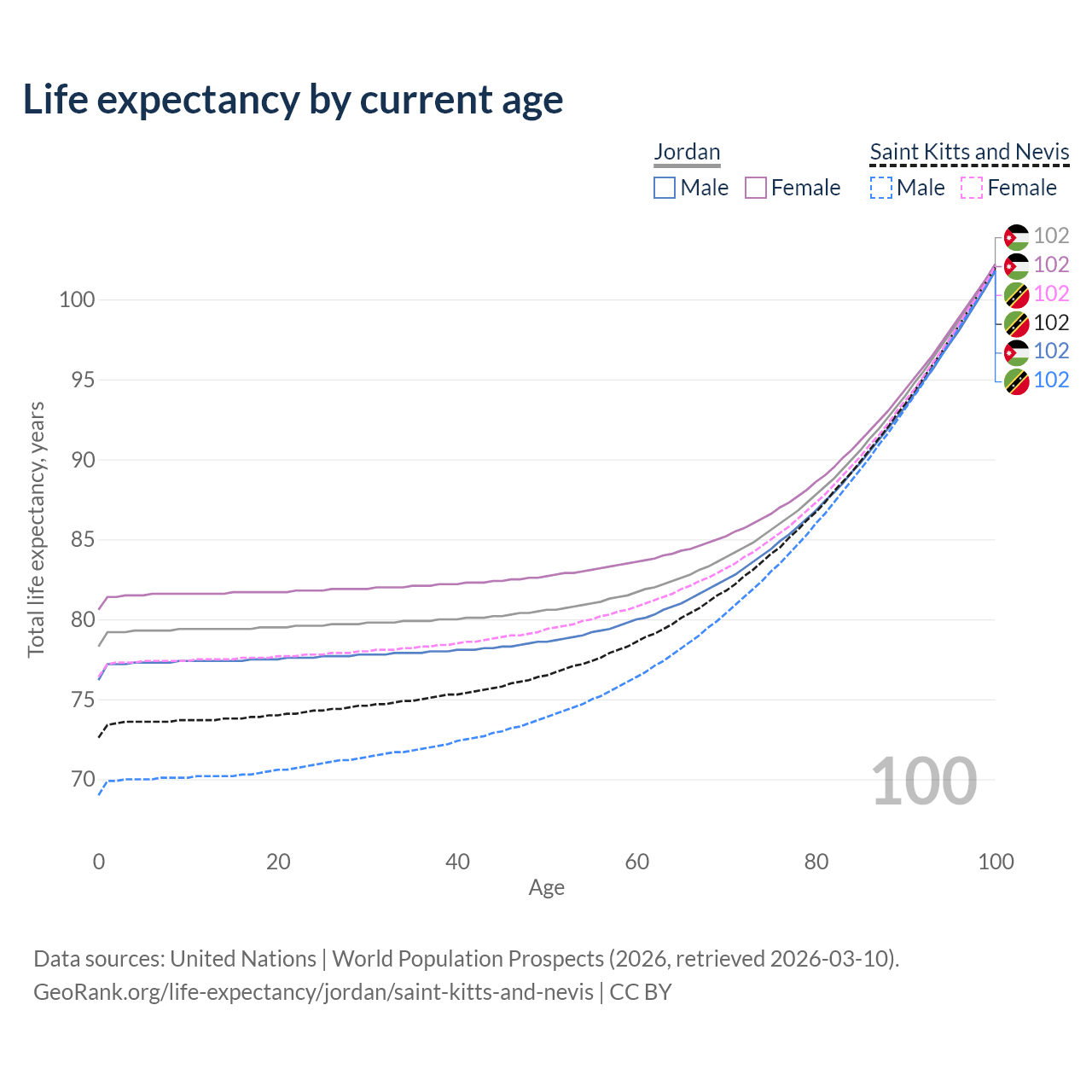 This life expectancy calculator shows the odds of living to 100, 95, 90, and below based on current age for both males and females in Jordan and Saint Kitts and Nevis, along with mean and median age of death. The calculations are based on the 2026 life tables (actuarial tables) from the UN World Population Prospects.