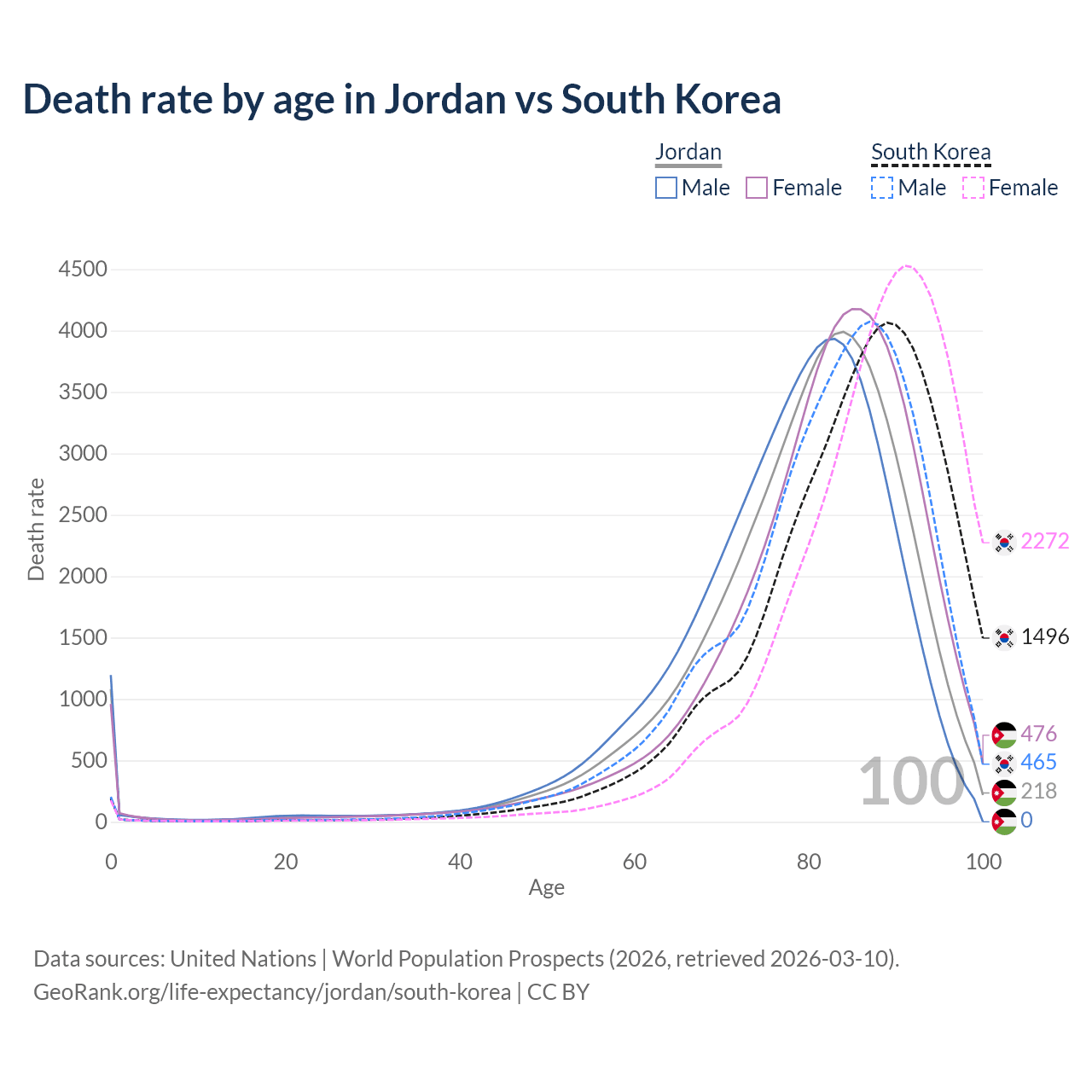 In Jordan, the most common age of death is 84, compared to 89 in South Korea. The median age of death is 81.3 in Jordan and 86.8 in South Korea, meaning only half of each cohort is expected to live past that age.
