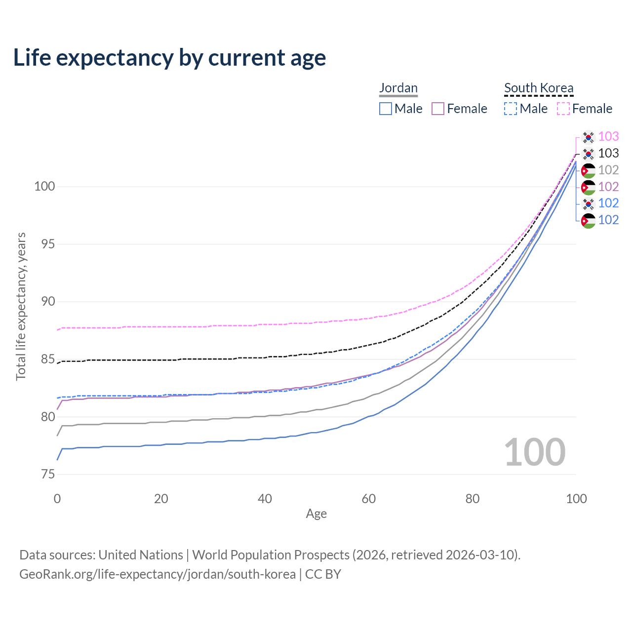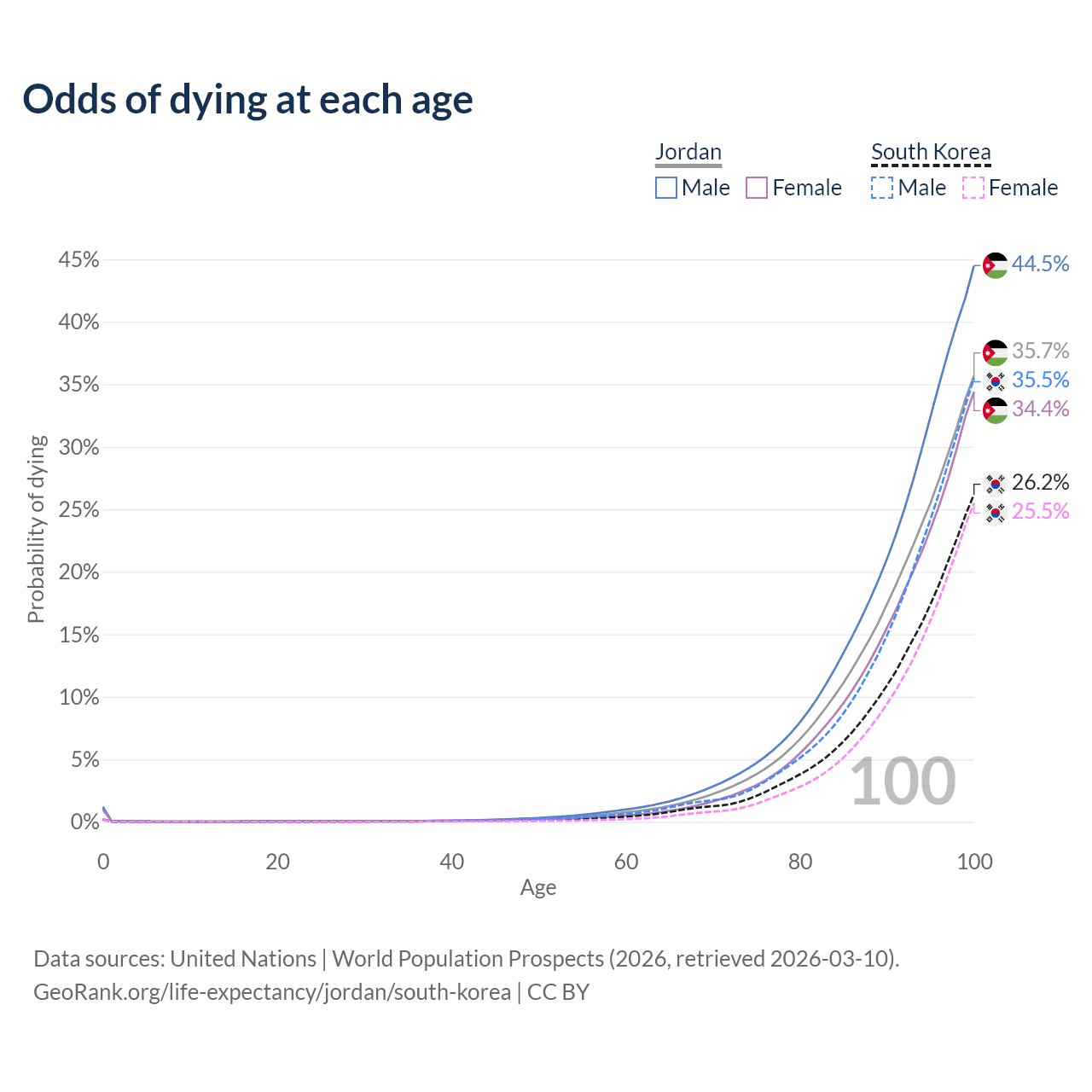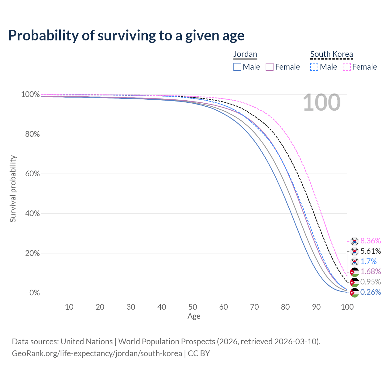 This life expectancy calculator shows the odds of living to 100, 95, 90, and below based on current age for both males and females in Jordan and South Korea, along with mean and median age of death. The calculations are based on the 2026 life tables (actuarial tables) from the UN World Population Prospects.