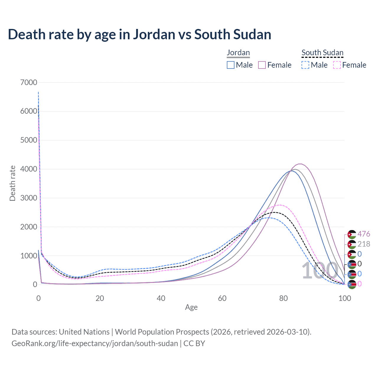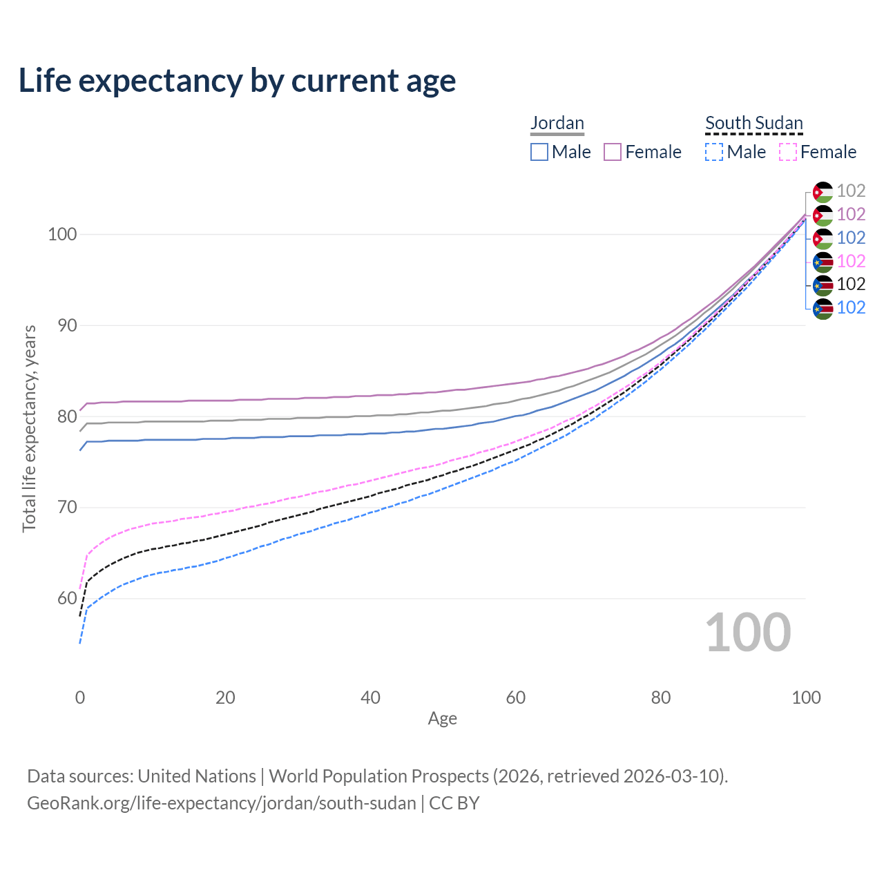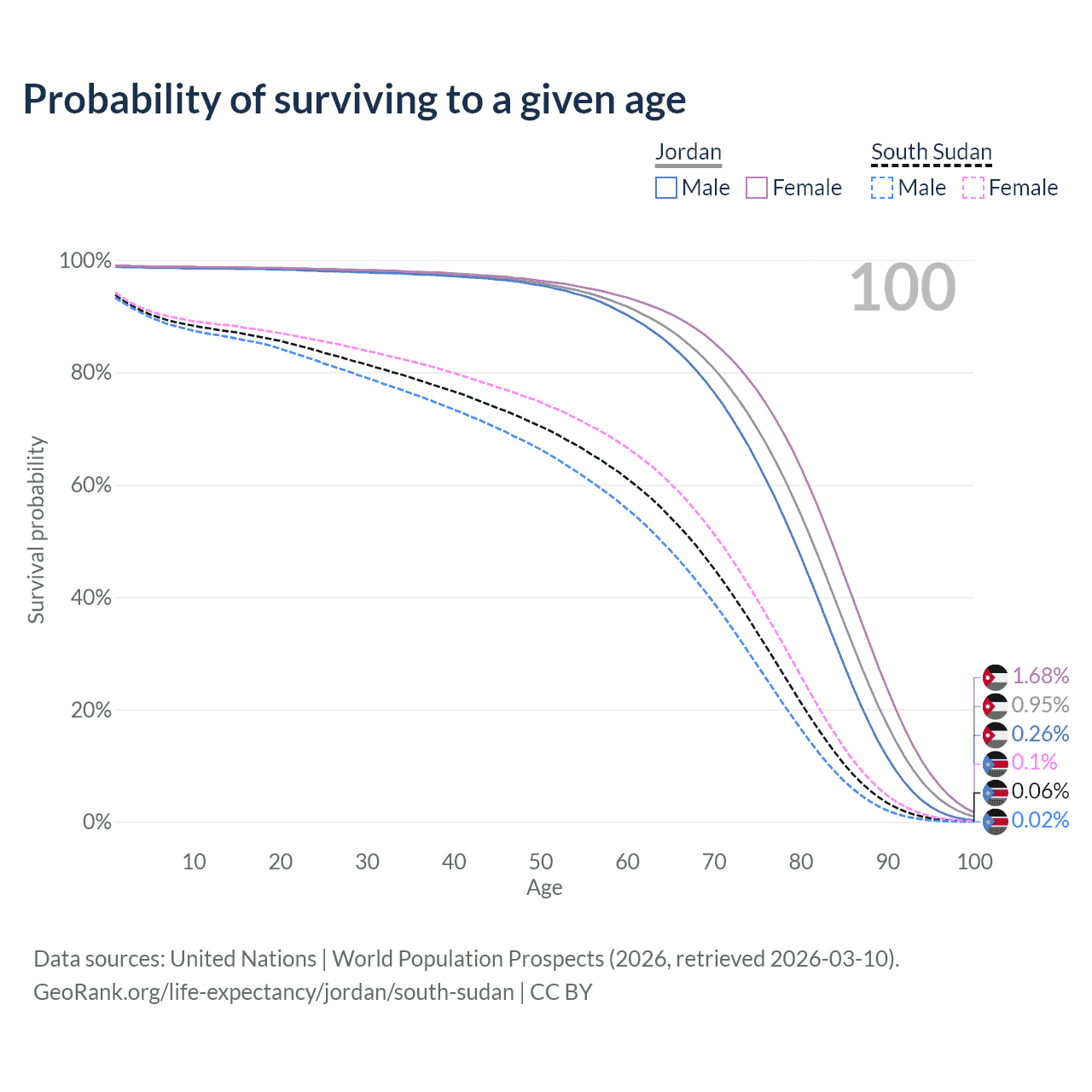 This life expectancy calculator shows the odds of living to 100, 95, 90, and below based on current age for both males and females in Jordan and South Sudan, along with mean and median age of death. The calculations are based on the 2026 life tables (actuarial tables) from the UN World Population Prospects.