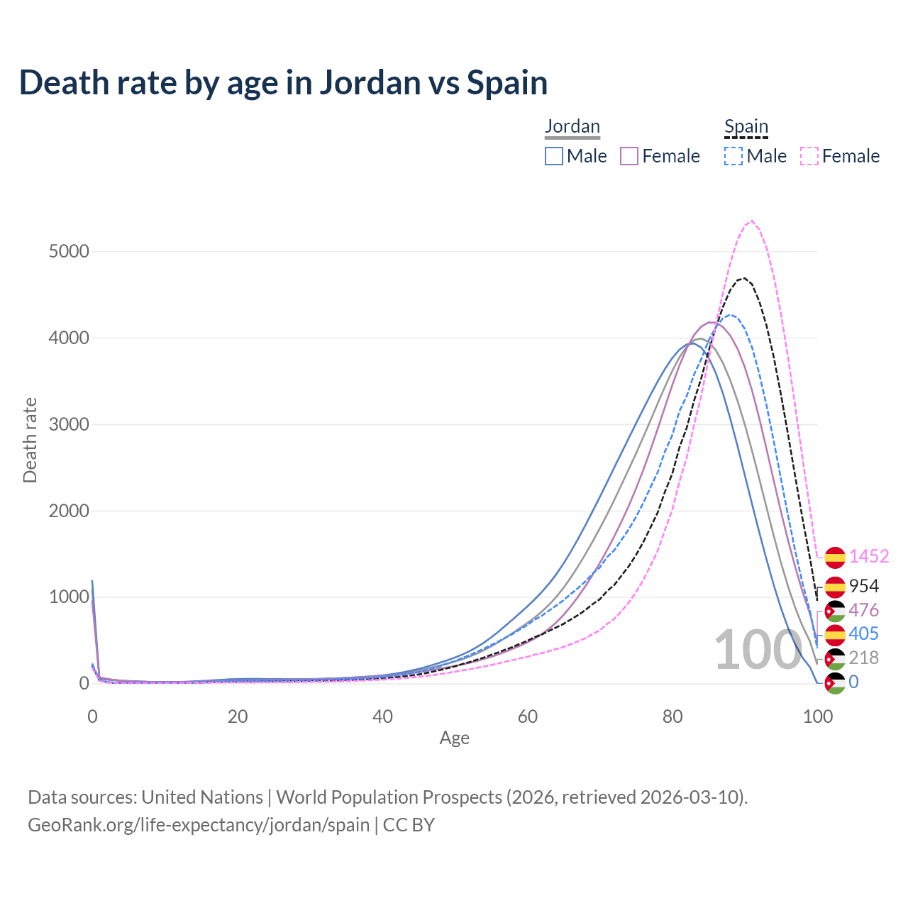In Jordan, the most common age of death is 84, compared to 90 in Spain. The median age of death is 81.3 in Jordan and 87 in Spain, meaning only half of each cohort is expected to live past that age.