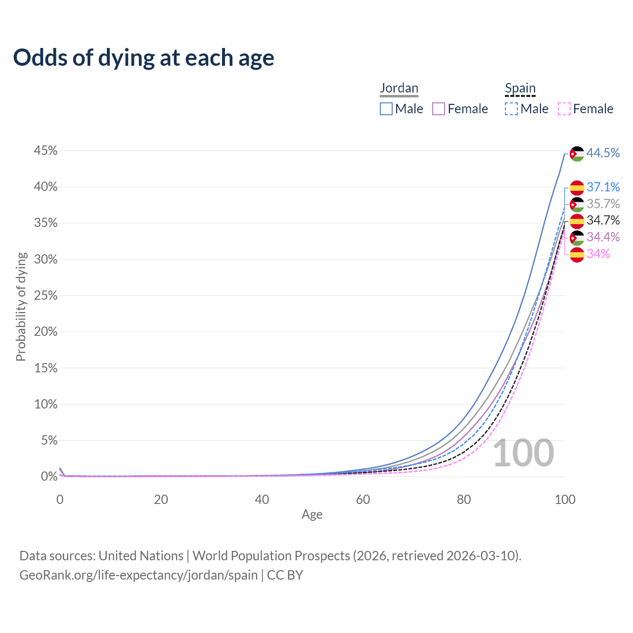 This life expectancy calculator shows the odds of living to 100, 95, 90, and below based on current age for both males and females in Jordan and Spain, along with mean and median age of death. The calculations are based on the 2026 life tables (actuarial tables) from the UN World Population Prospects.
