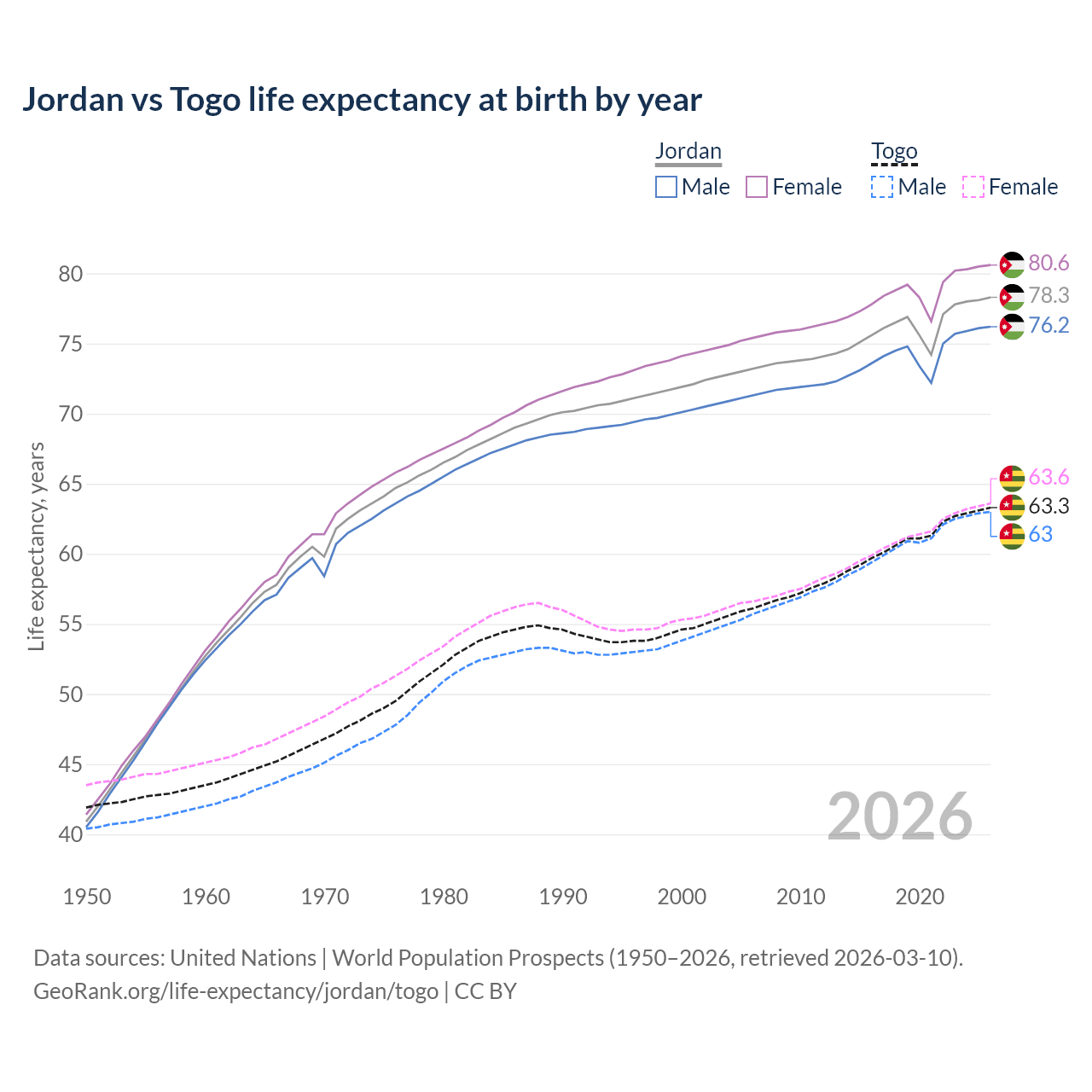 The average life expectancy at birth is 78.3 years in Jordan vs 63.3 in Togo. Jordan is ranked 58/197 by life expectancy, and Togo is 181/197. In Jordan, the life expectancy is 76.2 years for males and 80.6 years for females. In Togo, it's 63 years for males and 63.6 years for females.