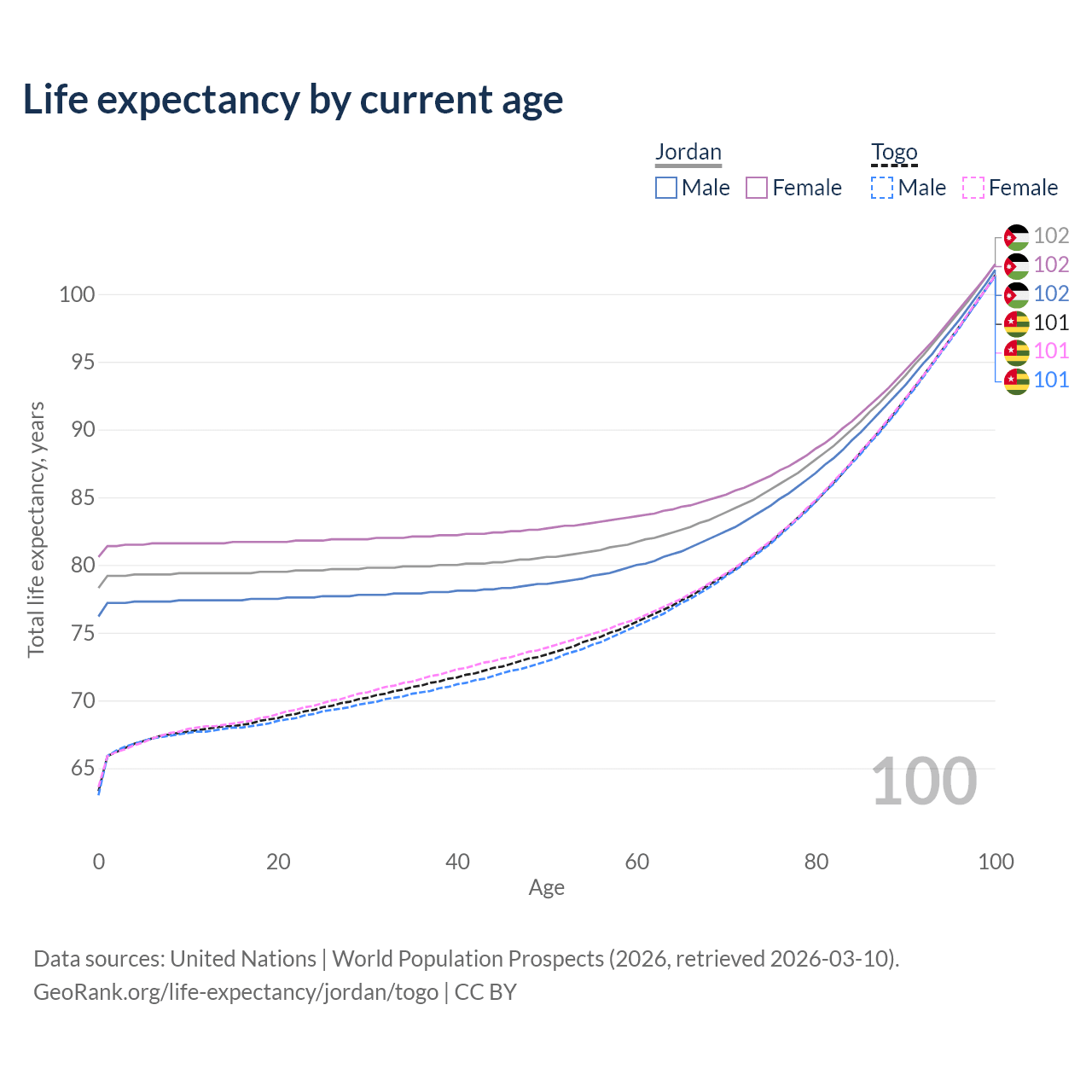 This life expectancy calculator shows the odds of living to 100, 95, 90, and below based on current age for both males and females in Jordan and Togo, along with mean and median age of death. The calculations are based on the 2026 life tables (actuarial tables) from the UN World Population Prospects.