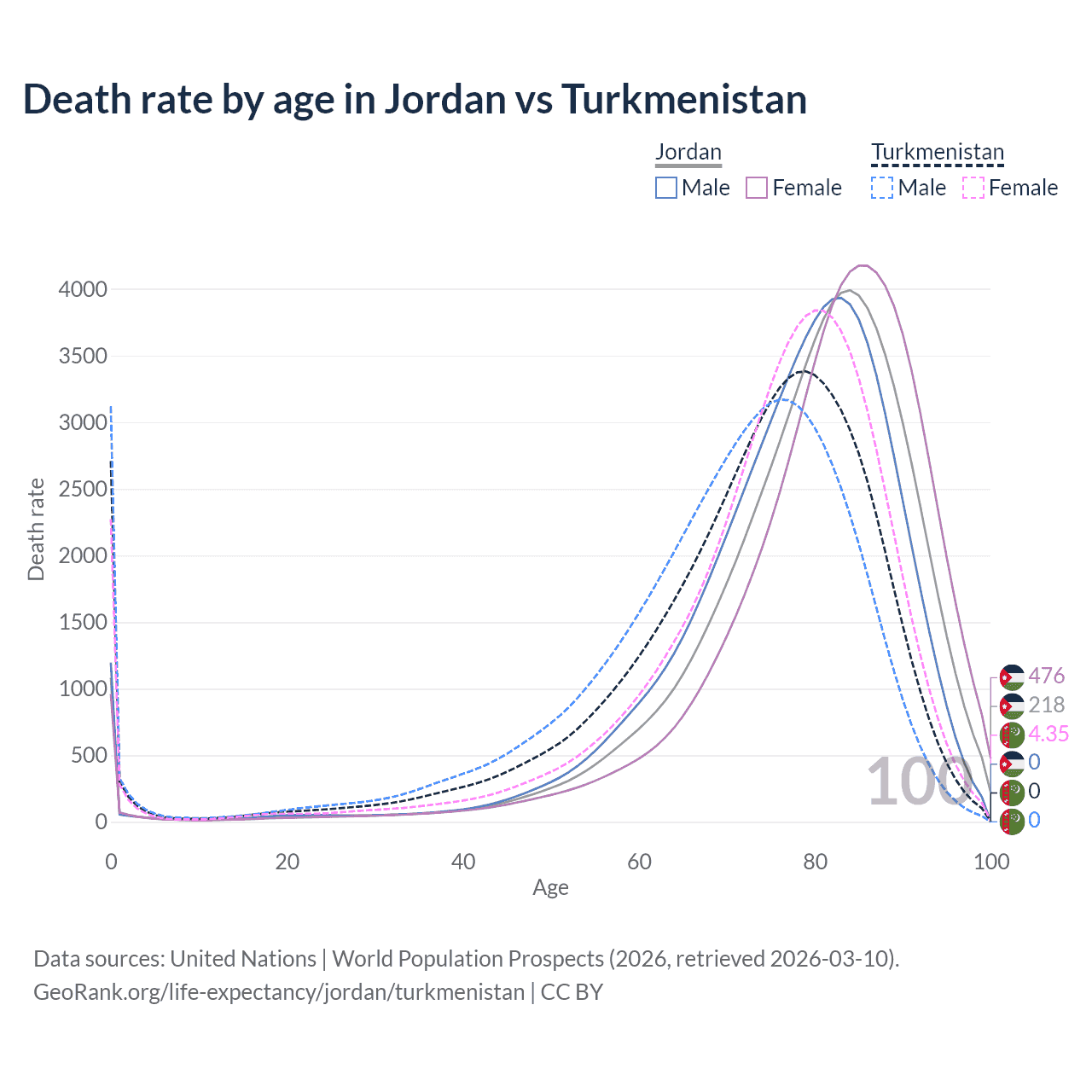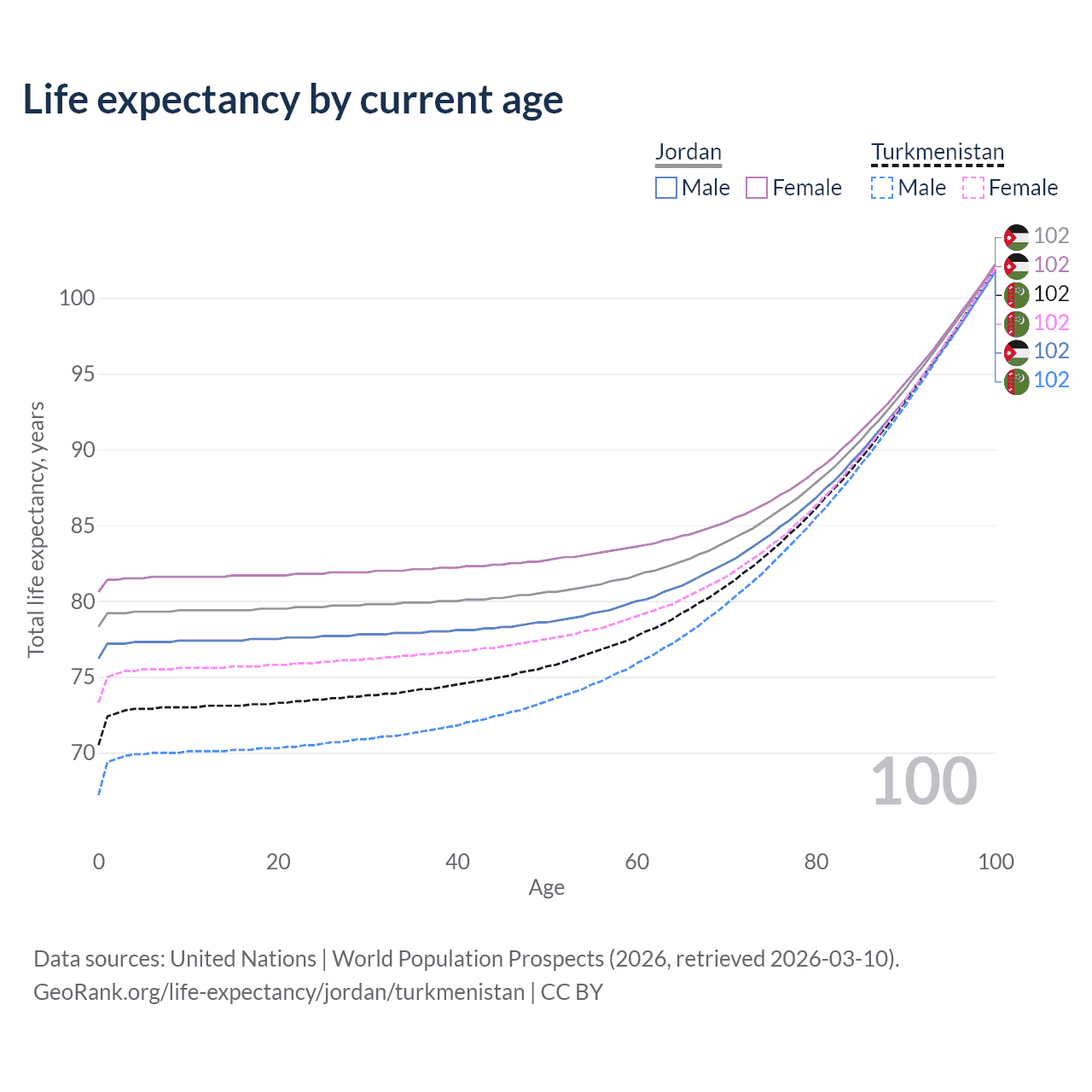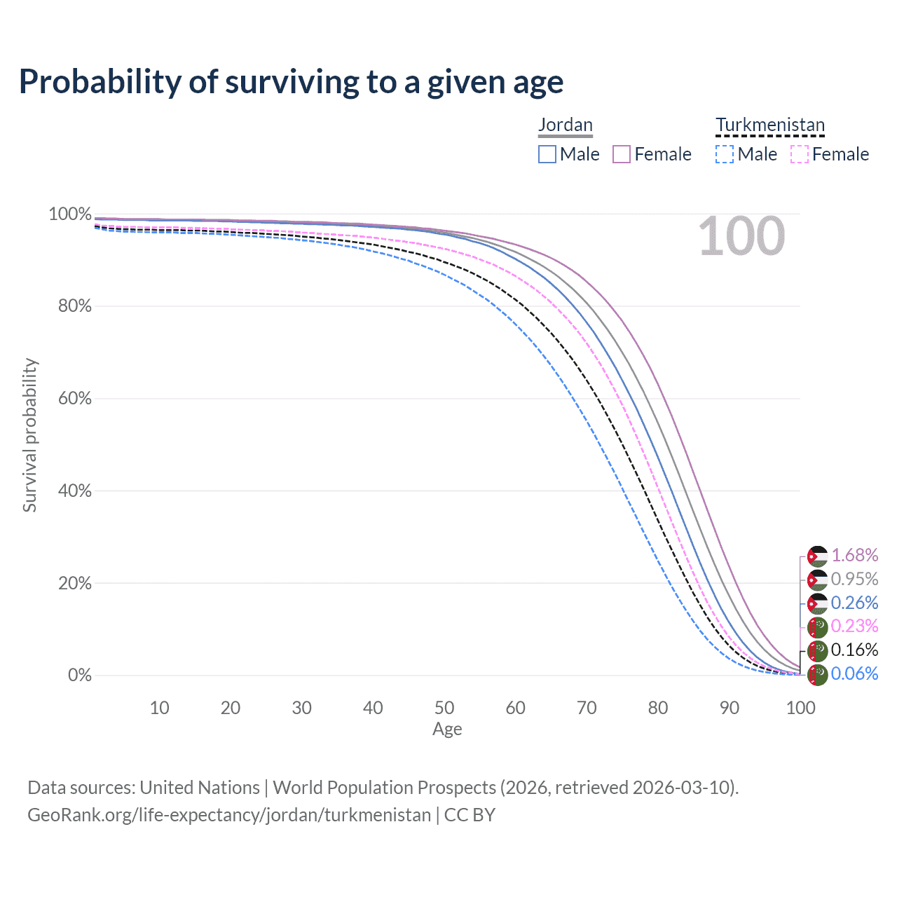 This life expectancy calculator shows the odds of living to 100, 95, 90, and below based on current age for both males and females in Jordan and Turkmenistan, along with mean and median age of death. The calculations are based on the 2026 life tables (actuarial tables) from the UN World Population Prospects.