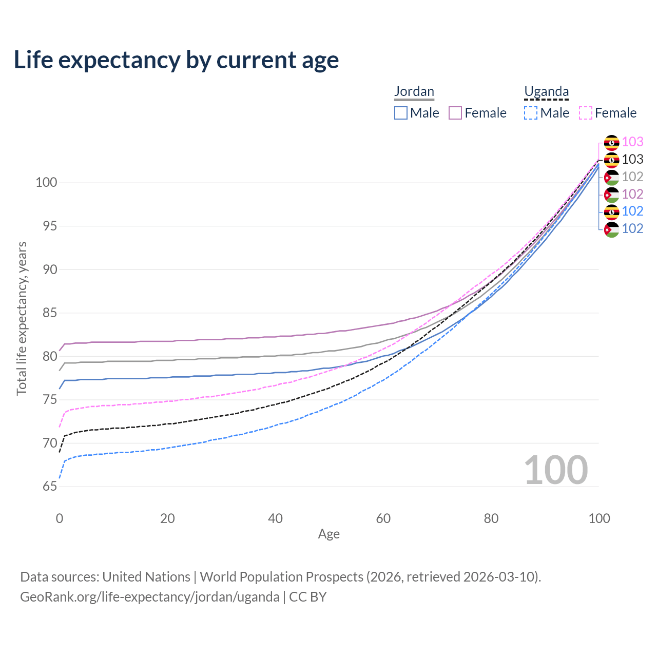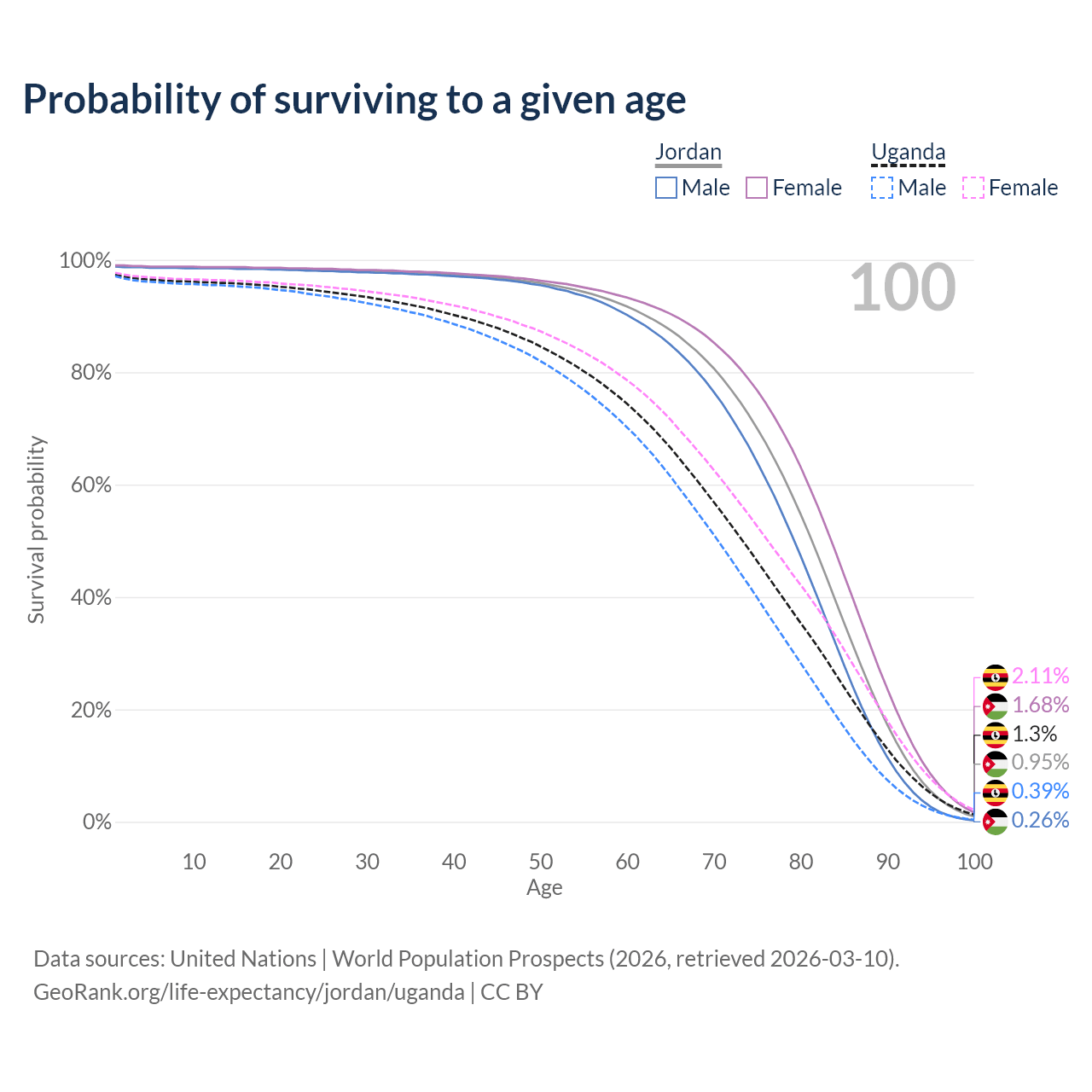 This life expectancy calculator shows the odds of living to 100, 95, 90, and below based on current age for both males and females in Jordan and Uganda, along with mean and median age of death. The calculations are based on the 2026 life tables (actuarial tables) from the UN World Population Prospects.