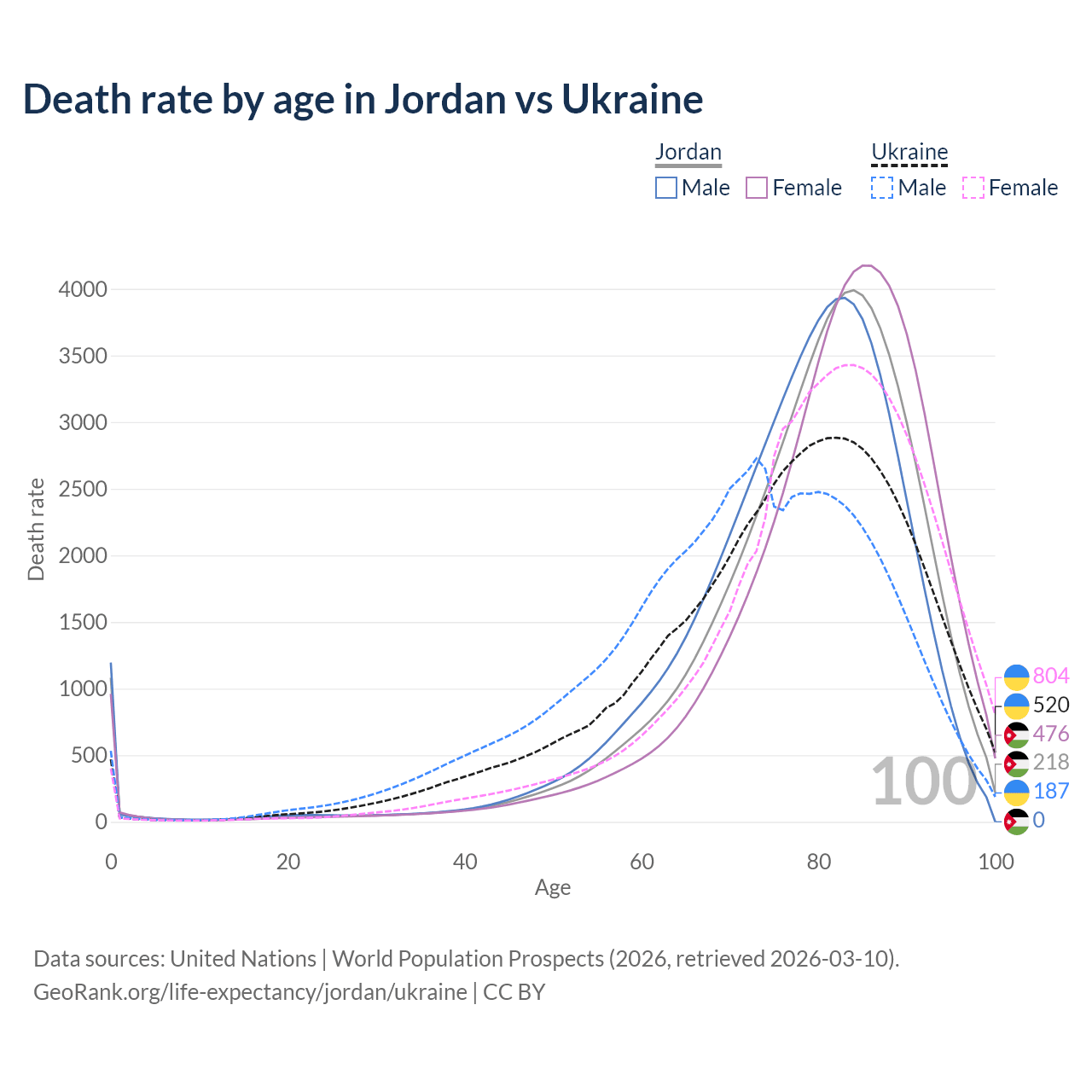 In Jordan, the most common age of death is 84, compared to 82 in Ukraine. The median age of death is 81.3 in Jordan and 78 in Ukraine, meaning only half of each cohort is expected to live past that age.