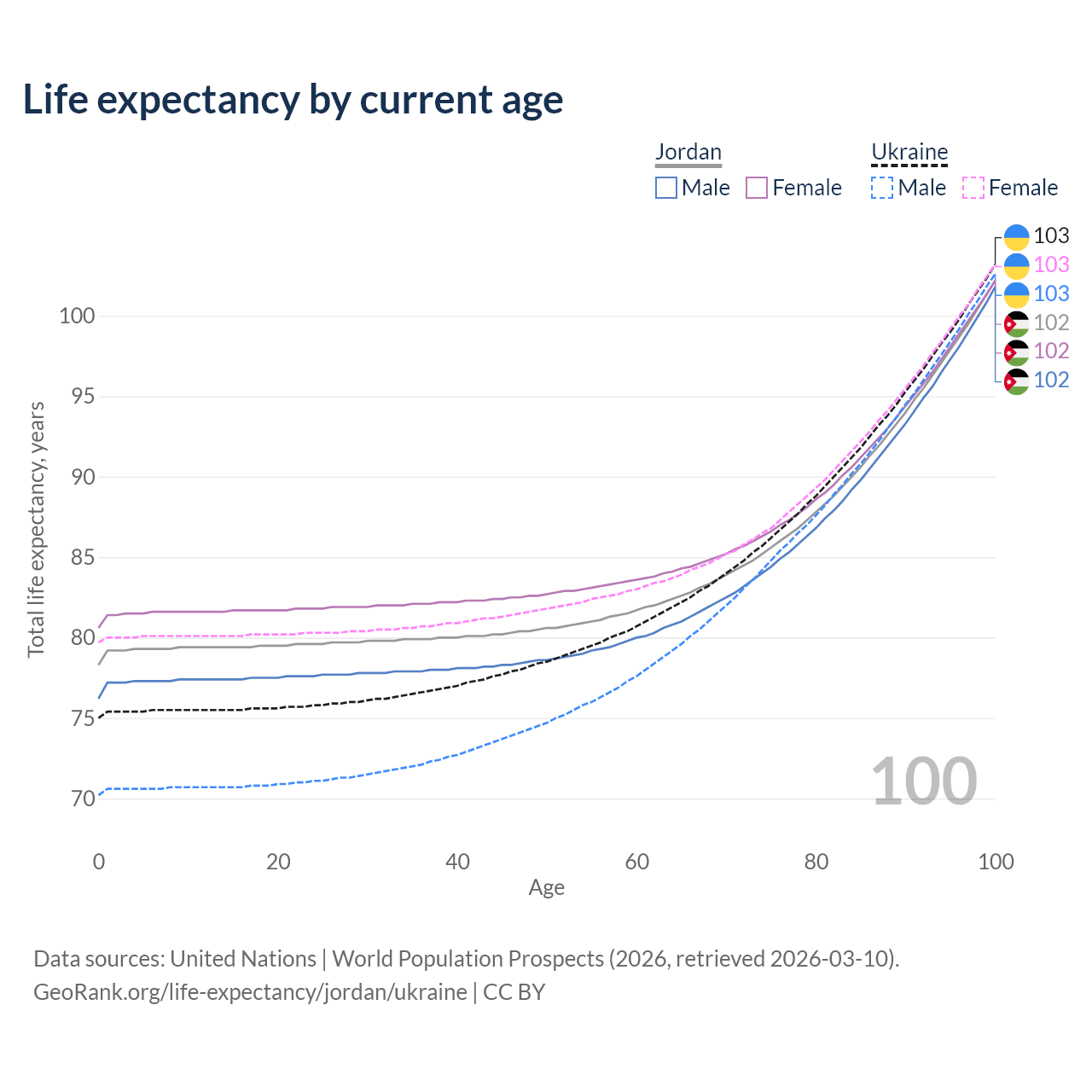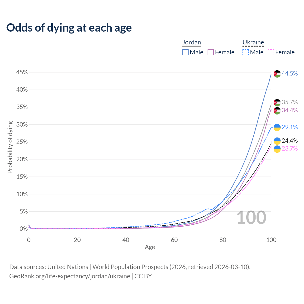 This life expectancy calculator shows the odds of living to 100, 95, 90, and below based on current age for both males and females in Jordan and Ukraine, along with mean and median age of death. The calculations are based on the 2026 life tables (actuarial tables) from the UN World Population Prospects.