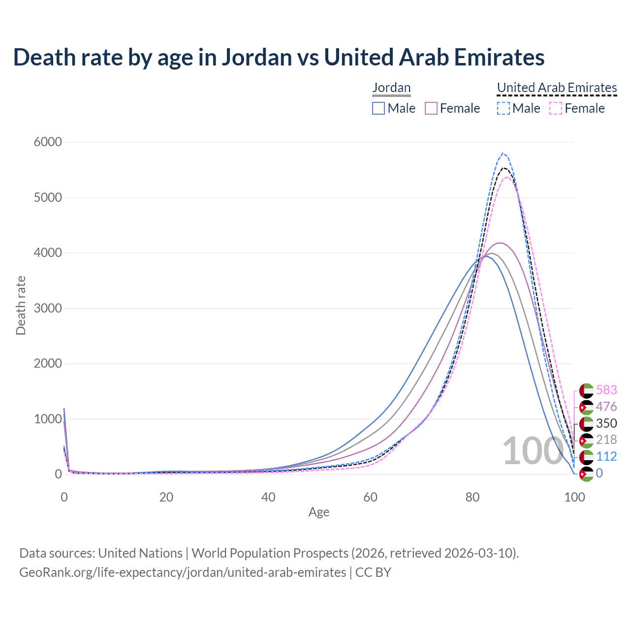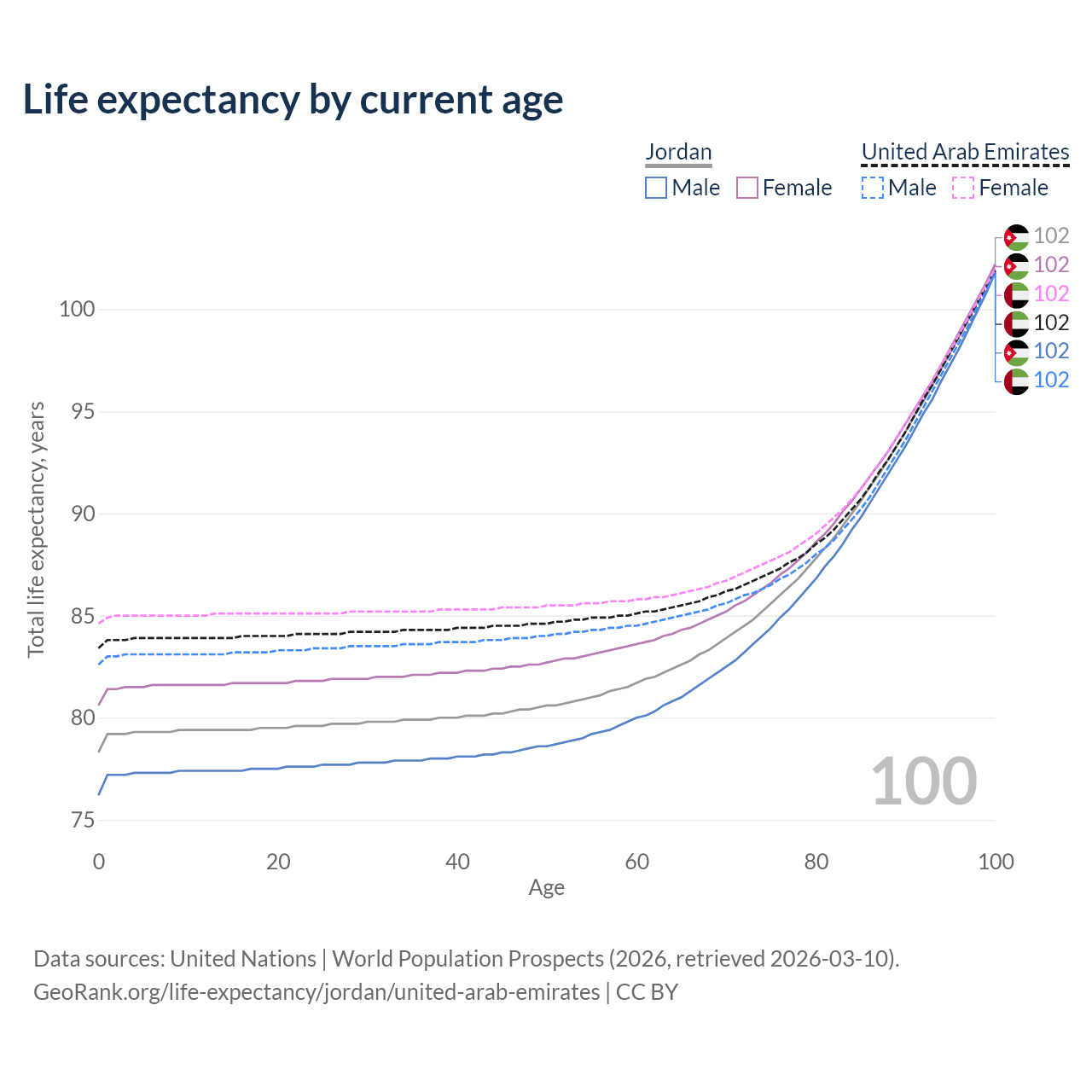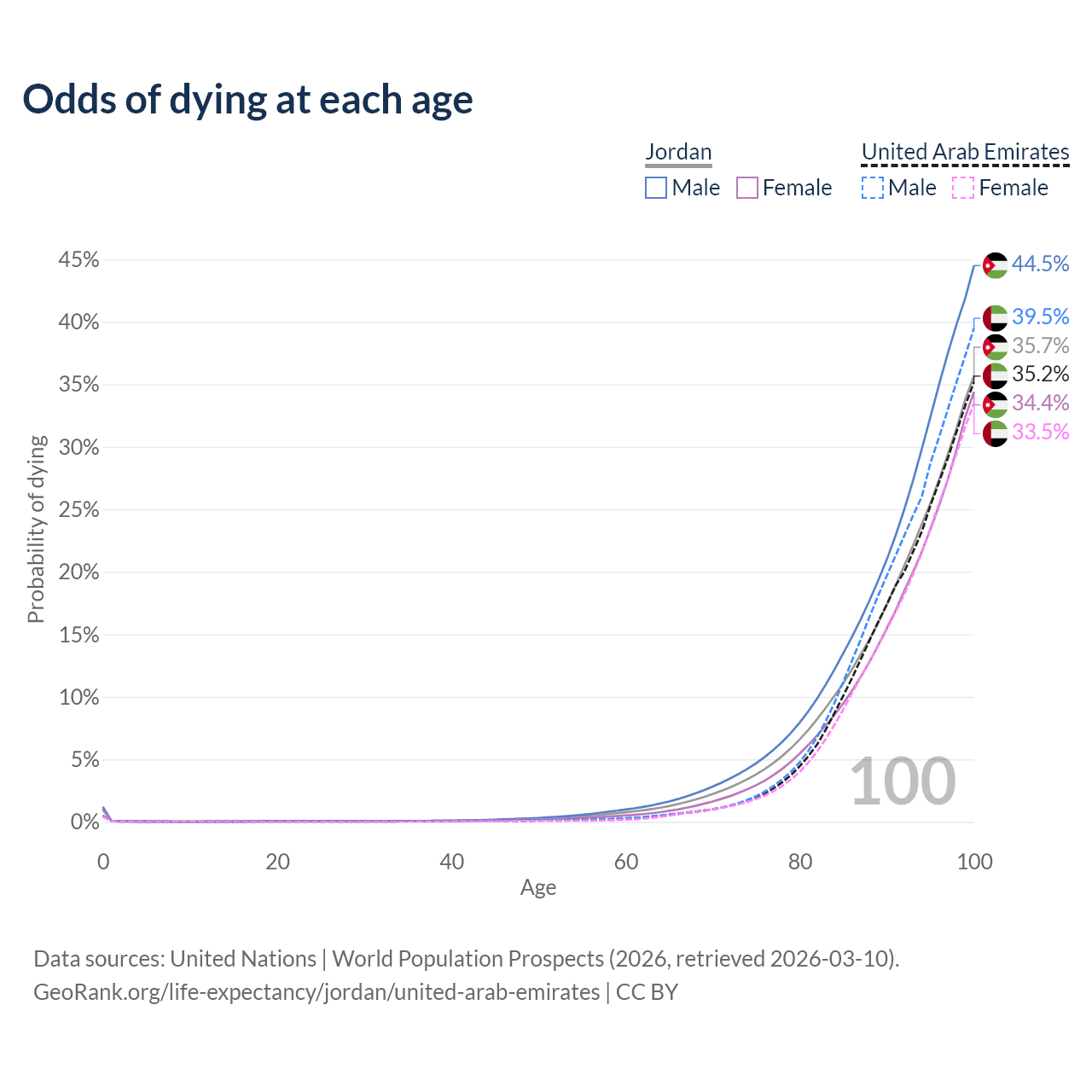 This life expectancy calculator shows the odds of living to 100, 95, 90, and below based on current age for both males and females in Jordan and the United Arab Emirates, along with mean and median age of death. The calculations are based on the 2026 life tables (actuarial tables) from the UN World Population Prospects.