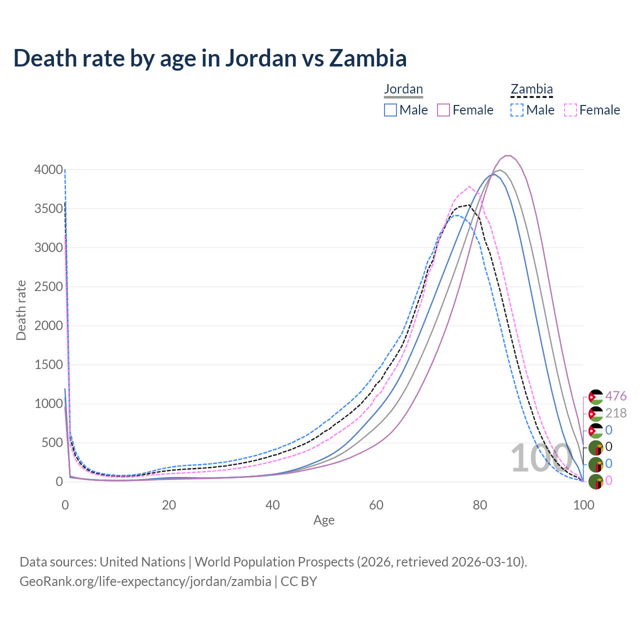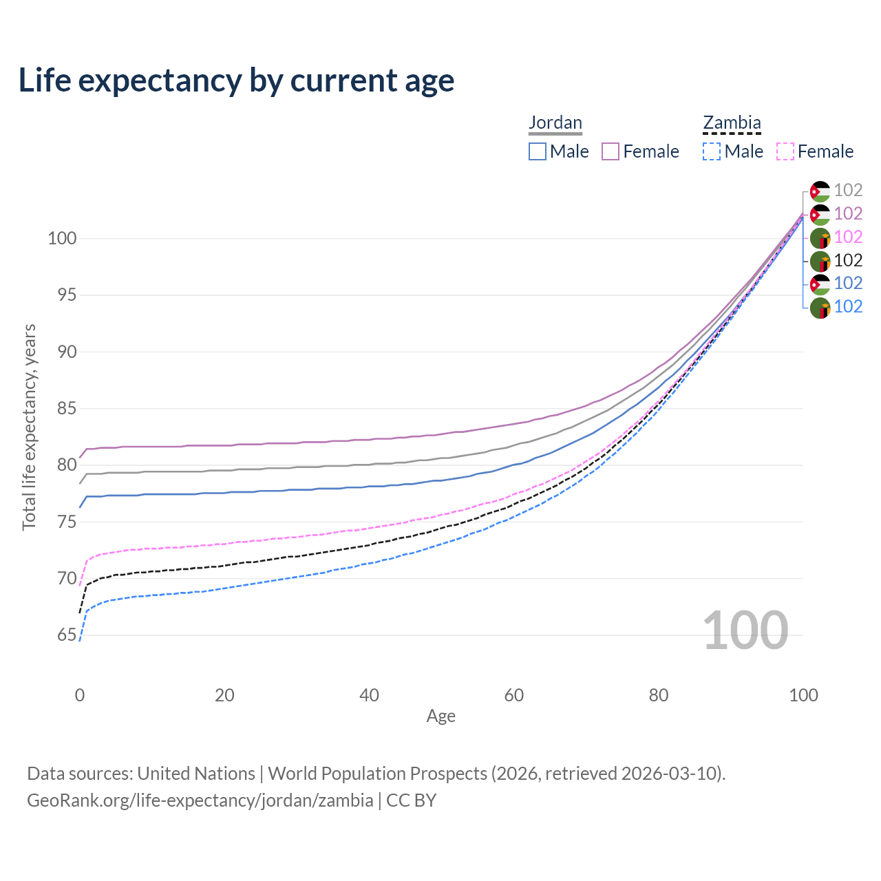 This life expectancy calculator shows the odds of living to 100, 95, 90, and below based on current age for both males and females in Jordan and Zambia, along with mean and median age of death. The calculations are based on the 2026 life tables (actuarial tables) from the UN World Population Prospects.