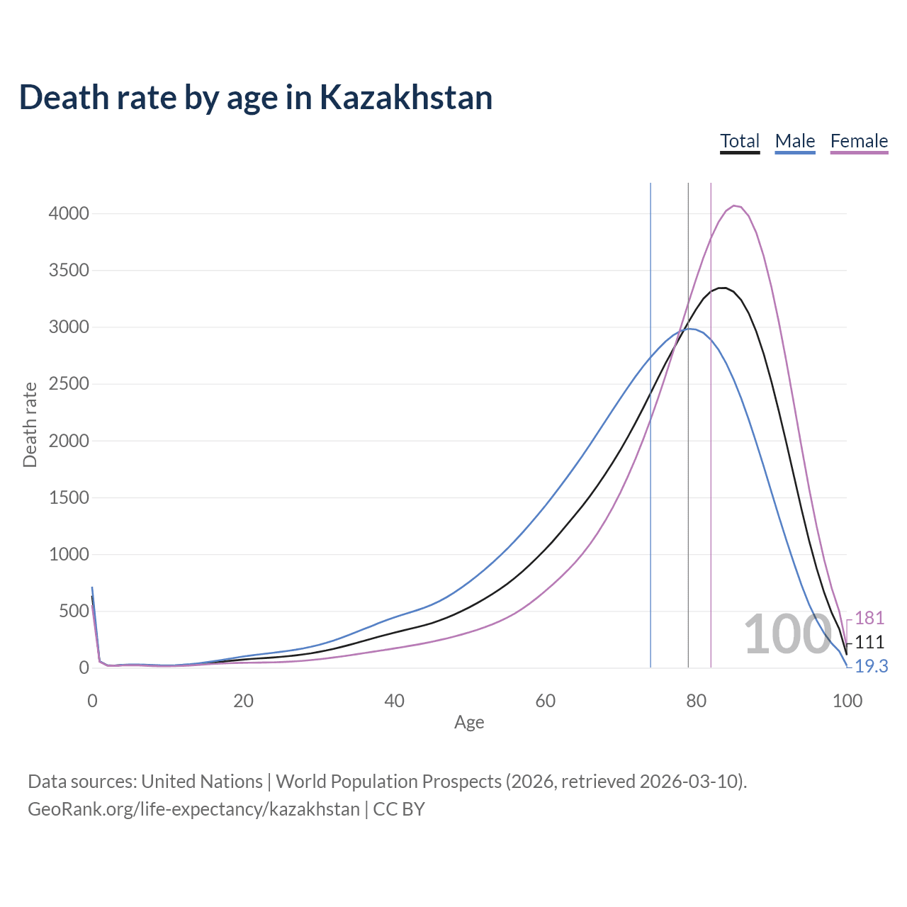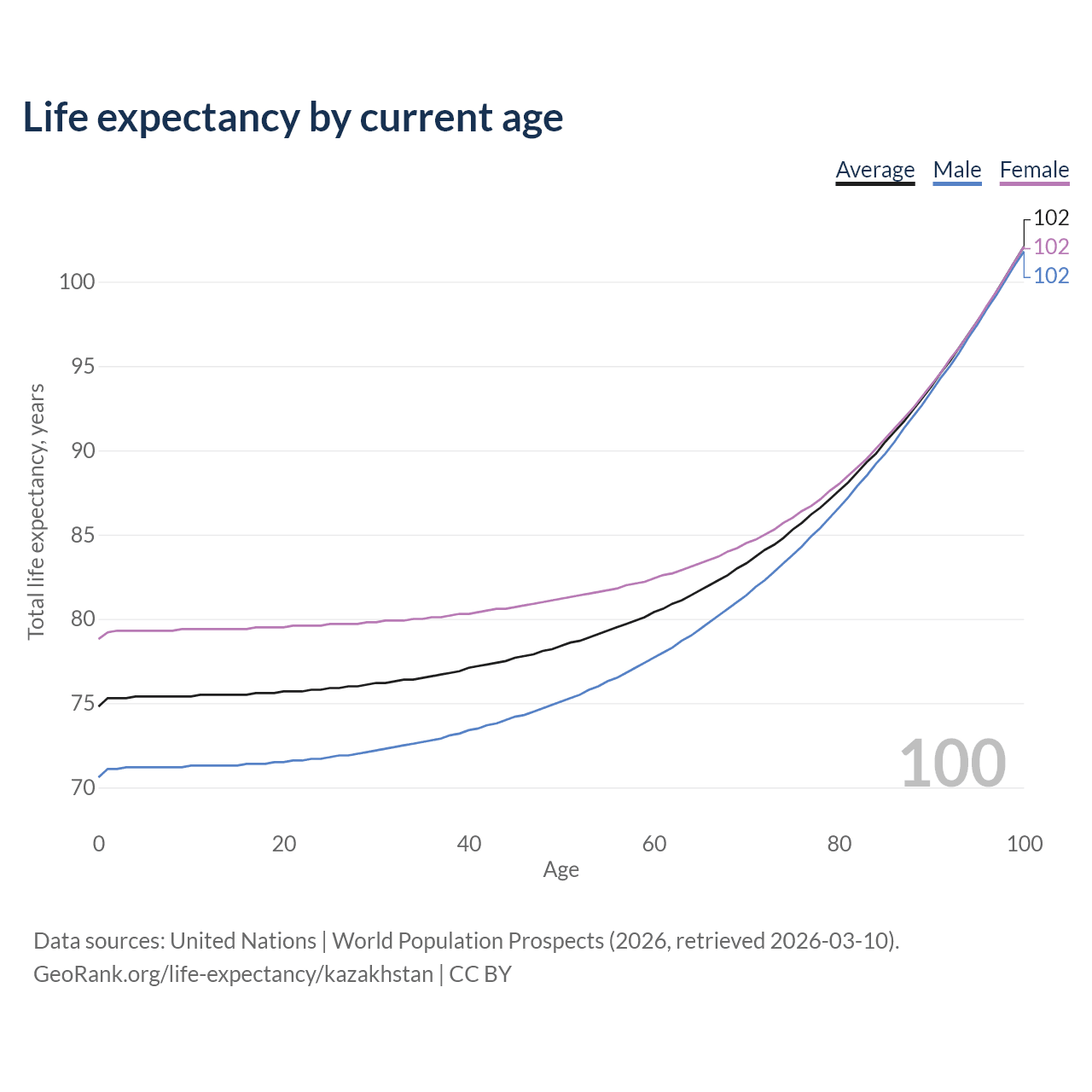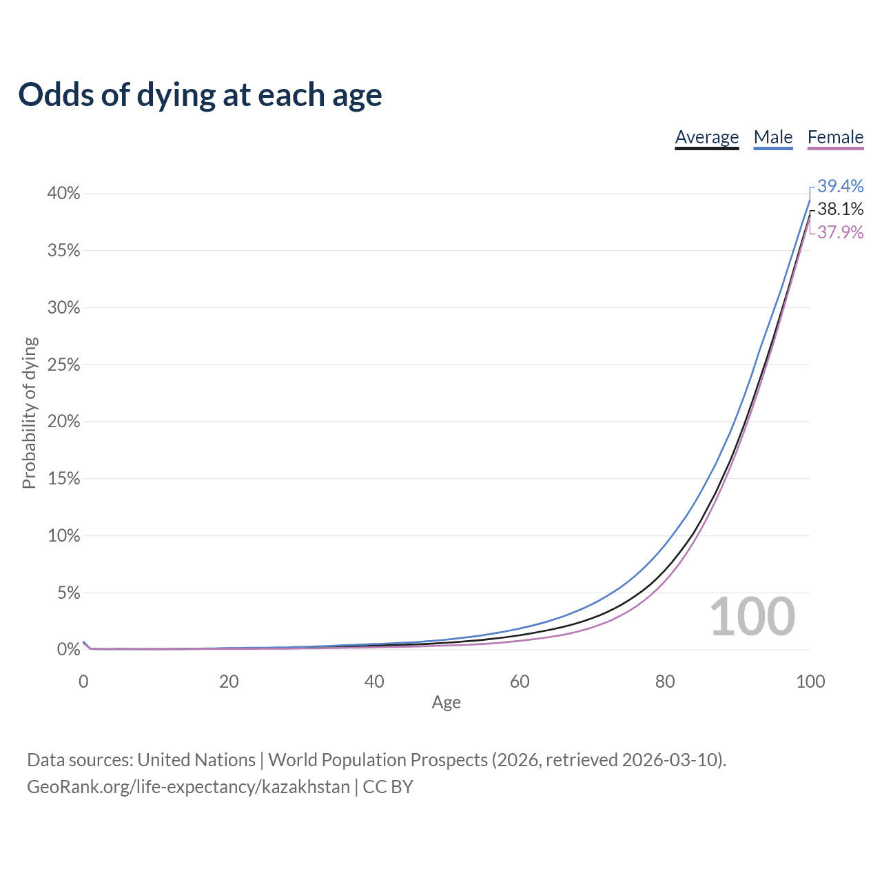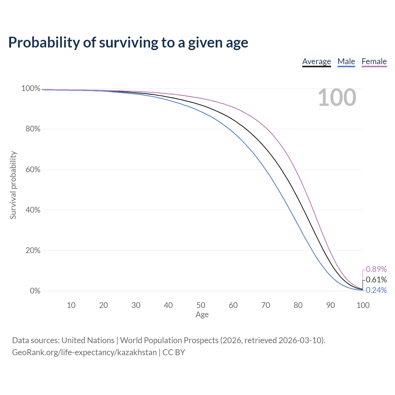 This life expectancy calculator shows the odds of living to 100, 95, 90, and below based on current age for both males and females in Kazakhstan, along with mean and median age of death. The calculations are based on the 2026 life tables (actuarial tables) from the UN World Population Prospects.