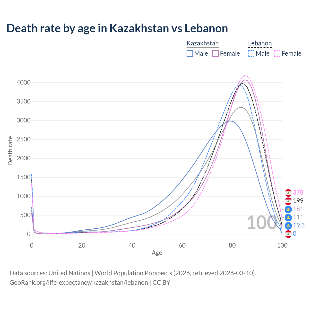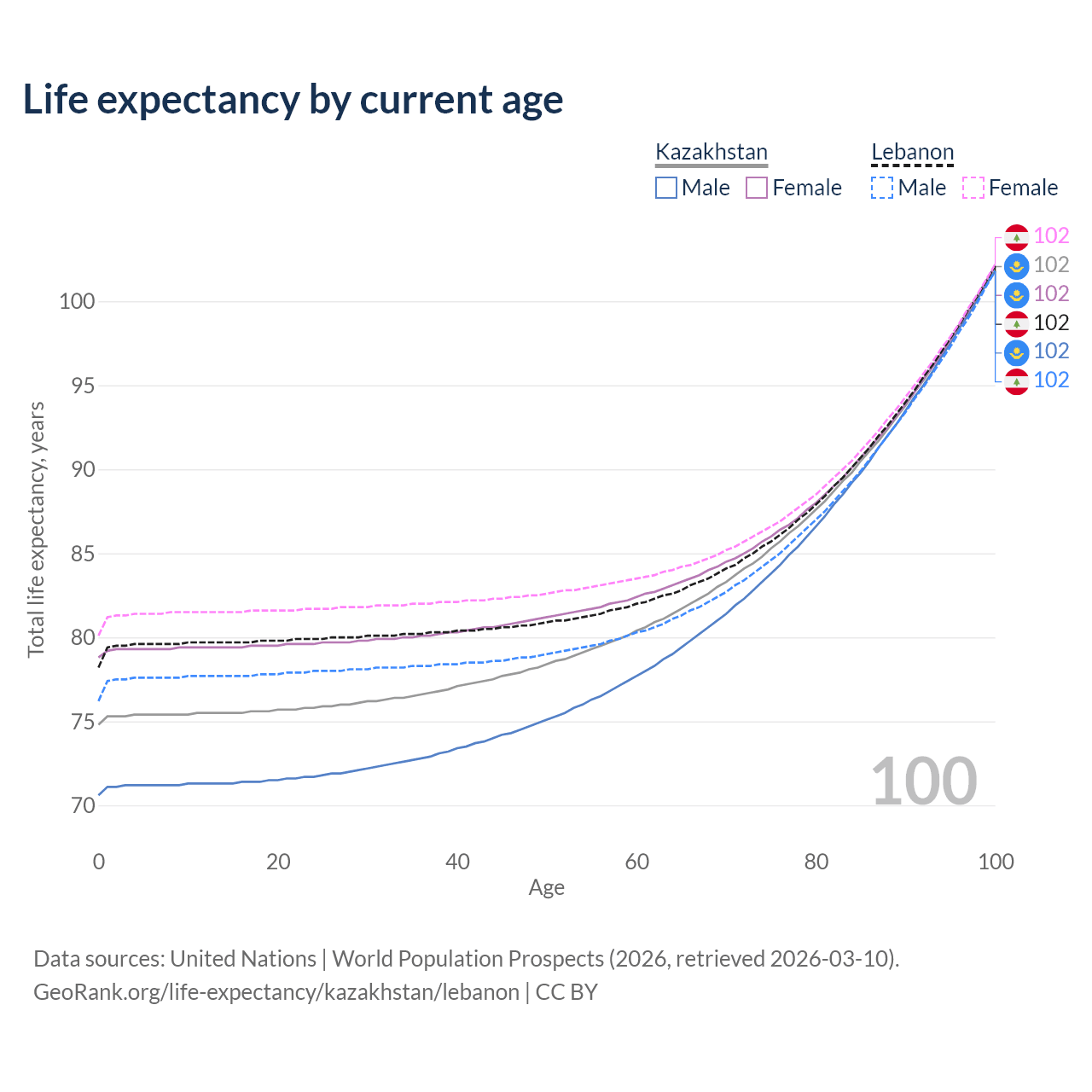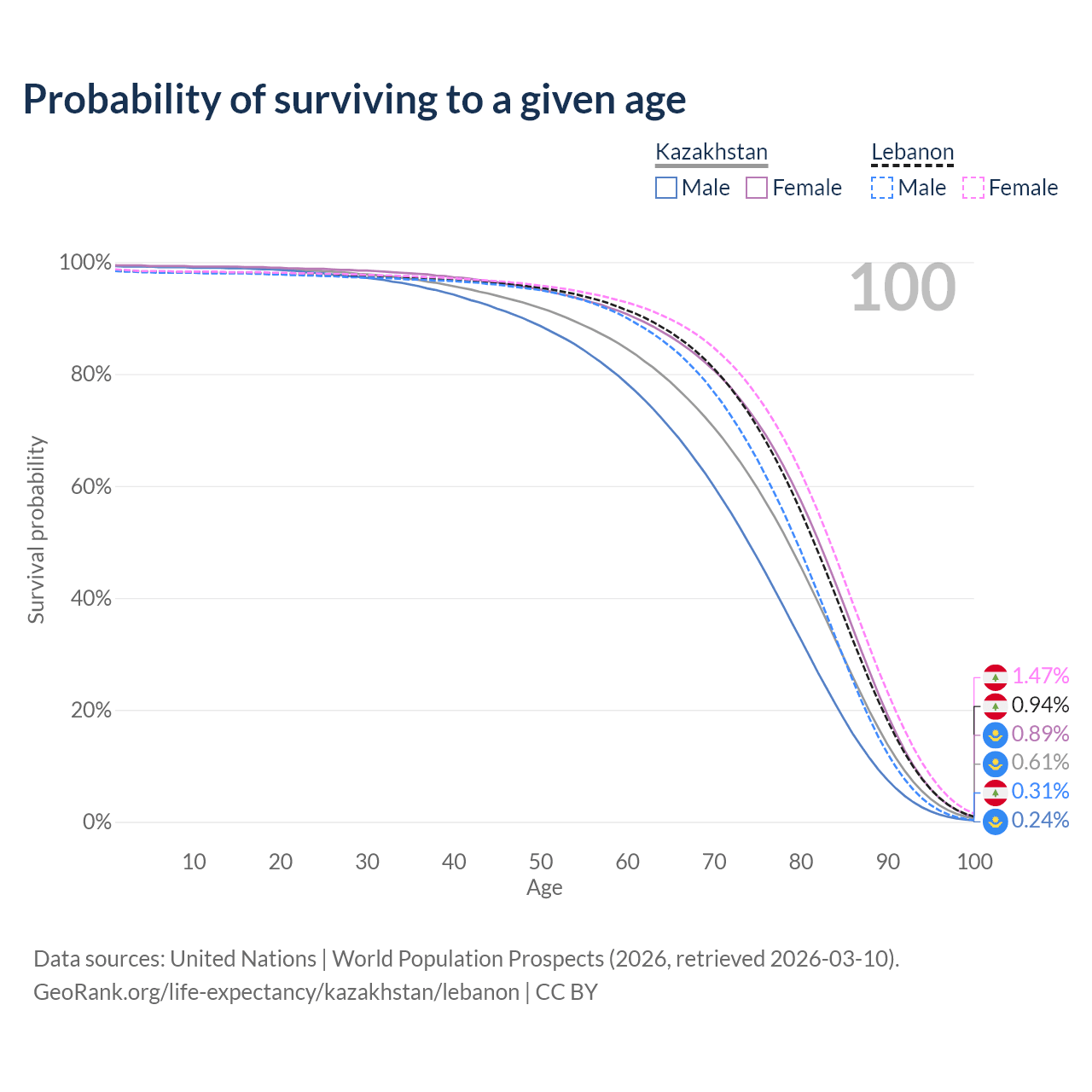 This life expectancy calculator shows the odds of living to 100, 95, 90, and below based on current age for both males and females in Kazakhstan and Lebanon, along with mean and median age of death. The calculations are based on the 2026 life tables (actuarial tables) from the UN World Population Prospects.