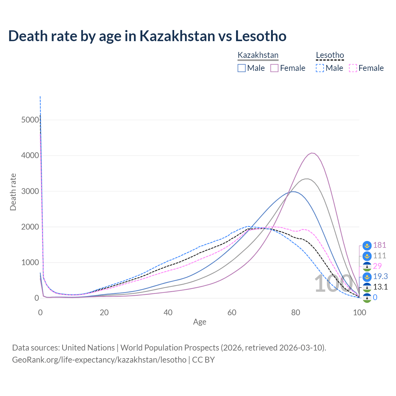 In Kazakhstan, the most common age of death is 84, compared to 0 in Lesotho. The median age of death is 78.6 in Kazakhstan and 63.4 in Lesotho, meaning only half of each cohort is expected to live past that age.