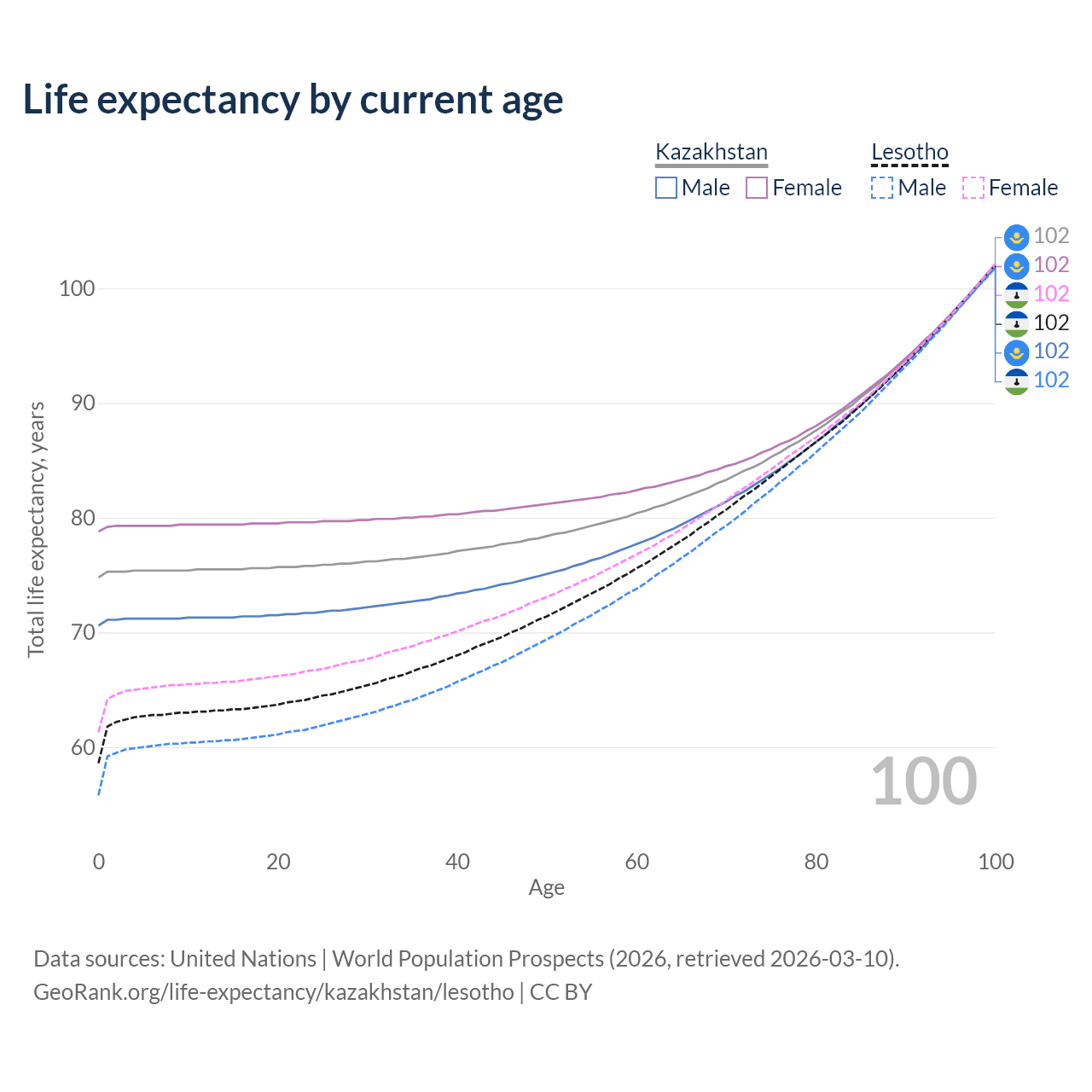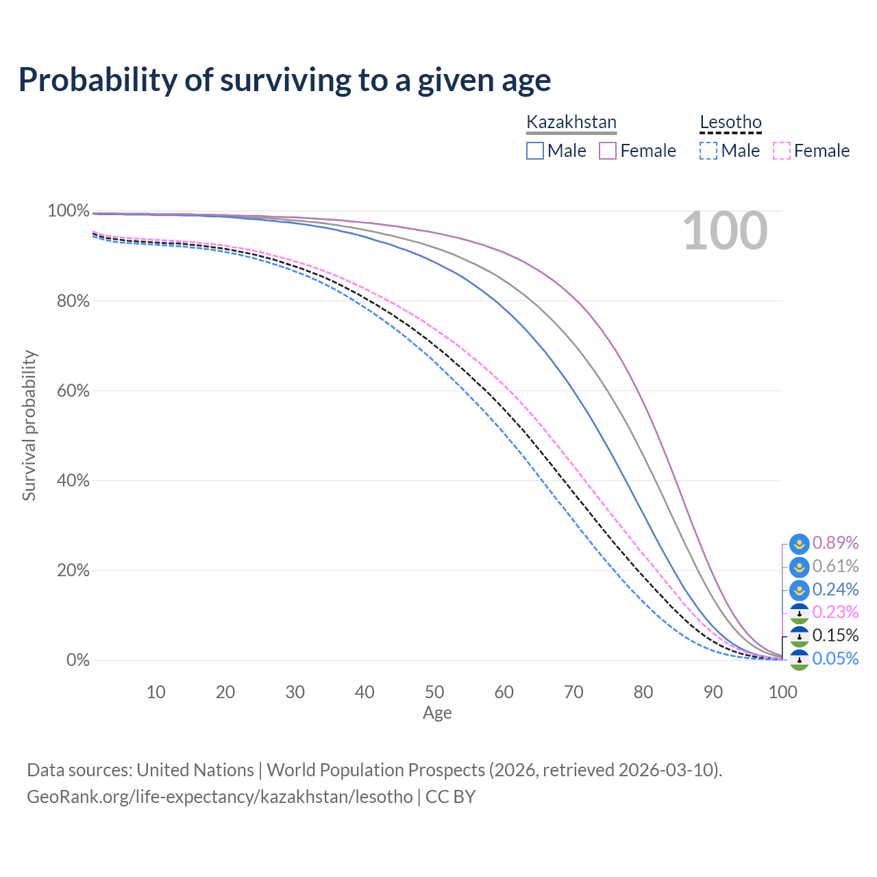 This life expectancy calculator shows the odds of living to 100, 95, 90, and below based on current age for both males and females in Kazakhstan and Lesotho, along with mean and median age of death. The calculations are based on the 2026 life tables (actuarial tables) from the UN World Population Prospects.