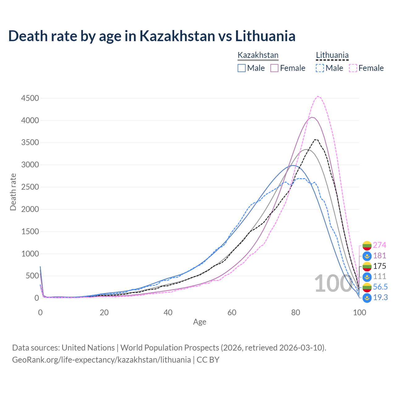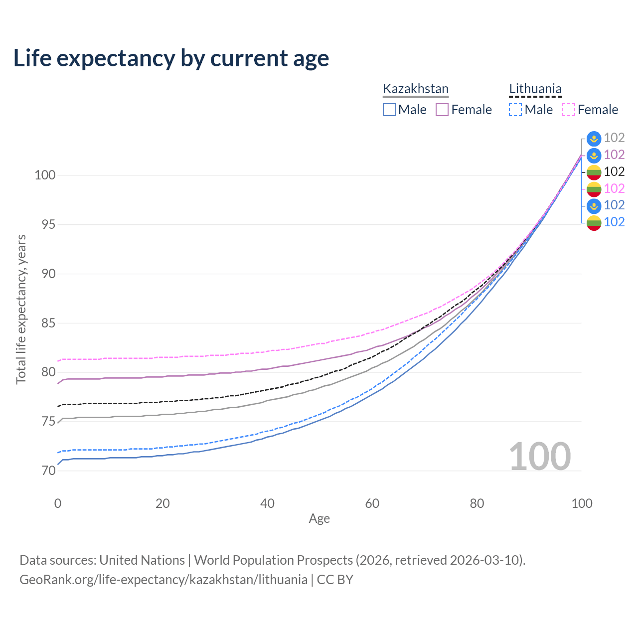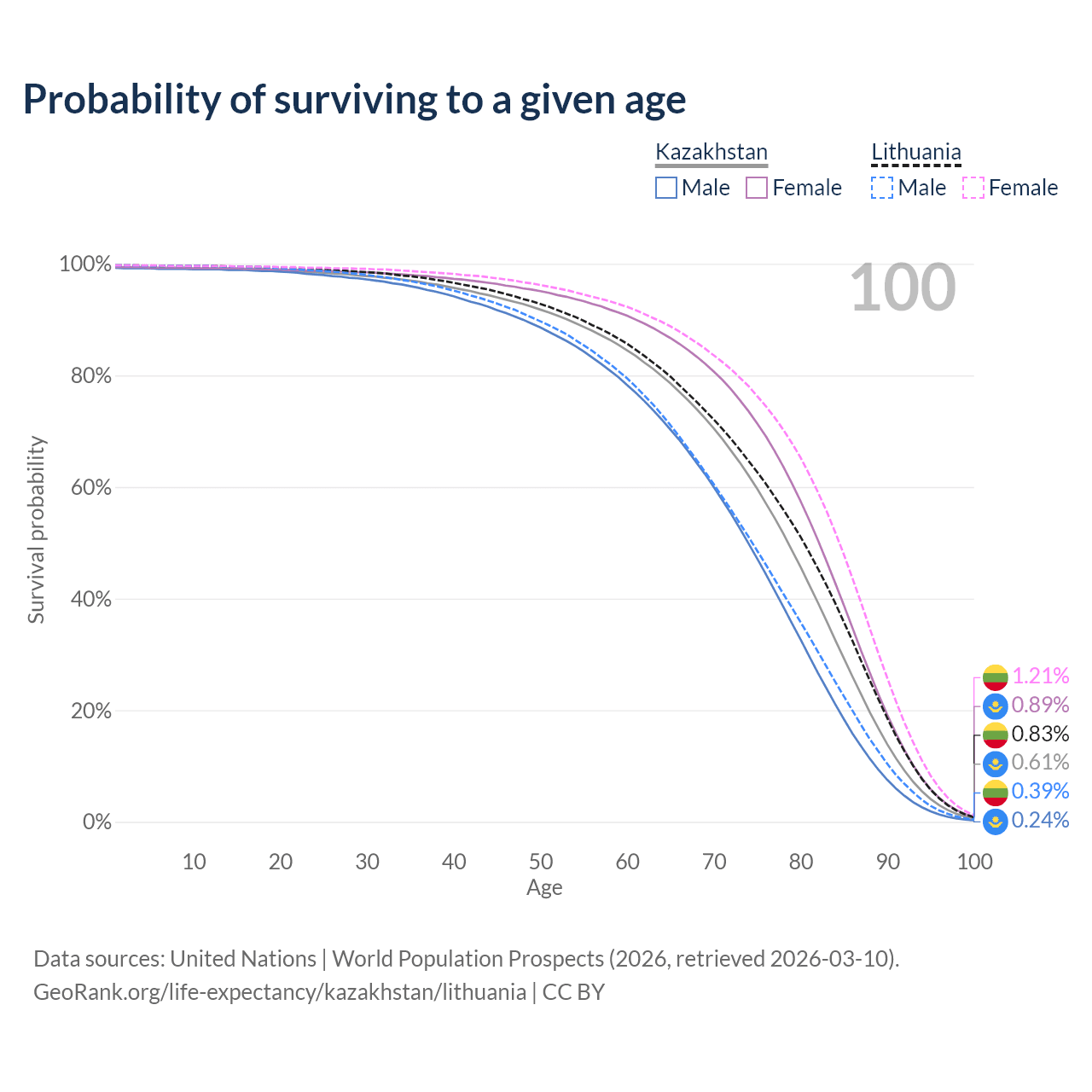This life expectancy calculator shows the odds of living to 100, 95, 90, and below based on current age for both males and females in Kazakhstan and Lithuania, along with mean and median age of death. The calculations are based on the 2026 life tables (actuarial tables) from the UN World Population Prospects.