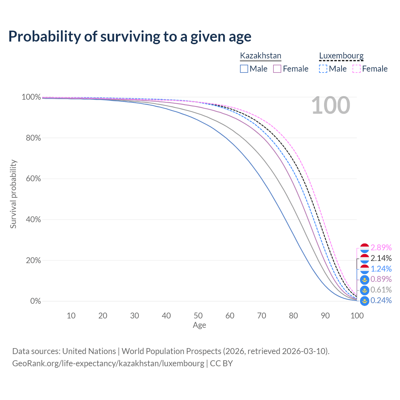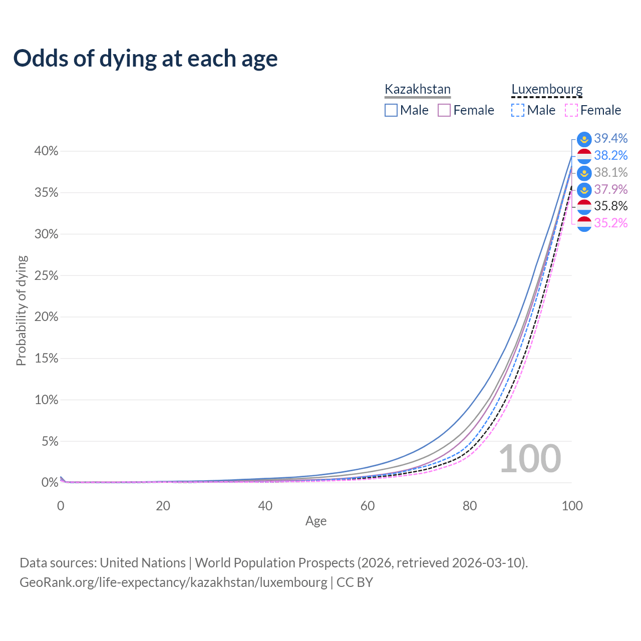 This life expectancy calculator shows the odds of living to 100, 95, 90, and below based on current age for both males and females in Kazakhstan and Luxembourg, along with mean and median age of death. The calculations are based on the 2026 life tables (actuarial tables) from the UN World Population Prospects.