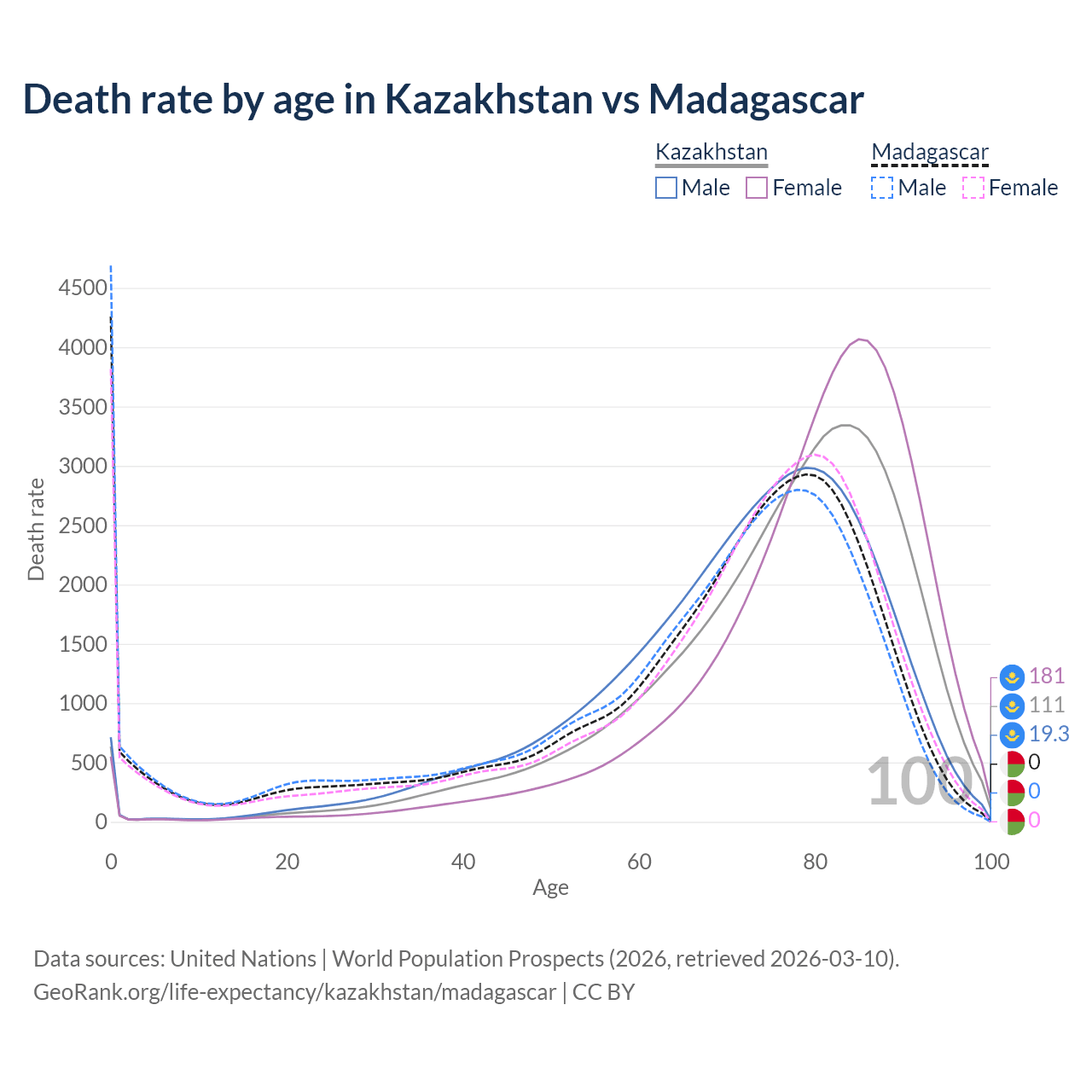 In Kazakhstan, the most common age of death is 84, compared to 0 in Madagascar. The median age of death is 78.6 in Kazakhstan and 72.2 in Madagascar, meaning only half of each cohort is expected to live past that age.