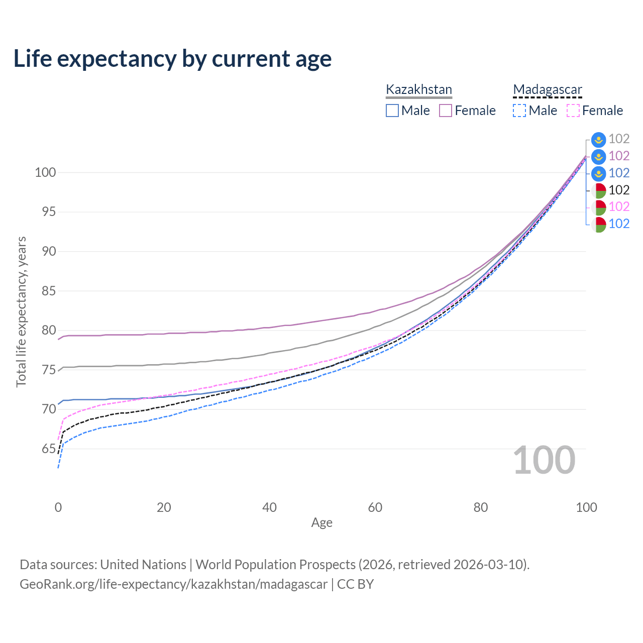 This life expectancy calculator shows the odds of living to 100, 95, 90, and below based on current age for both males and females in Kazakhstan and Madagascar, along with mean and median age of death. The calculations are based on the 2026 life tables (actuarial tables) from the UN World Population Prospects.