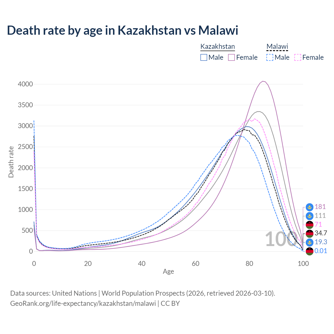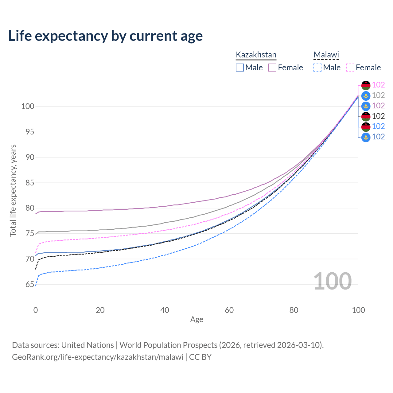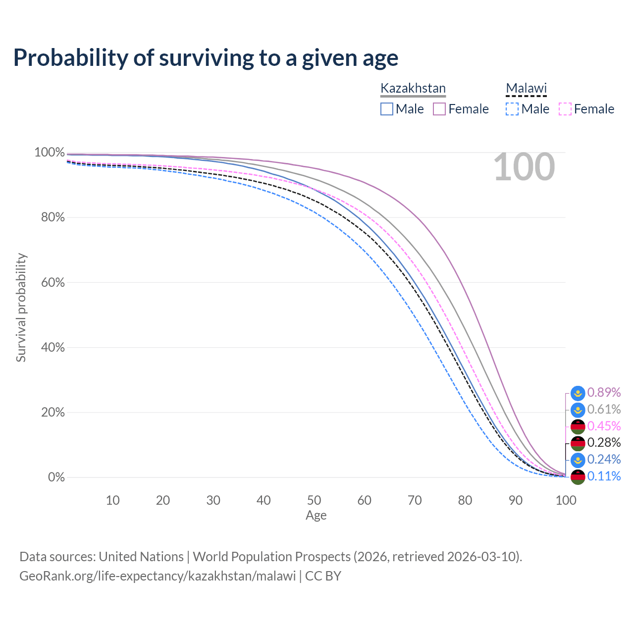 This life expectancy calculator shows the odds of living to 100, 95, 90, and below based on current age for both males and females in Kazakhstan and Malawi, along with mean and median age of death. The calculations are based on the 2026 life tables (actuarial tables) from the UN World Population Prospects.