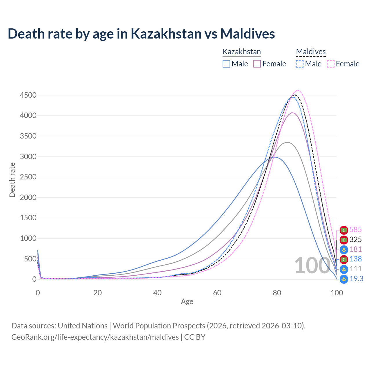 In Kazakhstan, the most common age of death is 84, compared to 86 in Maldives. The median age of death is 78.6 in Kazakhstan and 83.8 in Maldives, meaning only half of each cohort is expected to live past that age.
