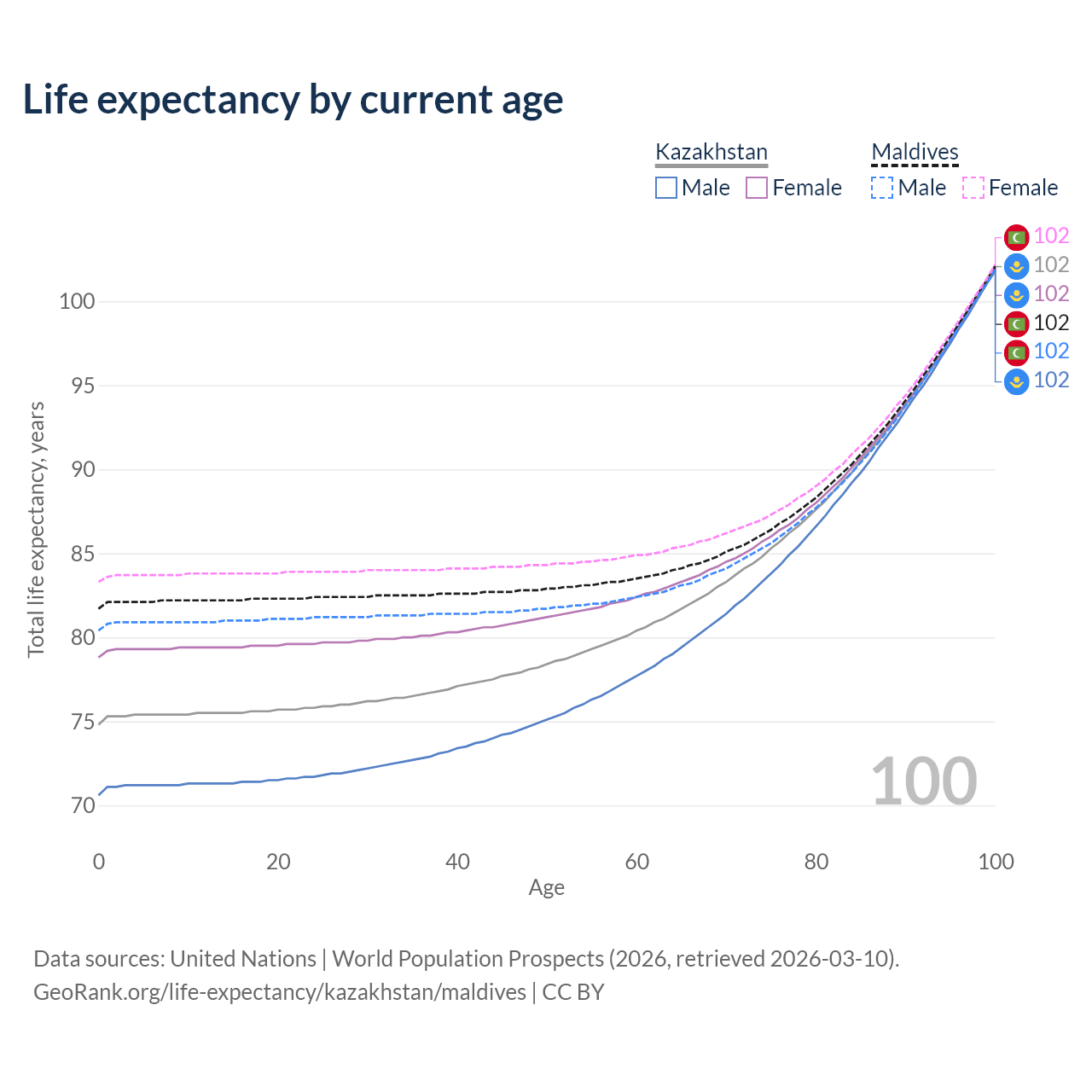 This life expectancy calculator shows the odds of living to 100, 95, 90, and below based on current age for both males and females in Kazakhstan and Maldives, along with mean and median age of death. The calculations are based on the 2026 life tables (actuarial tables) from the UN World Population Prospects.