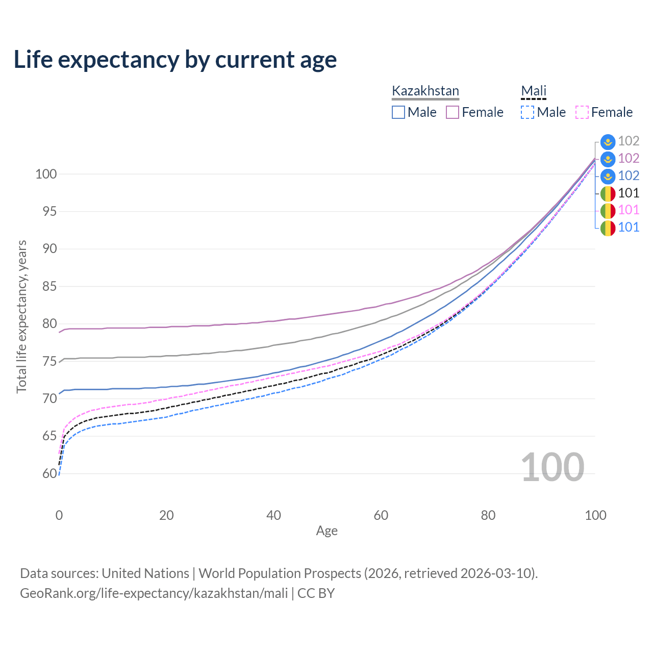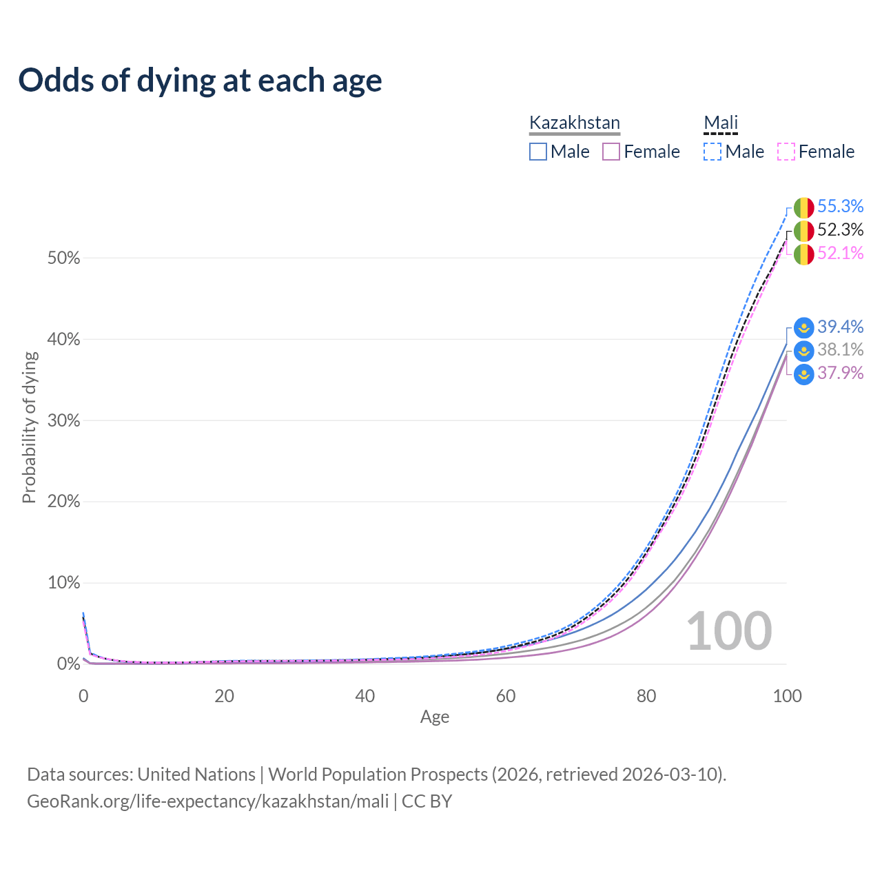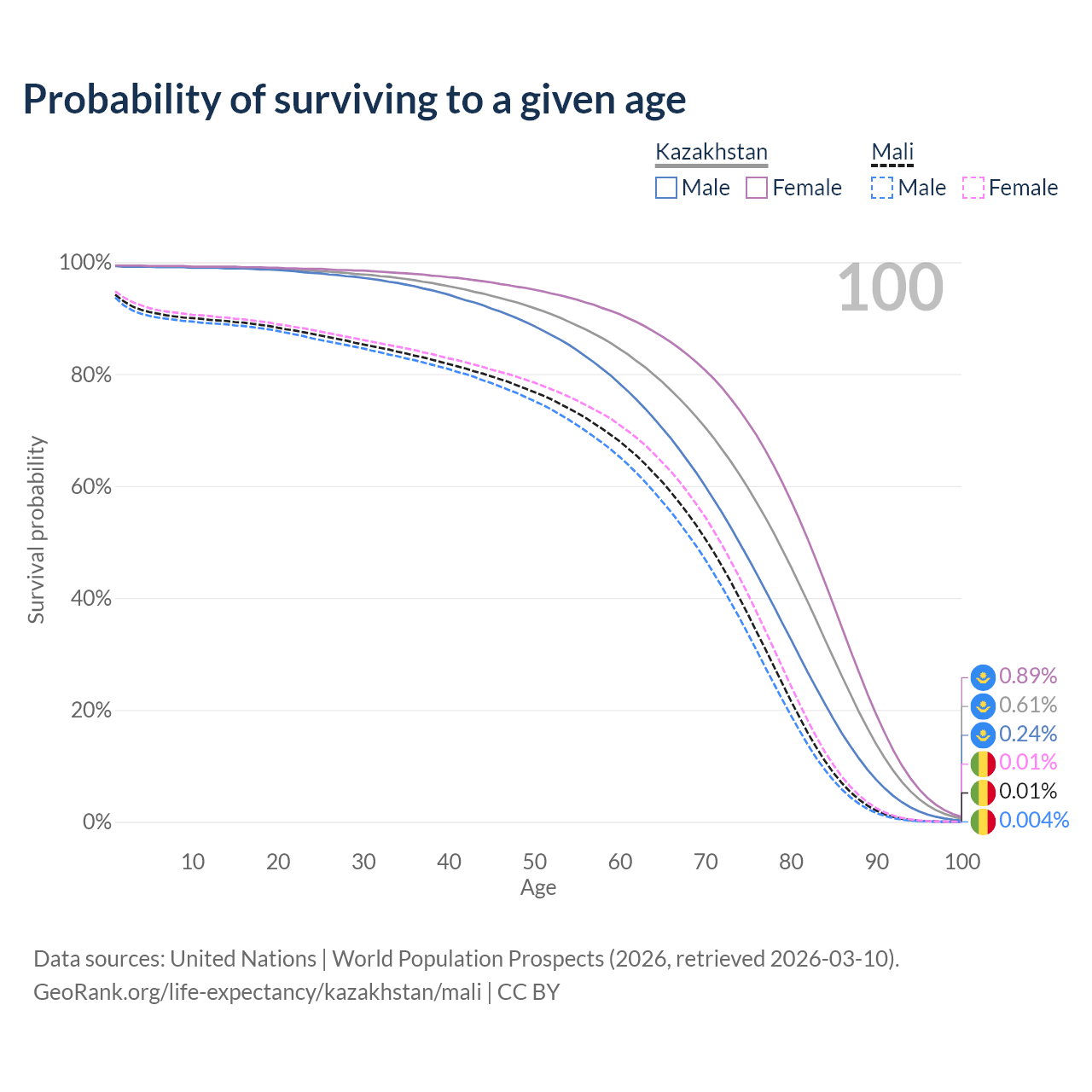 This life expectancy calculator shows the odds of living to 100, 95, 90, and below based on current age for both males and females in Kazakhstan and Mali, along with mean and median age of death. The calculations are based on the 2026 life tables (actuarial tables) from the UN World Population Prospects.