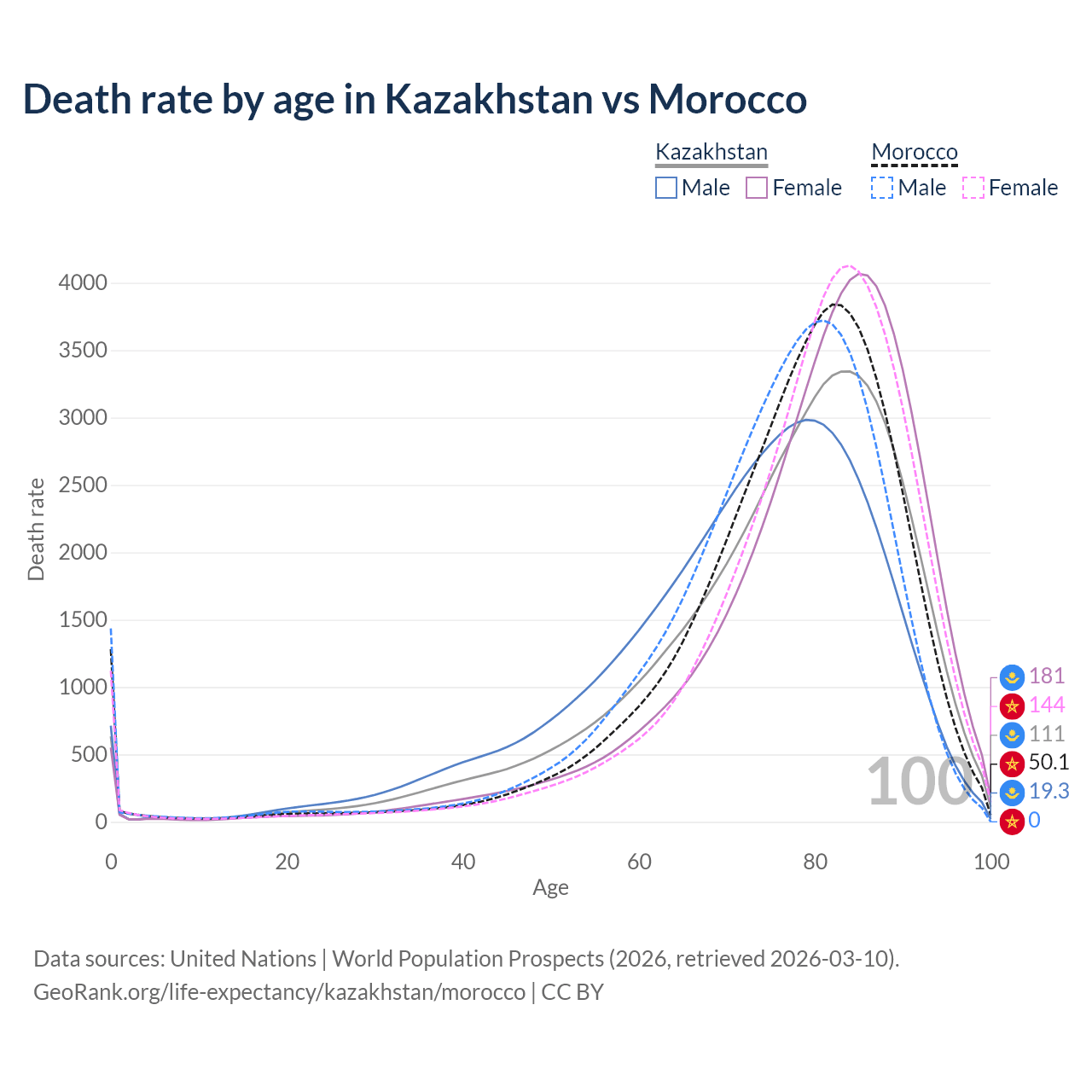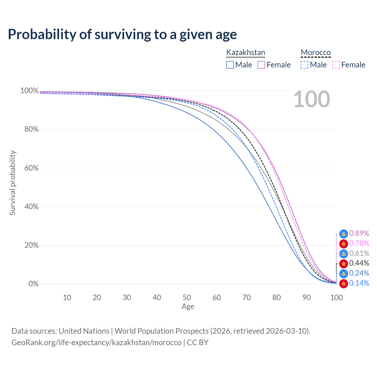 This life expectancy calculator shows the odds of living to 100, 95, 90, and below based on current age for both males and females in Kazakhstan and Morocco, along with mean and median age of death. The calculations are based on the 2026 life tables (actuarial tables) from the UN World Population Prospects.