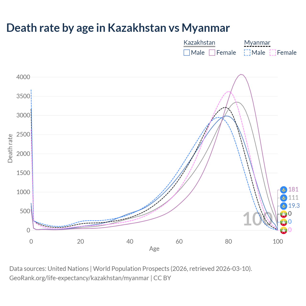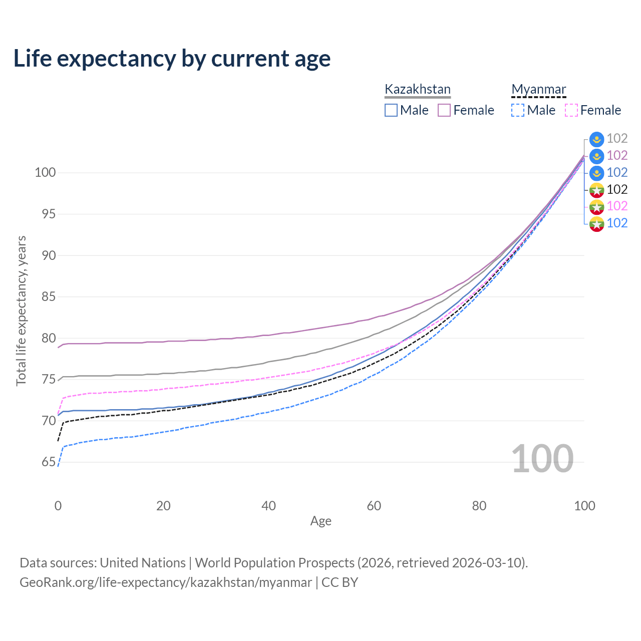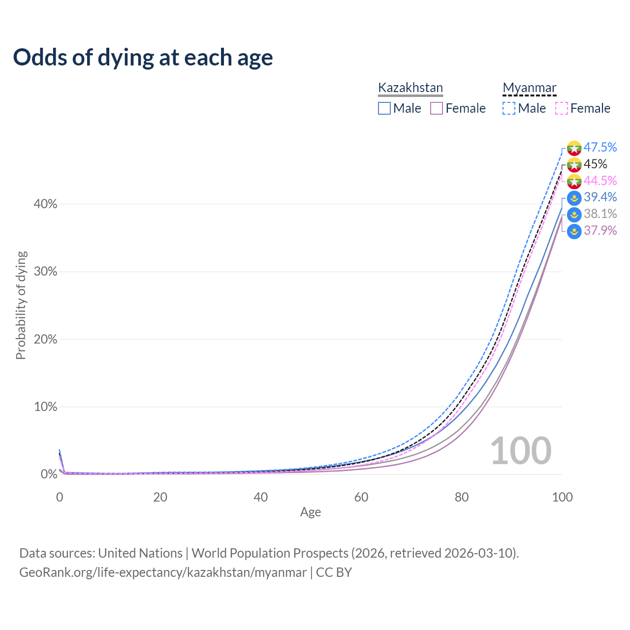 This life expectancy calculator shows the odds of living to 100, 95, 90, and below based on current age for both males and females in Kazakhstan and Myanmar, along with mean and median age of death. The calculations are based on the 2026 life tables (actuarial tables) from the UN World Population Prospects.